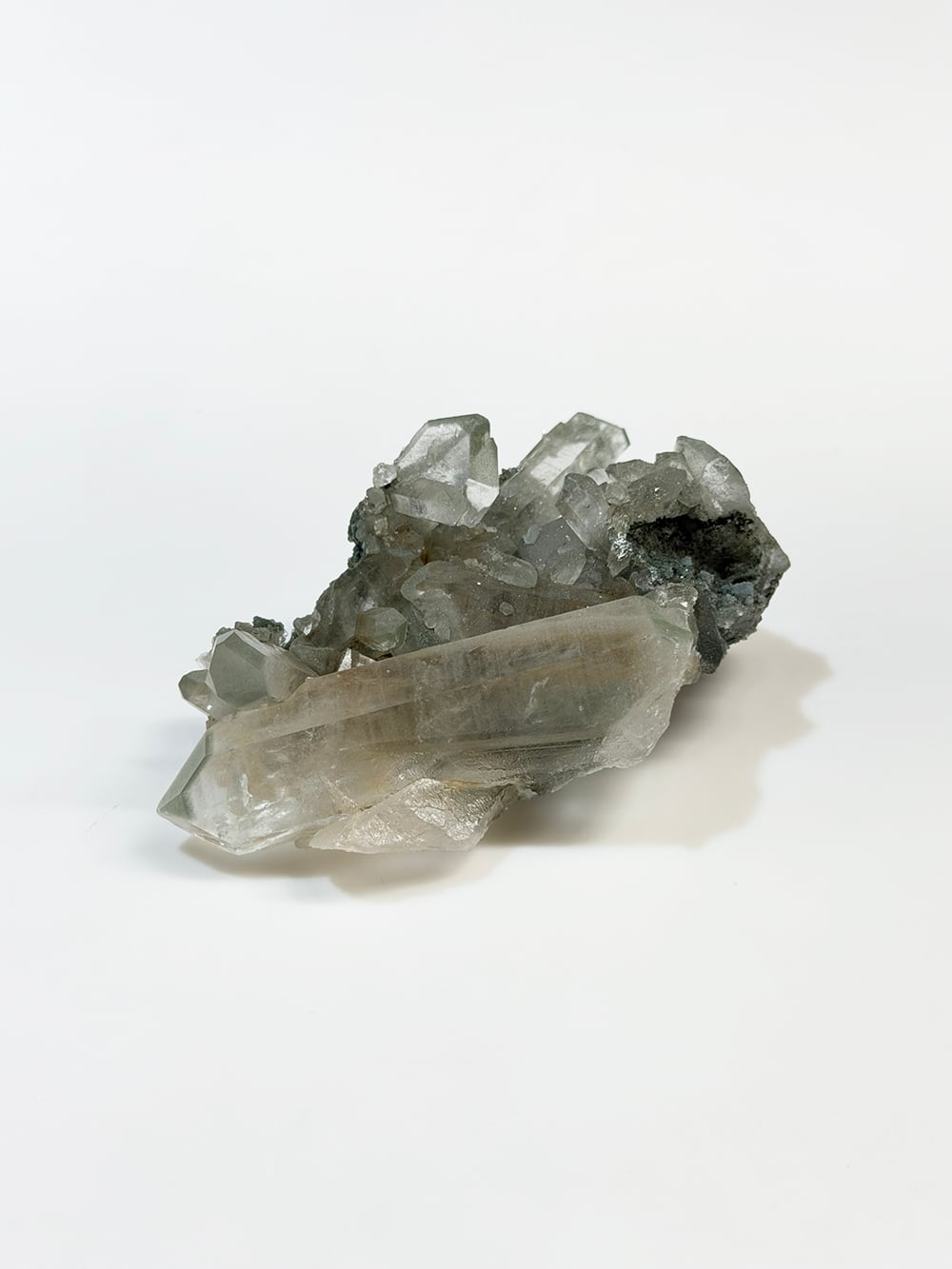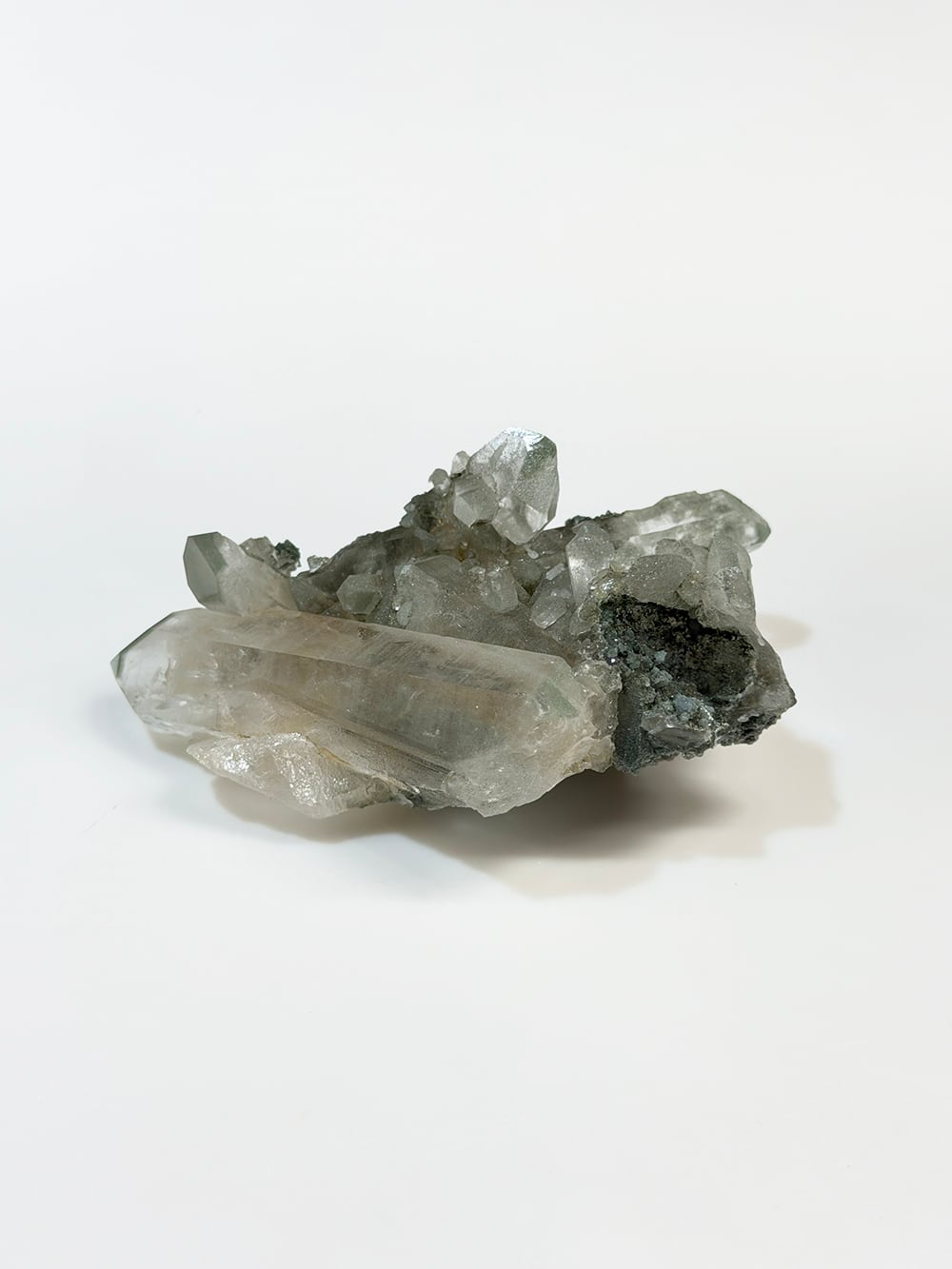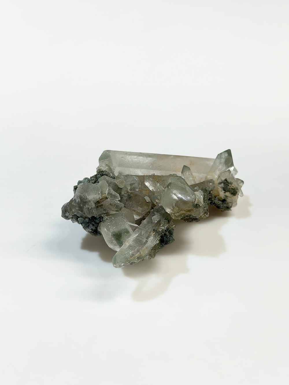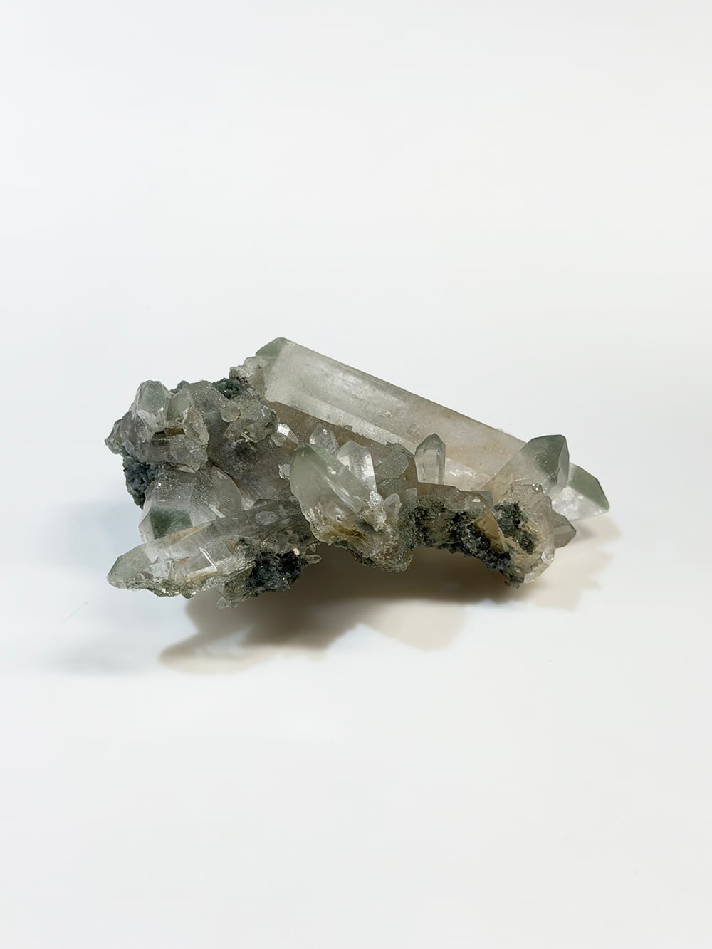とても美しいシルエットのクォーツクラスター。色々な角度から生成のされたクォーツがとてもいい表情を作り出しています。全体的に少しマットな印象ですが、表面を薄くクローライトに包まれており、光の当て方で素晴らしい輝きを見せてくれます。置いておくだけでとても絵になる一点です。