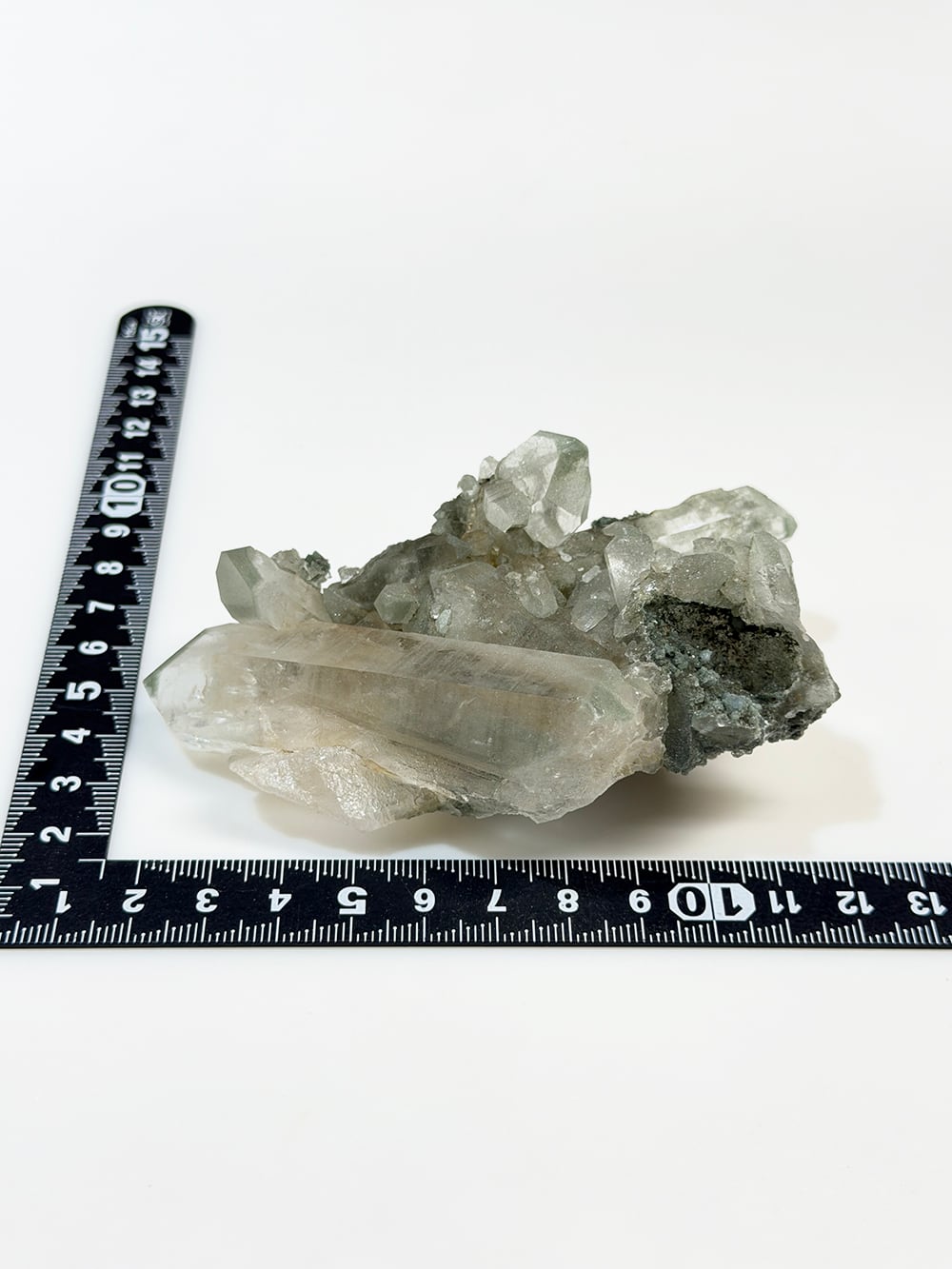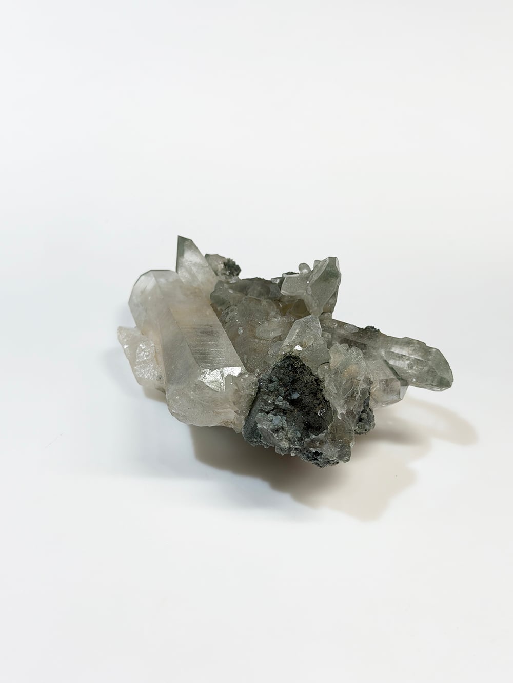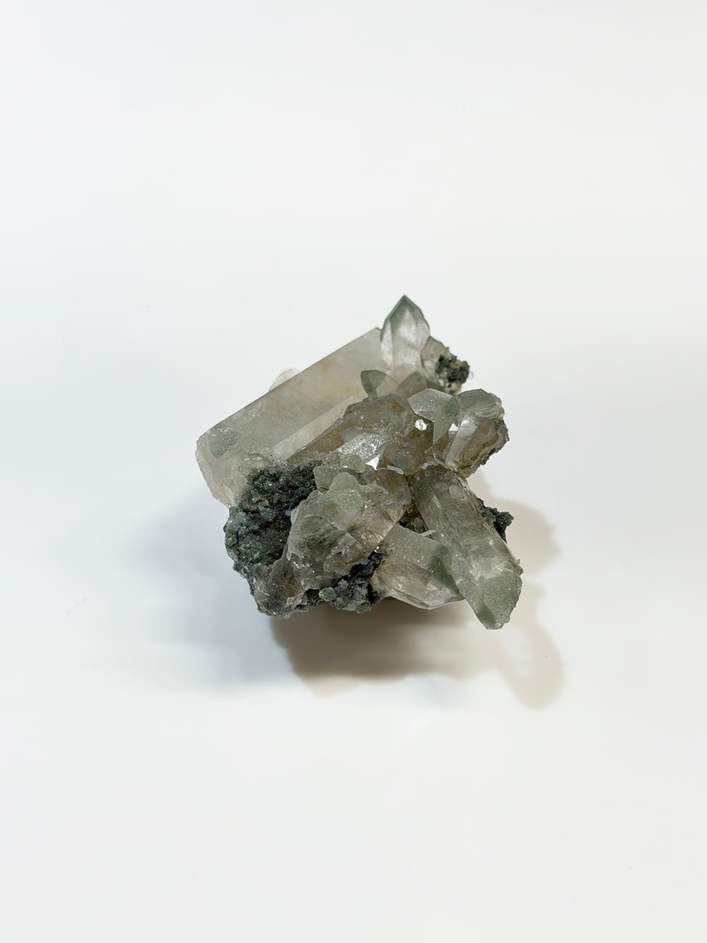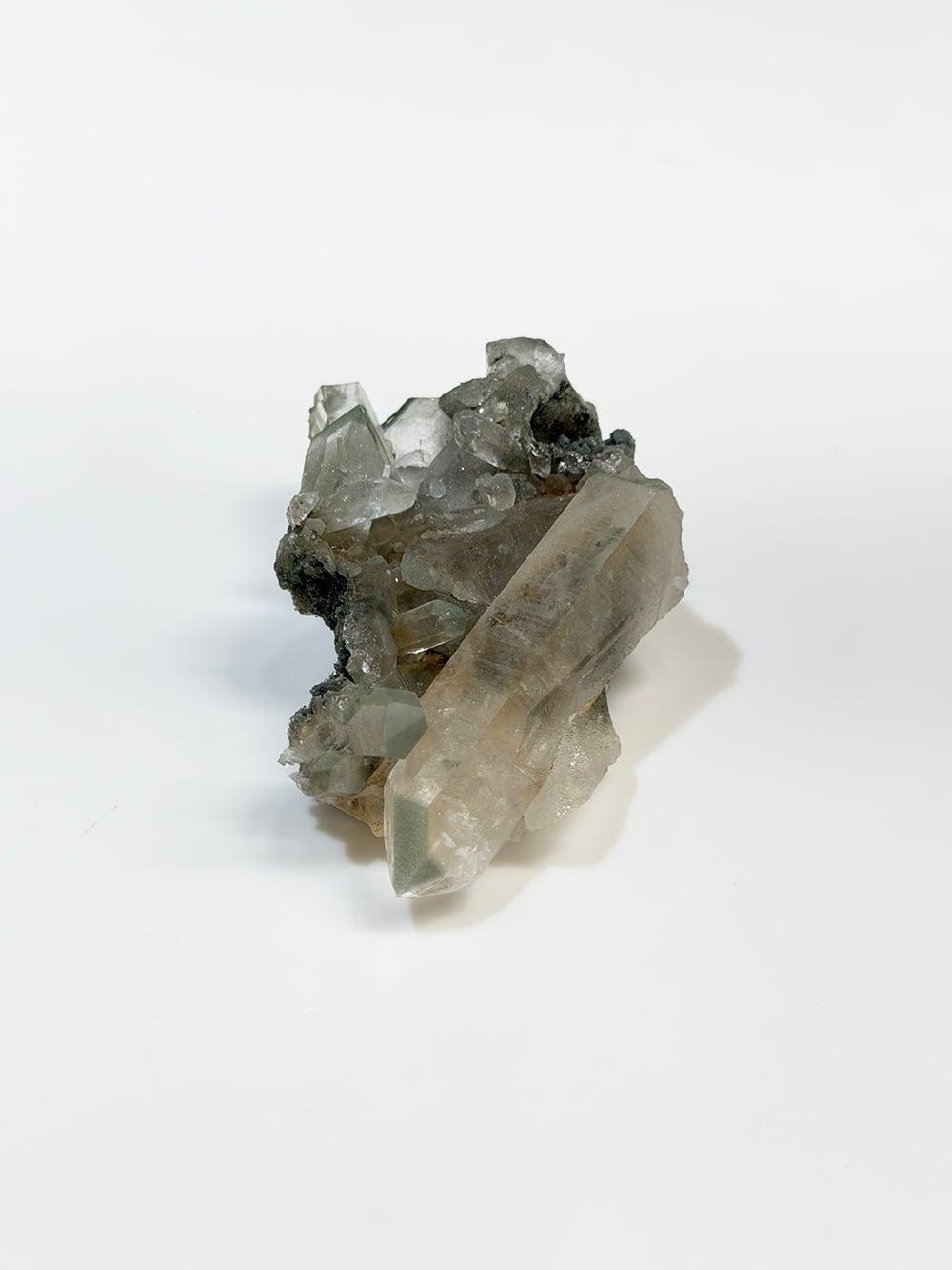 とても美しいシルエットのクォーツクラスター。色々な角度から生成のされたクォーツがとてもいい表情を作り出しています。全体的に少しマットな印象ですが、表面を薄くクローライトに包まれており、光の当て方で素晴らしい輝きを見せてくれます。置いておくだけでとても絵になる一点です。