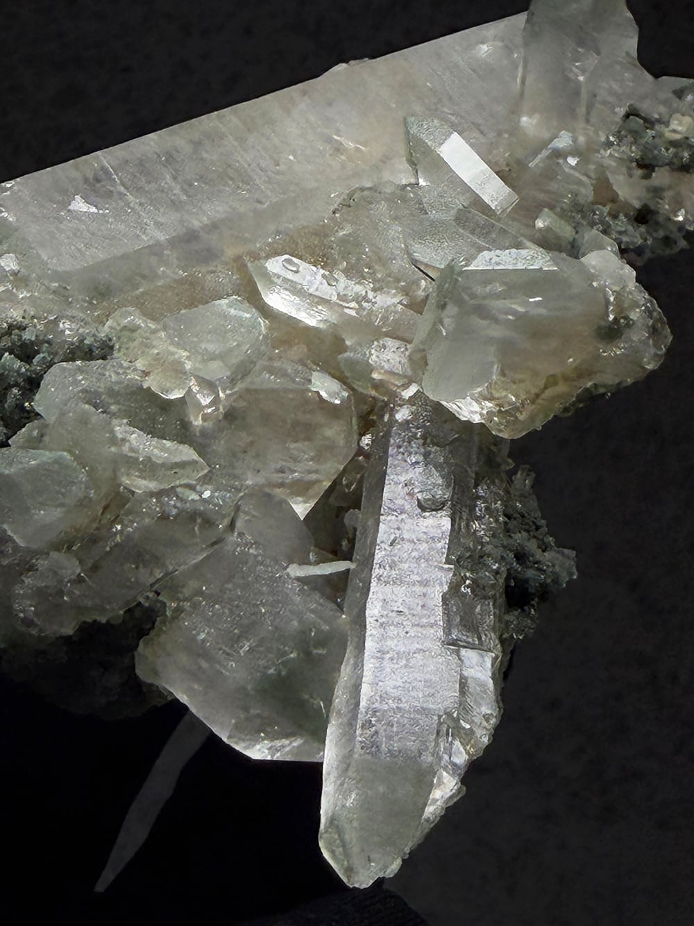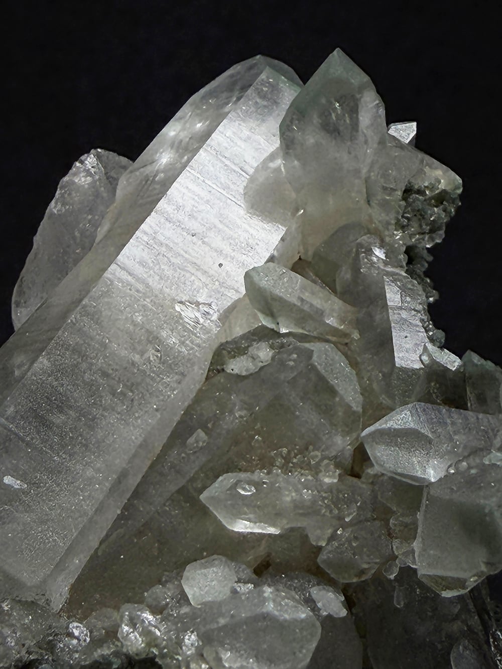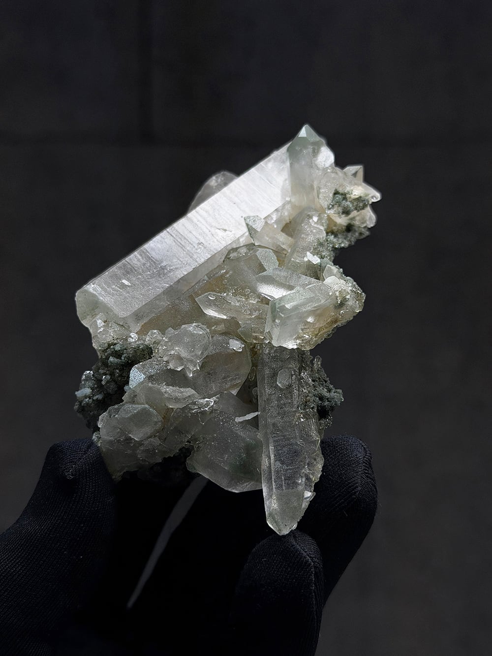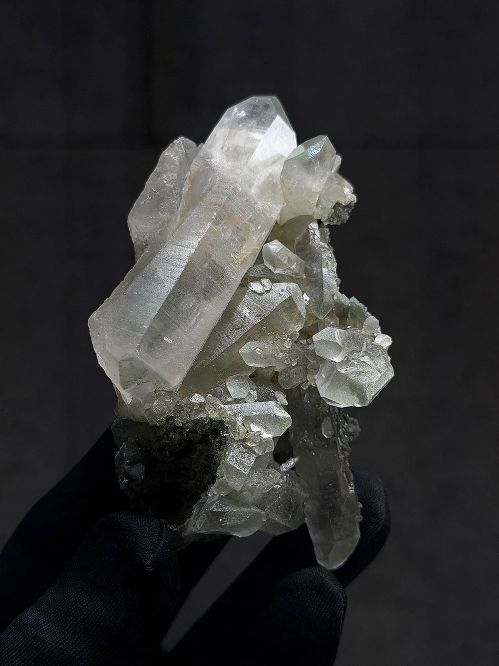 とても美しいシルエットのクォーツクラスター。色々な角度から生成のされたクォーツがとてもいい表情を作り出しています。全体的に少しマットな印象ですが、表面を薄くクローライトに包まれており、光の当て方で素晴らしい輝きを見せてくれます。置いておくだけでとても絵になる一点です。