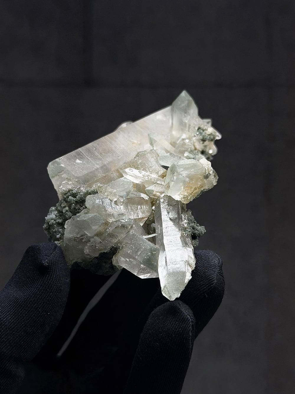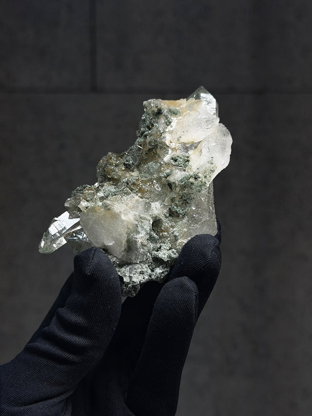 インドのガルサ渓谷、標高5400mのクル地方の奥にあるマニハール。産出されるヒマラヤ水晶は、水晶の中でもトップクラスの品質とされており、透明度と光沢が特に美しいことでも知られます。特徴として共生しているクローライト(緑泥石)は、このマニハールではモスグリーンの色をしており、透明度と相まってより美しさを増しています。2022年頃にマニハールでの採掘が政府の厳しい監視下に置かれるようになり、流通量が激減しているそうです。価格の高騰も続いており、採掘が再開されるかも不明で、今後は入手困難になる可能性も高くなっております。