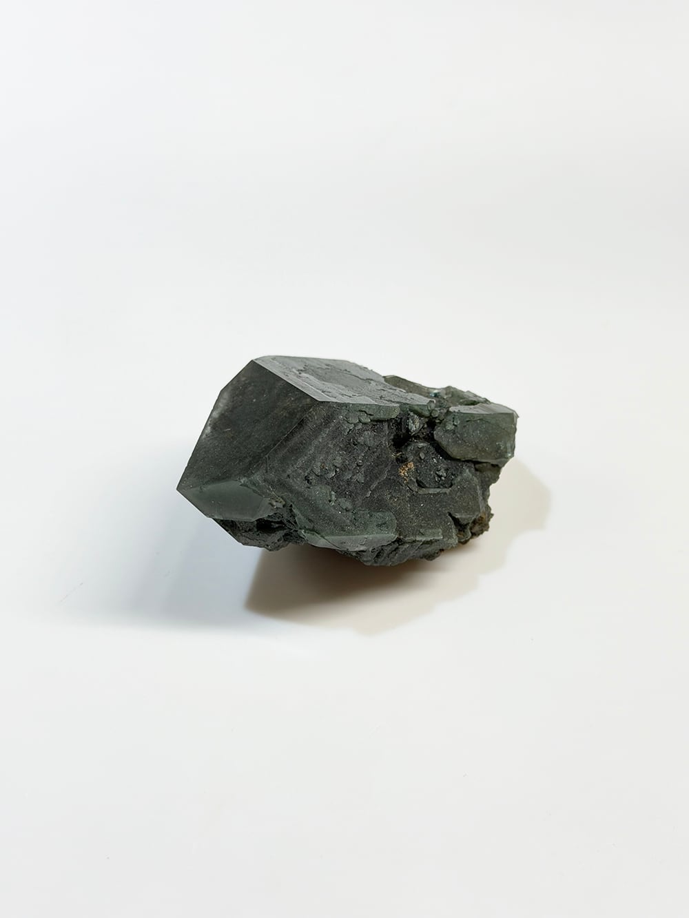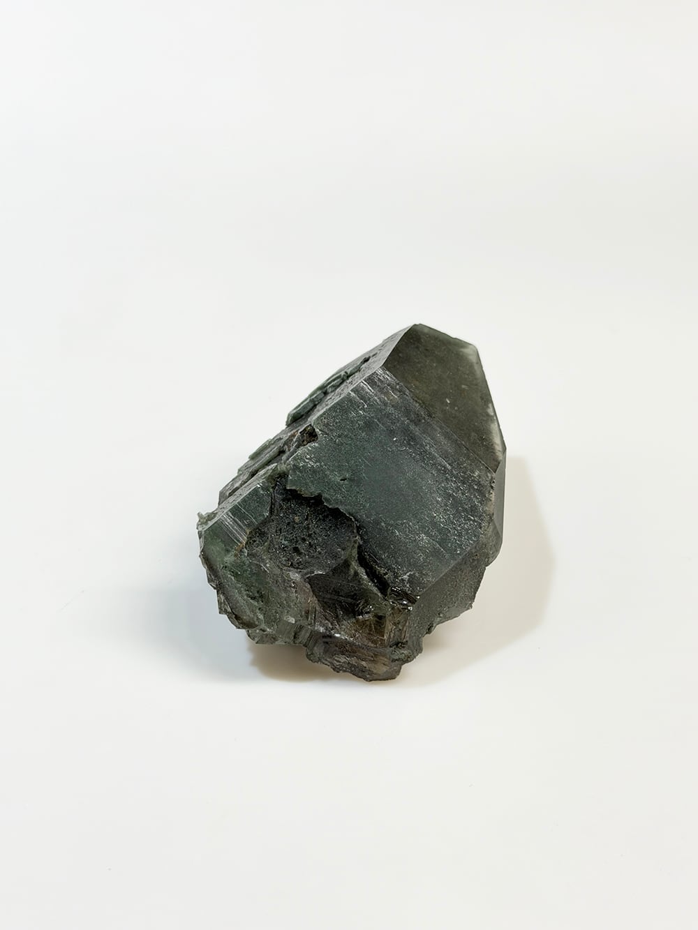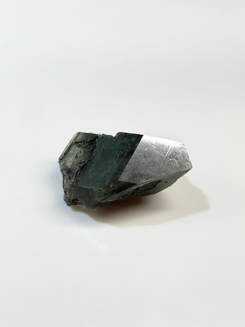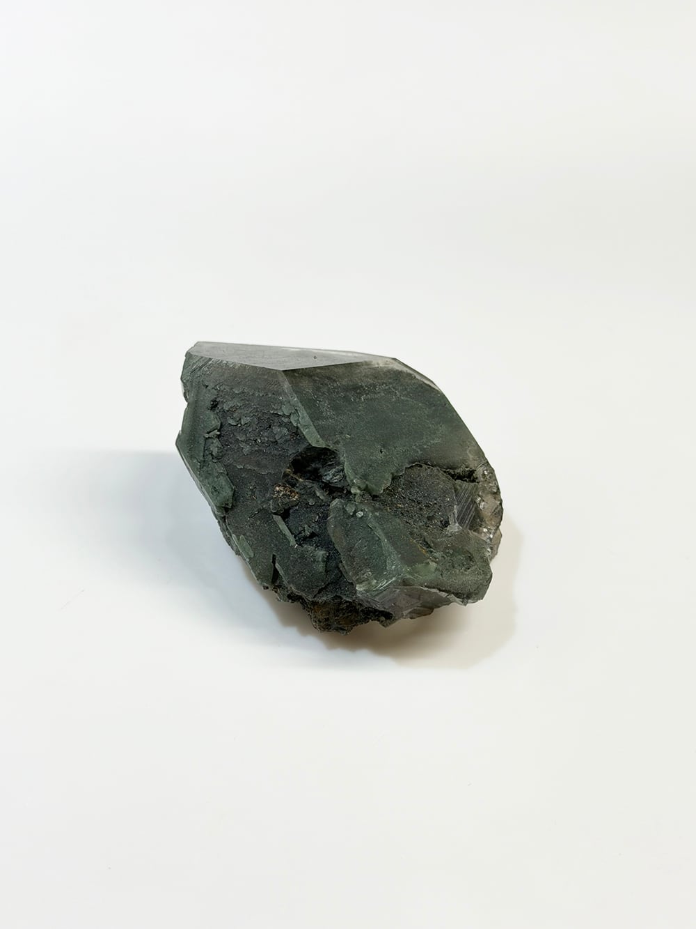 クローライトの美しいグリーンを全体に帯びたクォーツ。幾何学的な表情の面があったり、ファントムの層が見える面があったり、クローライトに侵食されている面があったりと、どの角度から見ても素晴らしい表情を持っている一点。