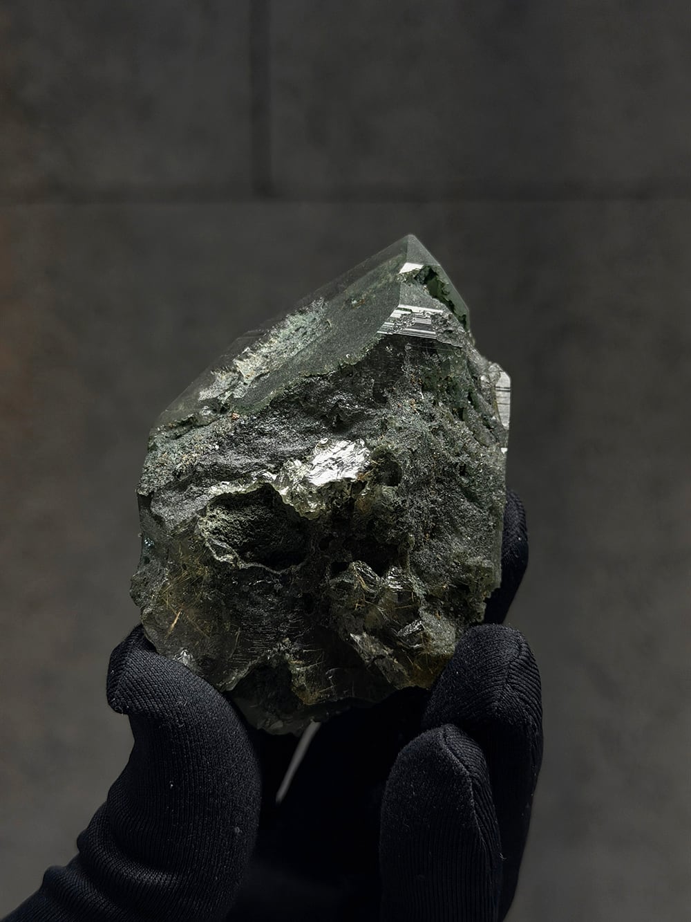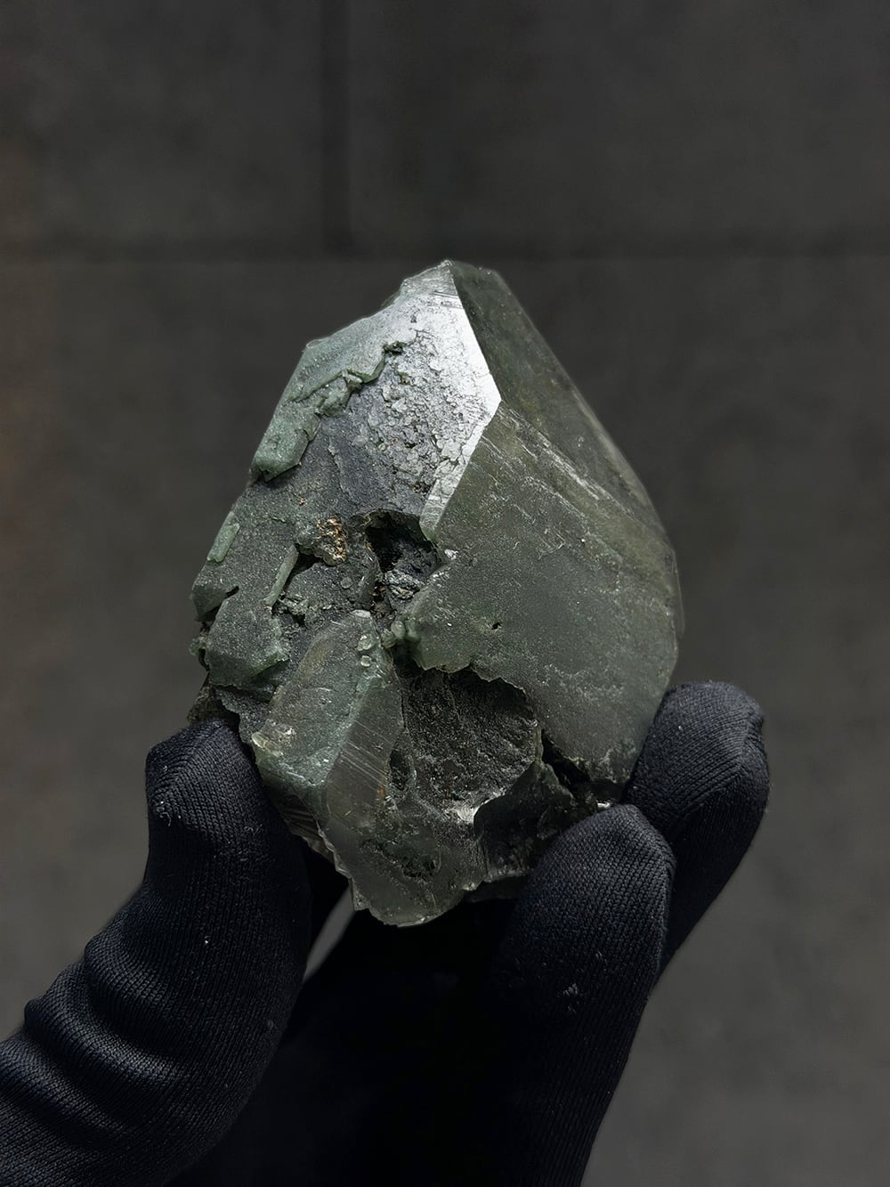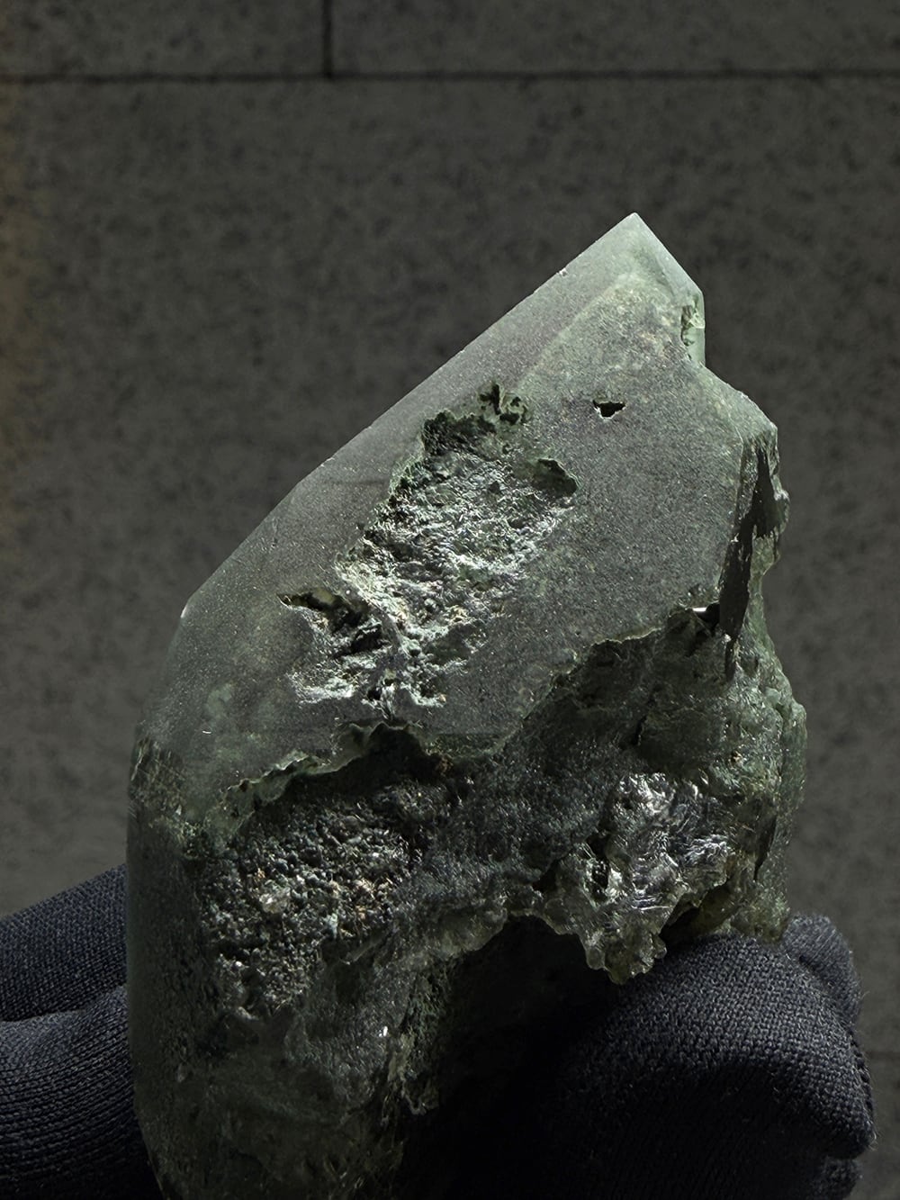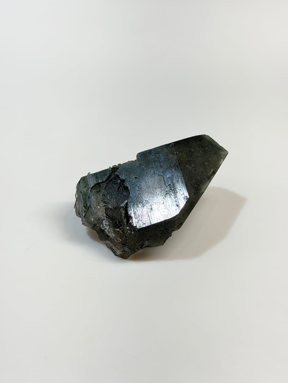 クローライトの美しいグリーンを全体に帯びたクォーツ。幾何学的な表情の面があったり、ファントムの層が見える面があったり、クローライトに侵食されている面があったりと、どの角度から見ても素晴らしい表情を持っている一点。