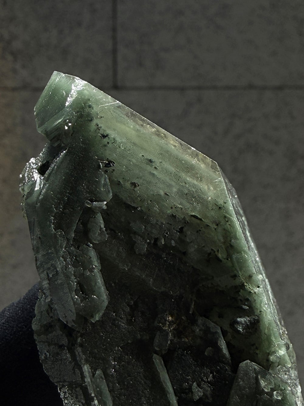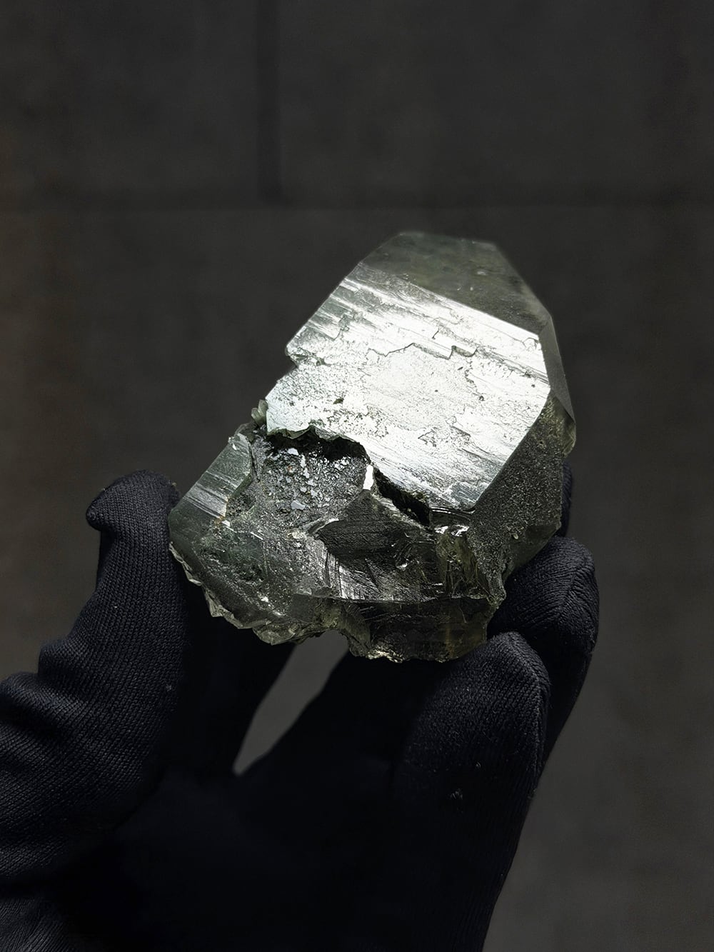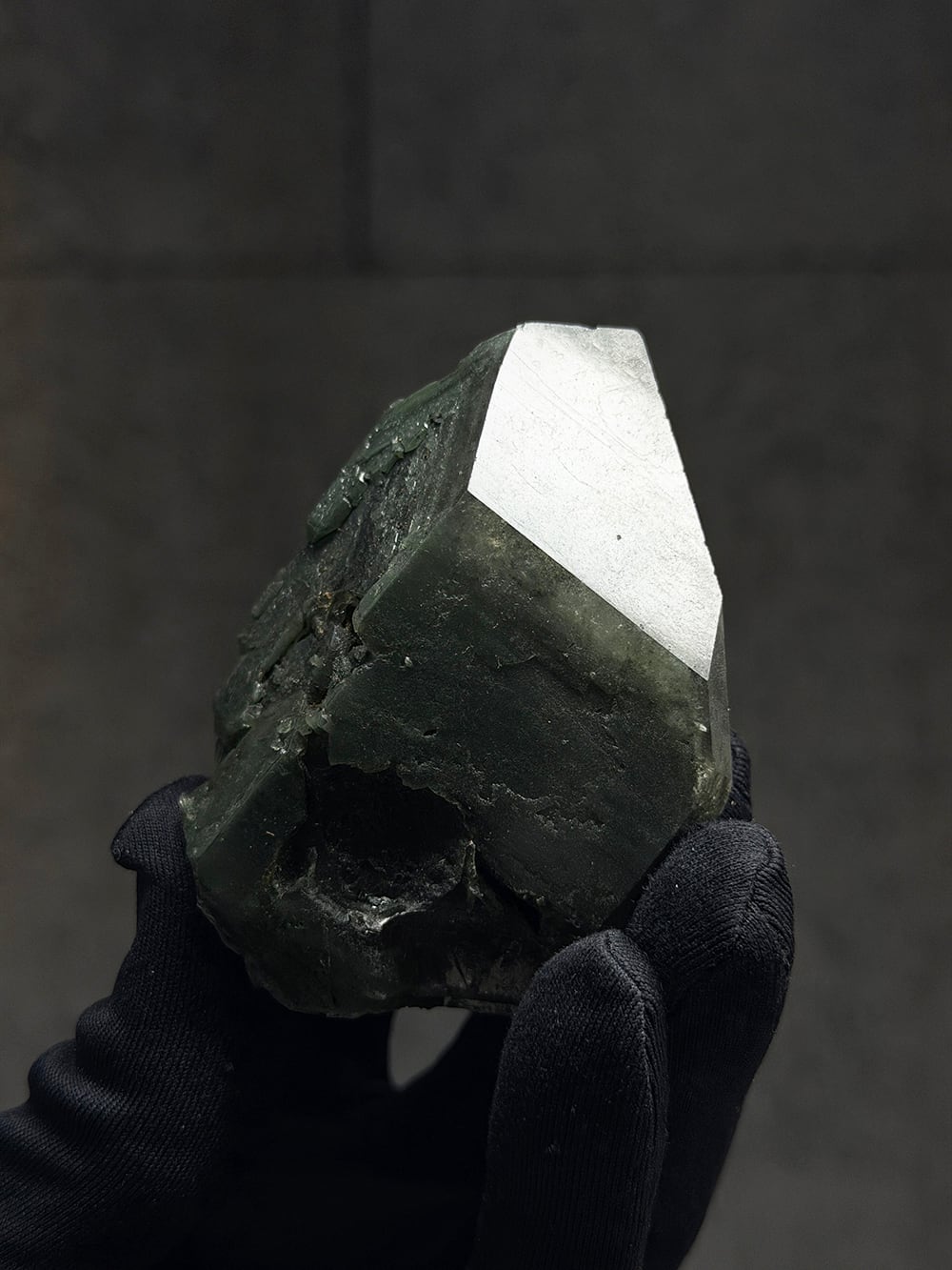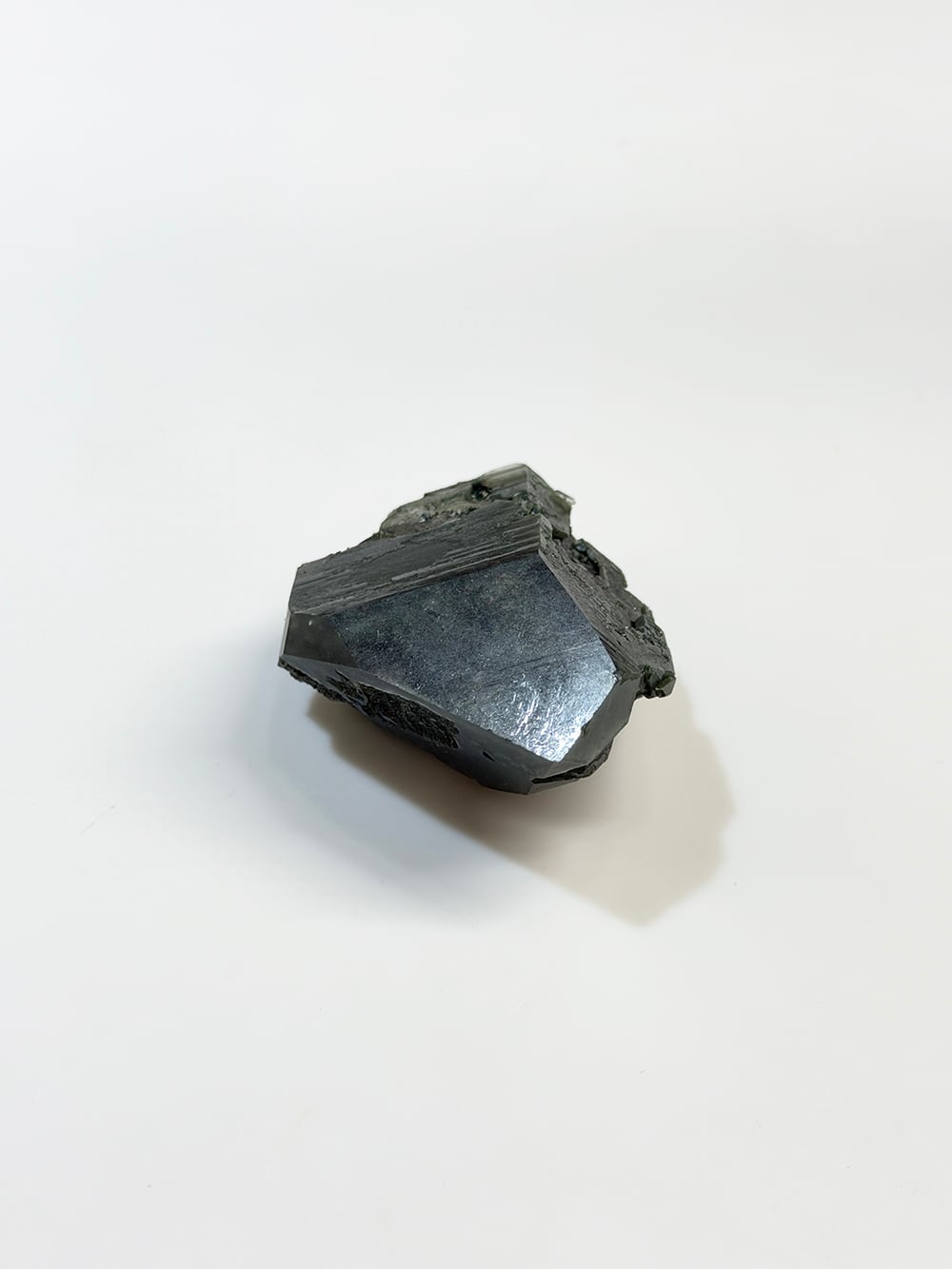 クローライトの美しいグリーンを全体に帯びたクォーツ。幾何学的な表情の面があったり、ファントムの層が見える面があったり、クローライトに侵食されている面があったりと、どの角度から見ても素晴らしい表情を持っている一点。