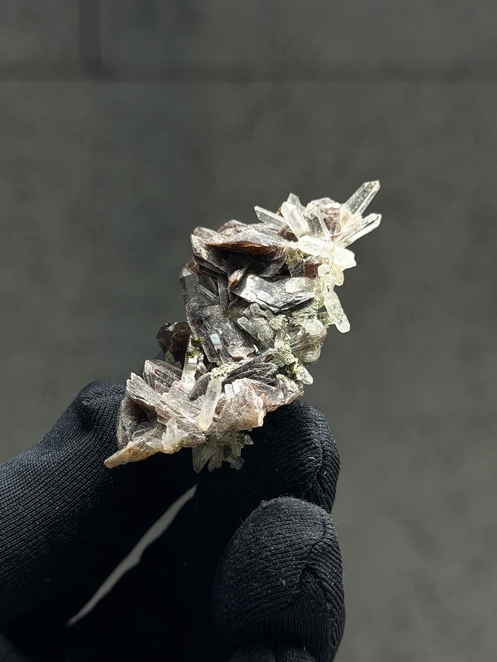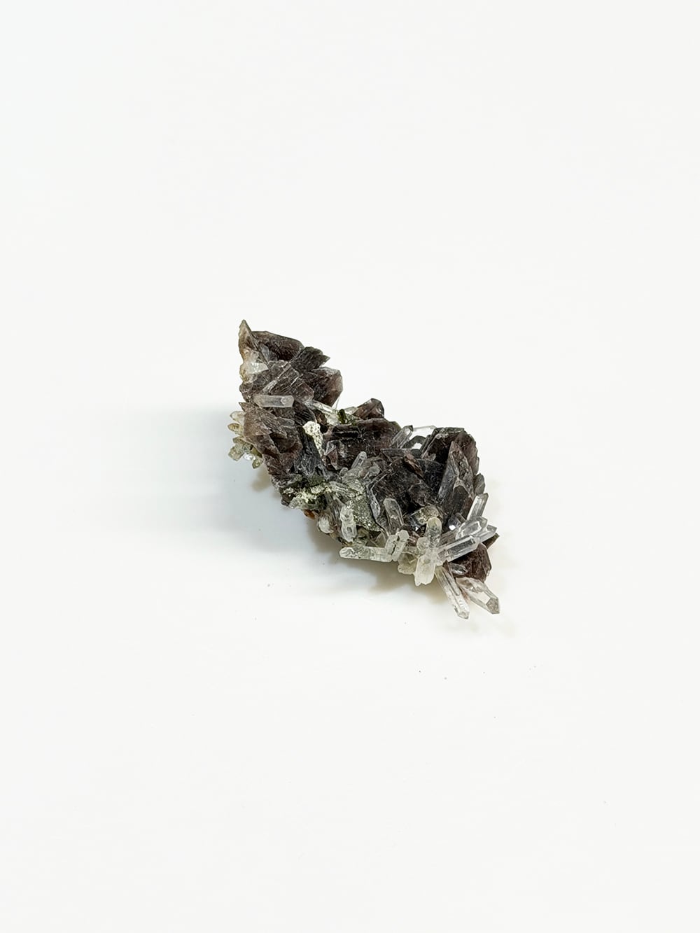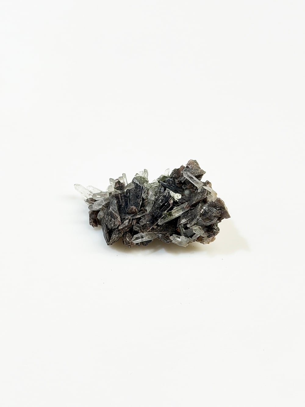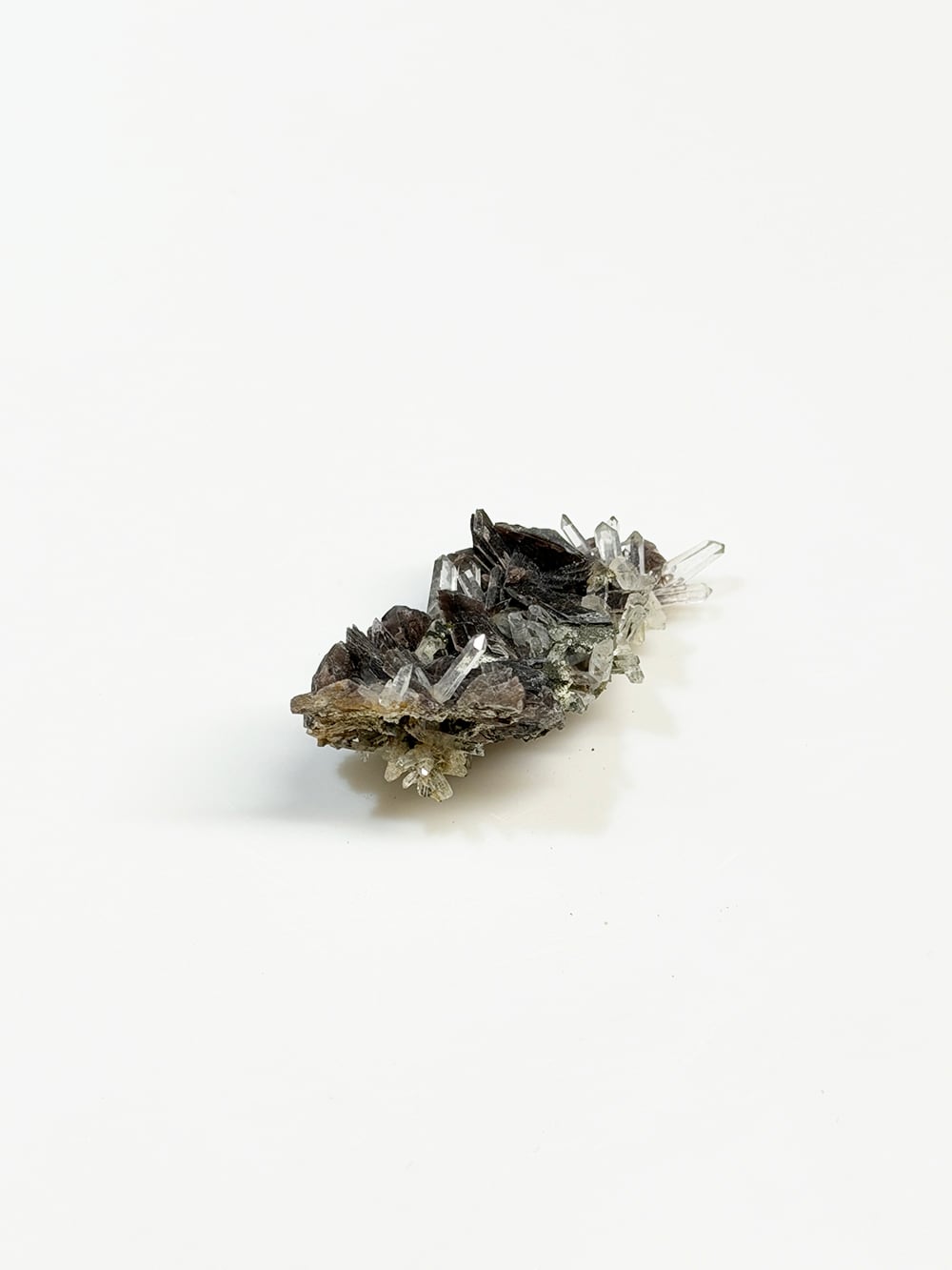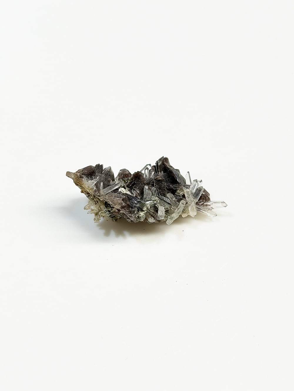その結晶の形が斧(axine)のように鋭いことから名前がつけられた鉱物で、見る角度によって独特の照りと色合いを見せてくれます。繊細な印象のクォーツと、背面にはエピドートも共生しており、色のコントラストも個性的でとても美しい一点。