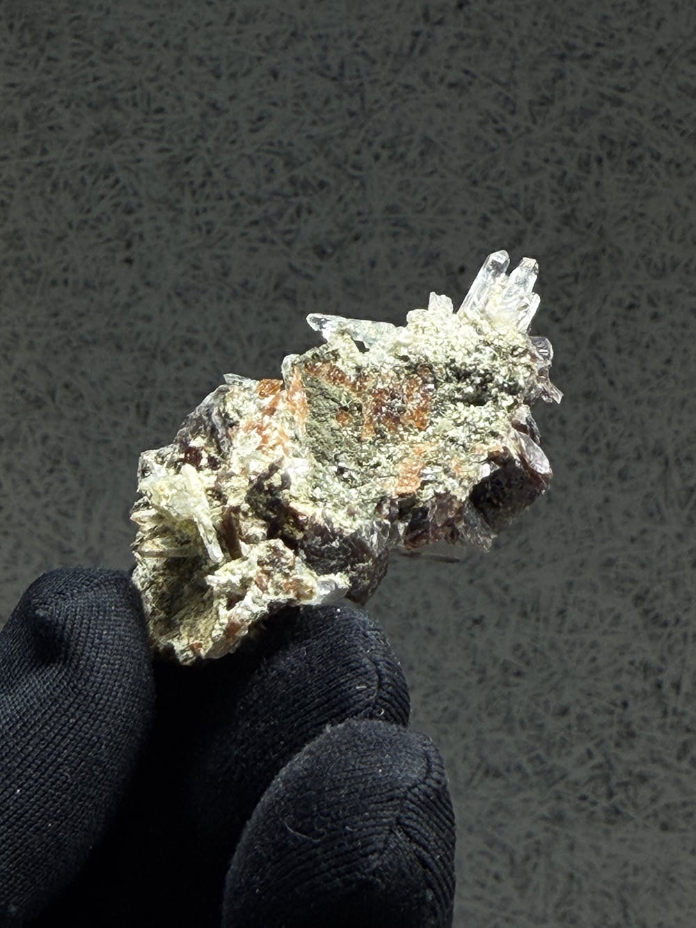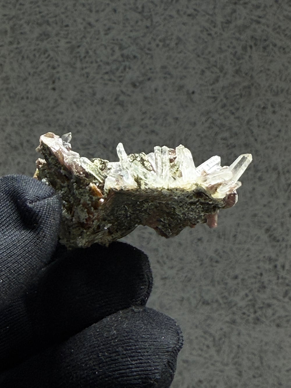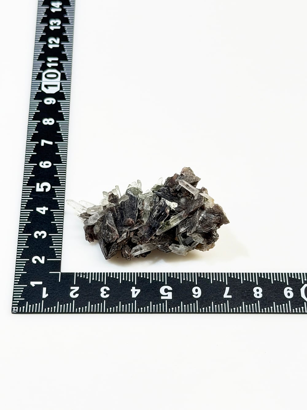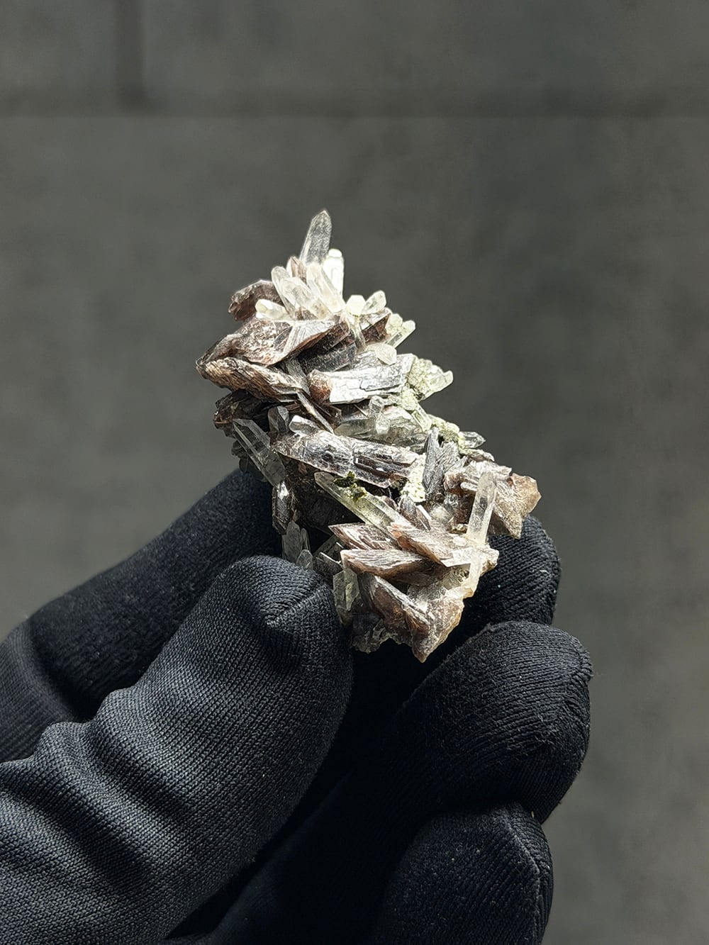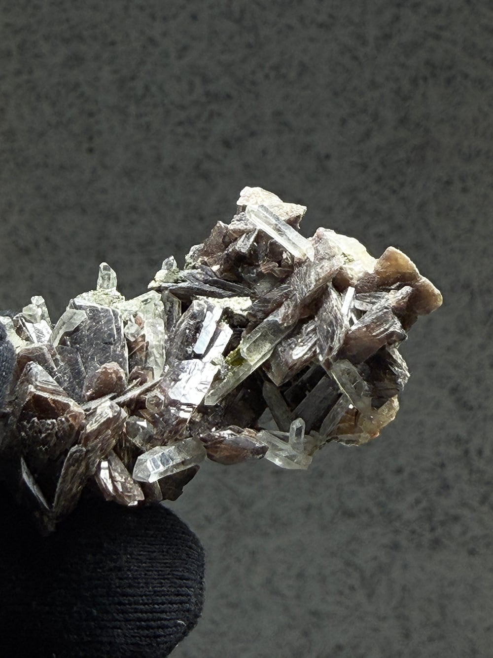 その結晶の形が斧(axine)のように鋭いことから名前がつけられた鉱物で、見る角度によって独特の照りと色合いを見せてくれます。繊細な印象のクォーツと、背面にはエピドートも共生しており、色のコントラストも個性的でとても美しい一点。