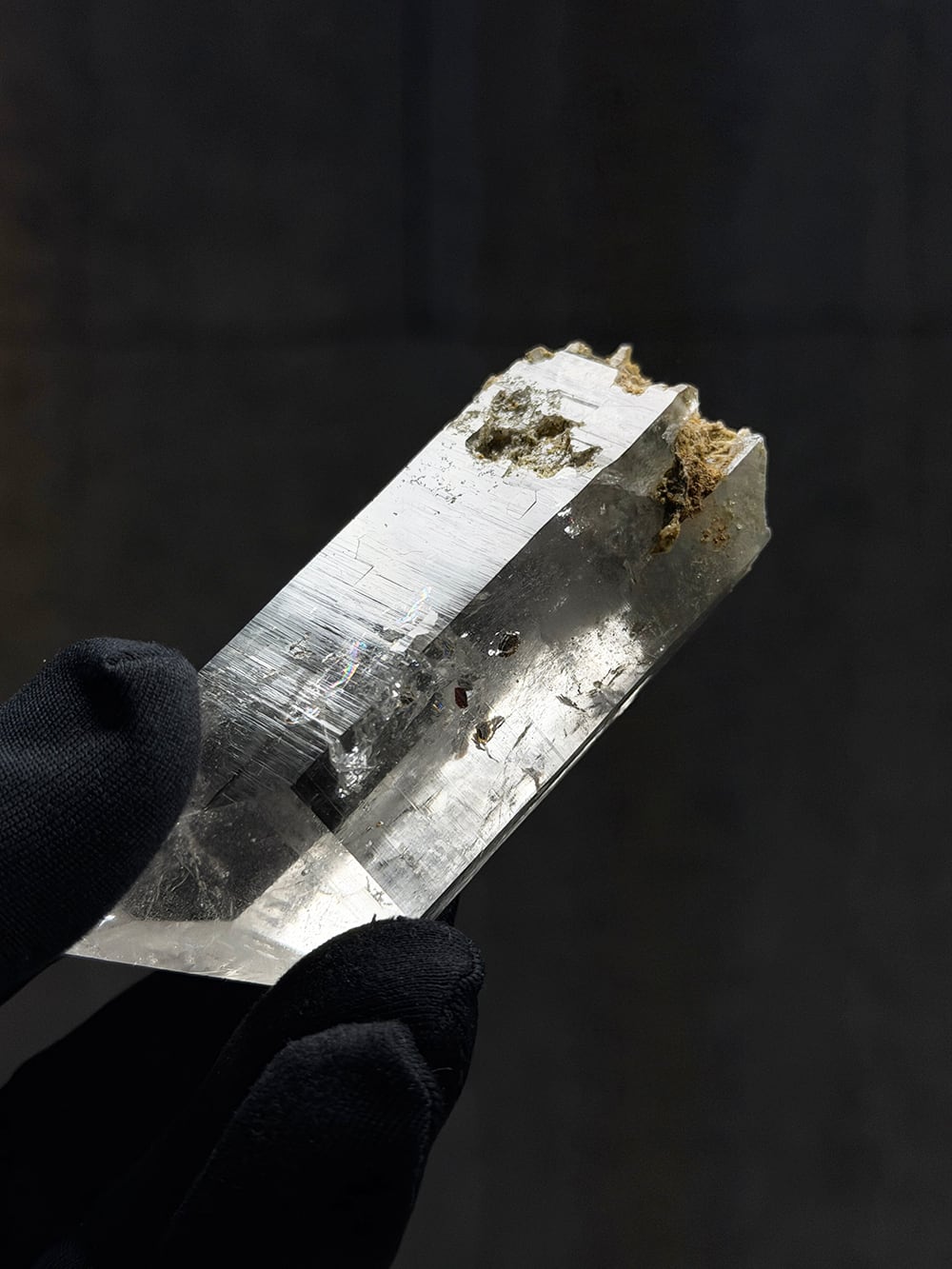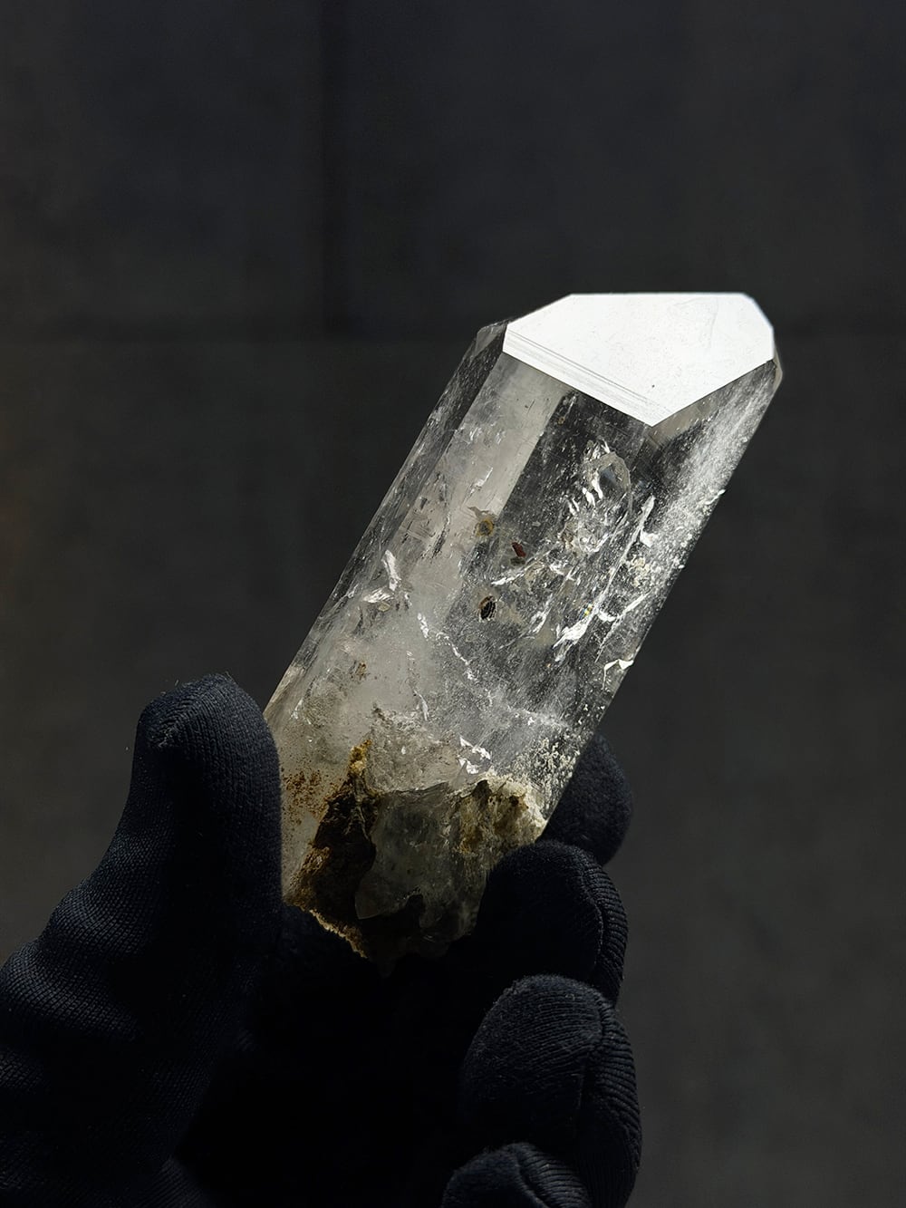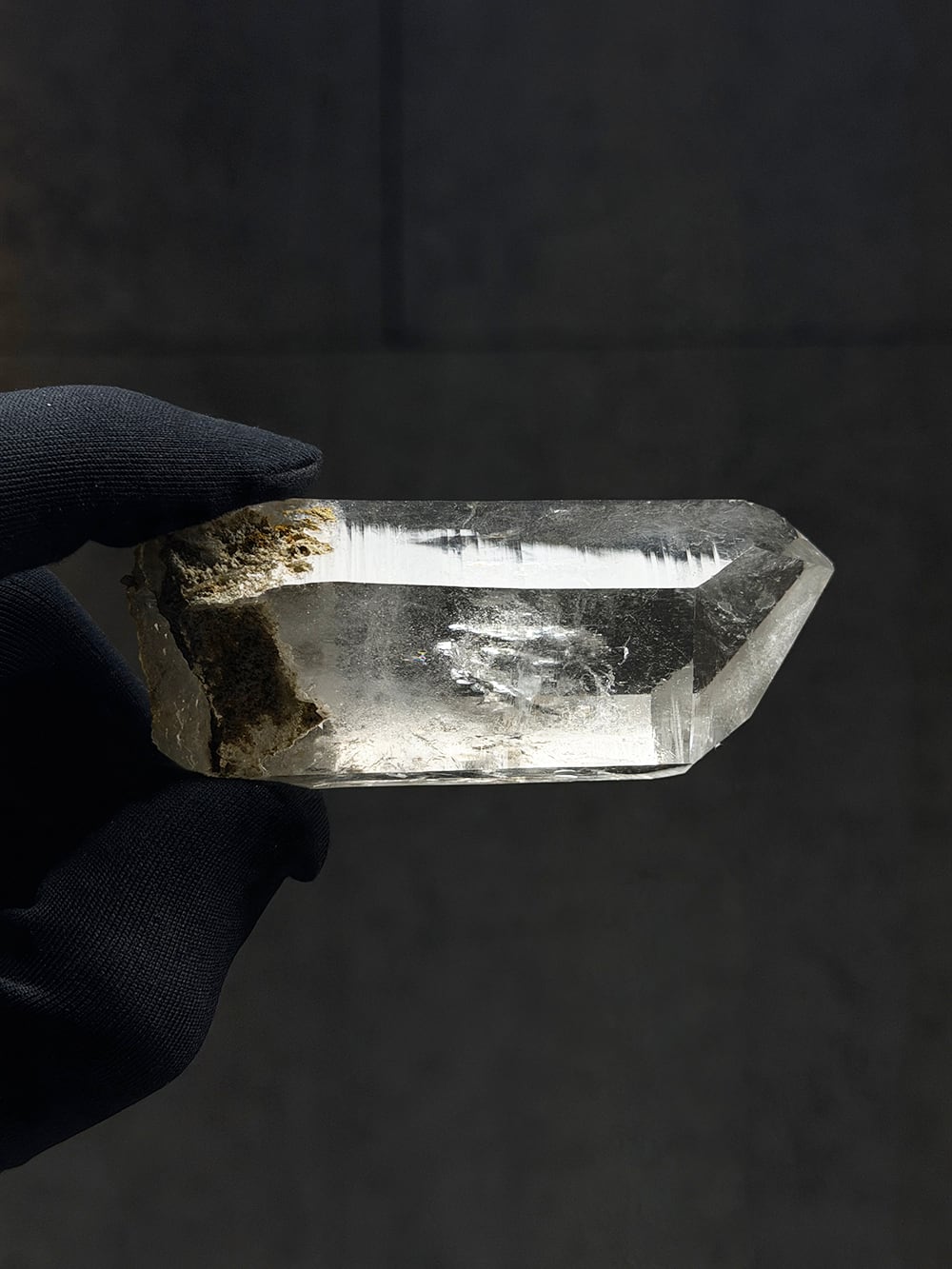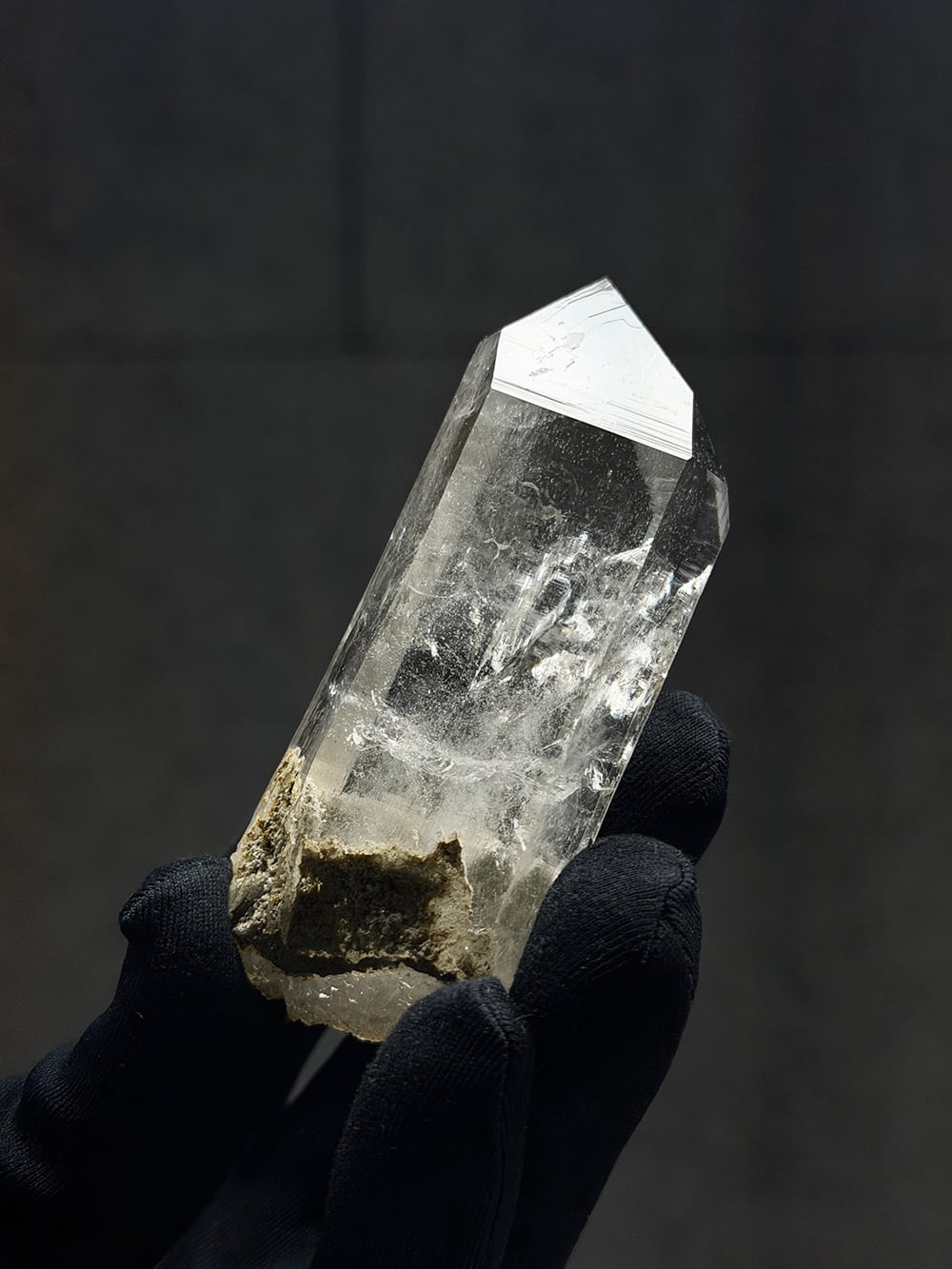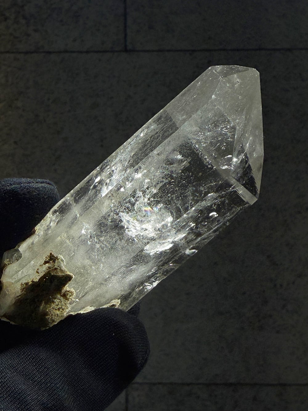 とても美しいシェイプのポイントクォーツ。照りと透明度も素晴らしい一点です。グレイッシュなクローライトの色も良く、画像では分かりにくいですが、中に虹もかなりはっきりと見ることができます。手に取って眺めるのに丁度良い大きさで、どの面を見ても素晴らしい輝きです。