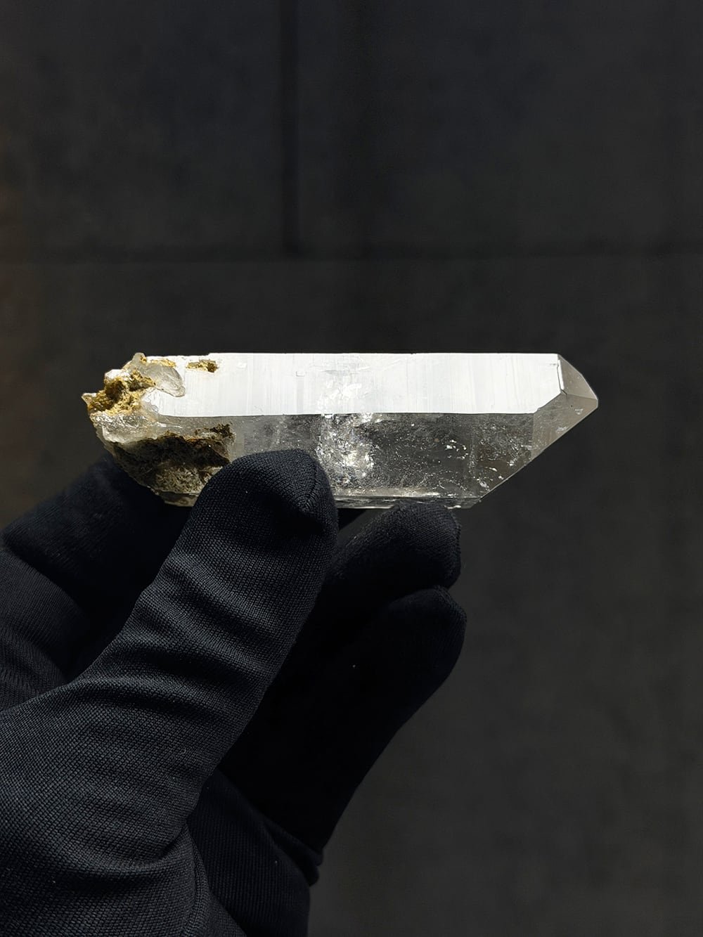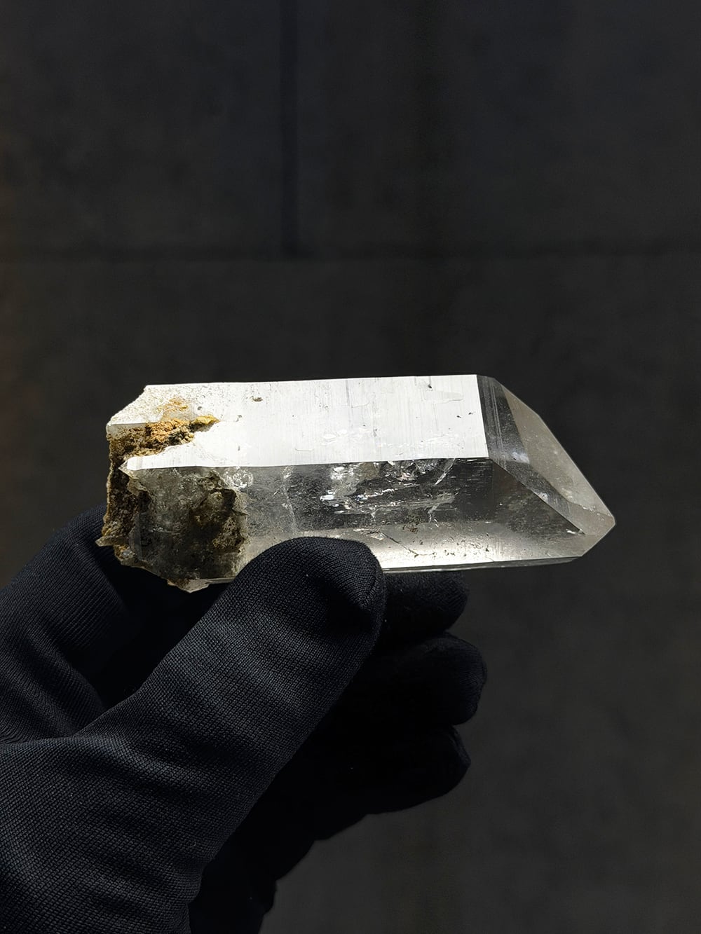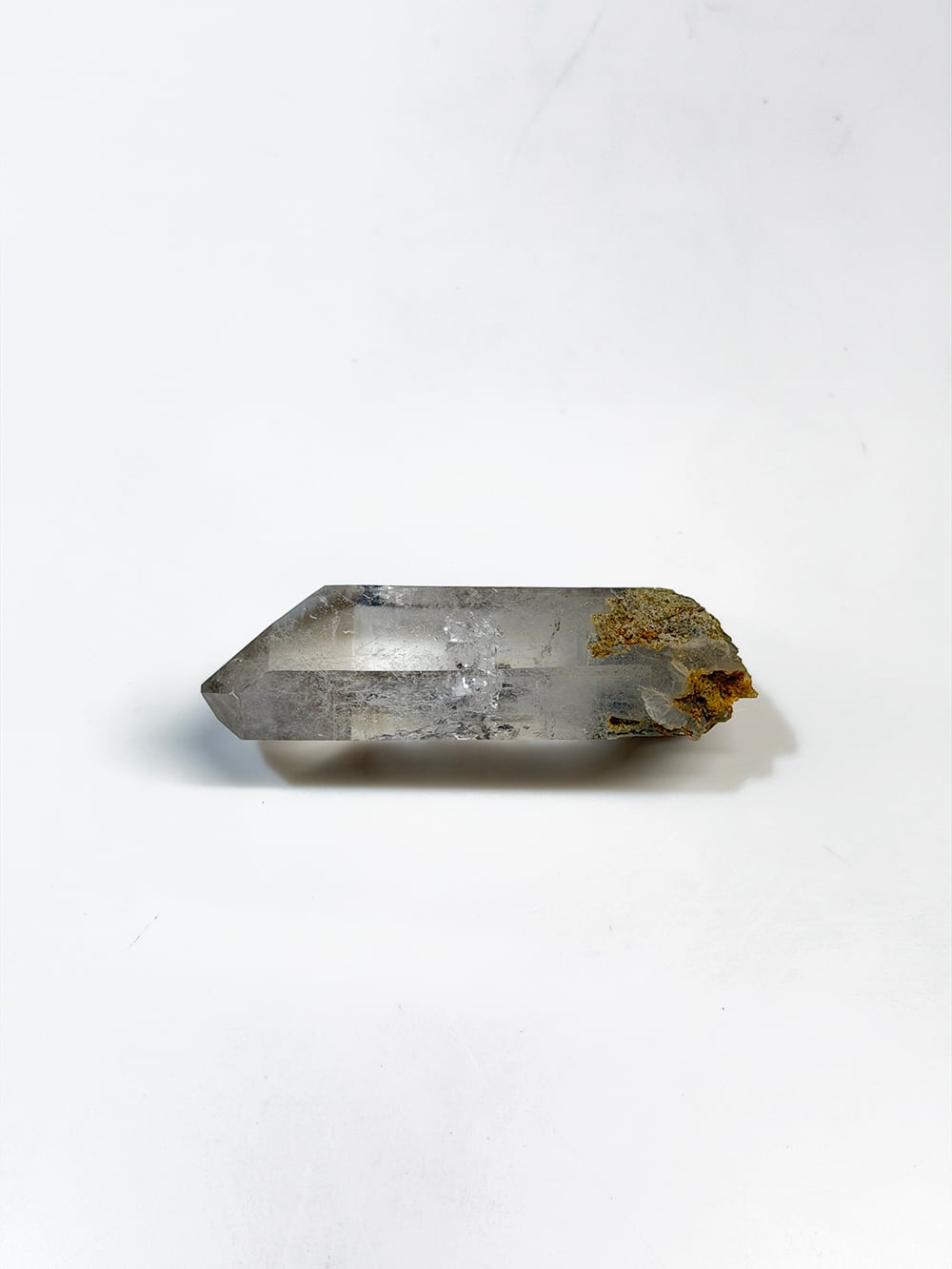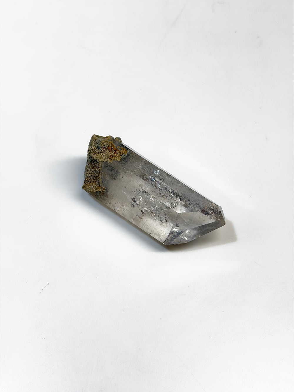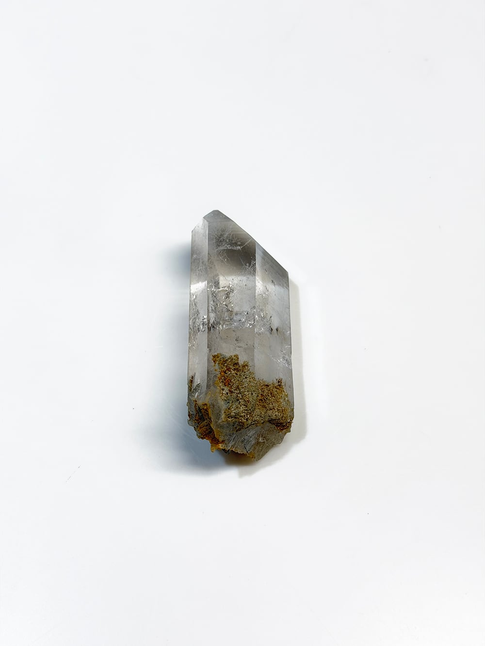 とても美しいシェイプのポイントクォーツ。照りと透明度も素晴らしい一点です。グレイッシュなクローライトの色も良く、画像では分かりにくいですが、中に虹もかなりはっきりと見ることができます。手に取って眺めるのに丁度良い大きさで、どの面を見ても素晴らしい輝きです。