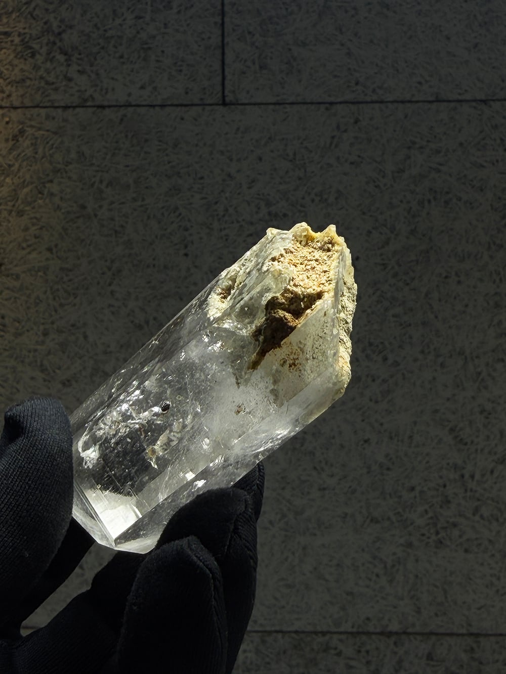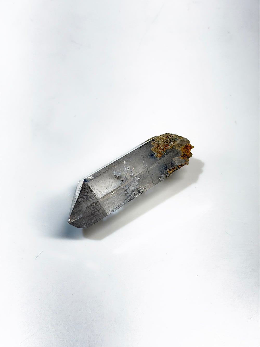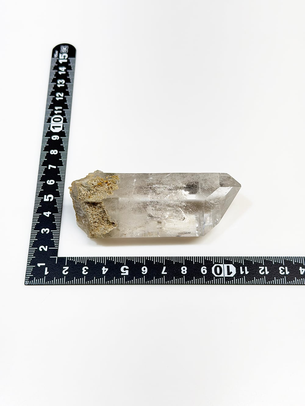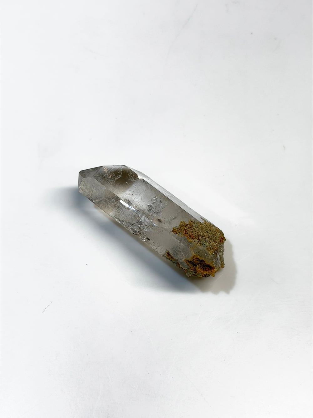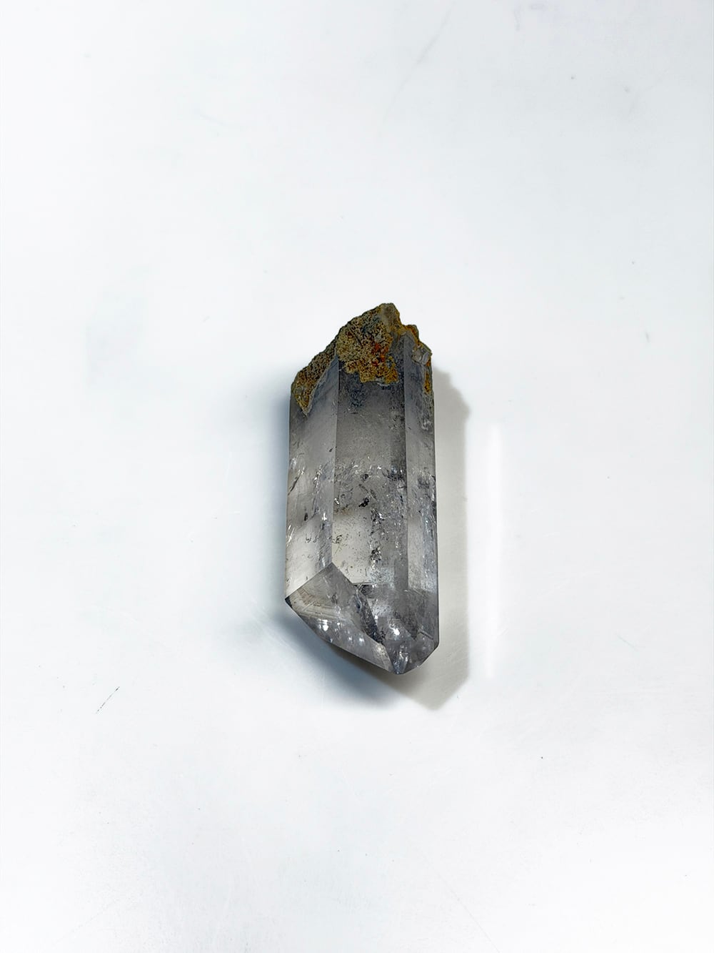 とても美しいシェイプのポイントクォーツ。照りと透明度も素晴らしい一点です。グレイッシュなクローライトの色も良く、画像では分かりにくいですが、中に虹もかなりはっきりと見ることができます。手に取って眺めるのに丁度良い大きさで、どの面を見ても素晴らしい輝きです。