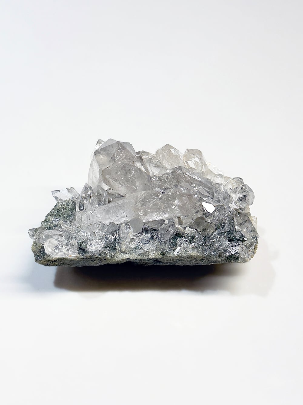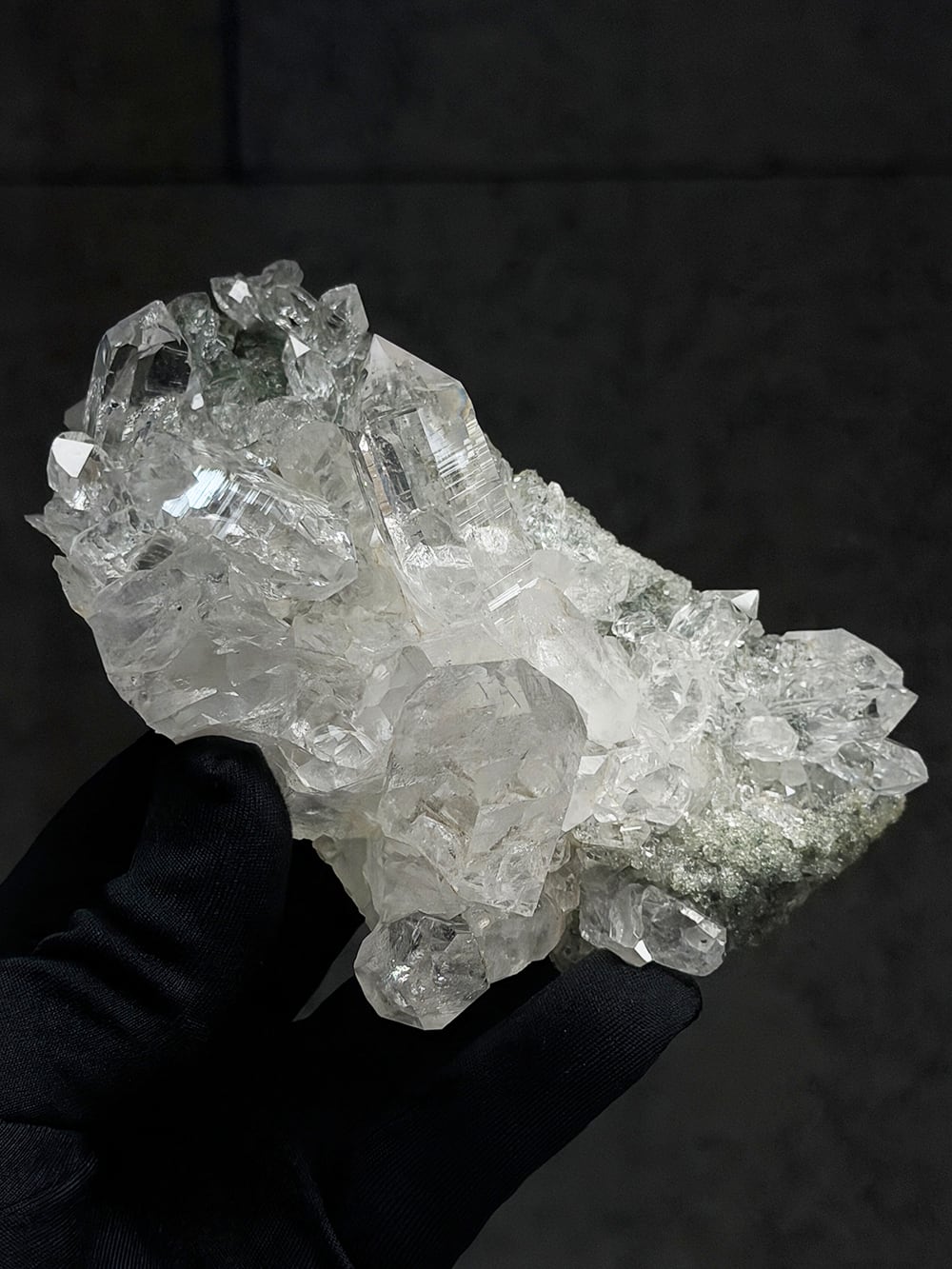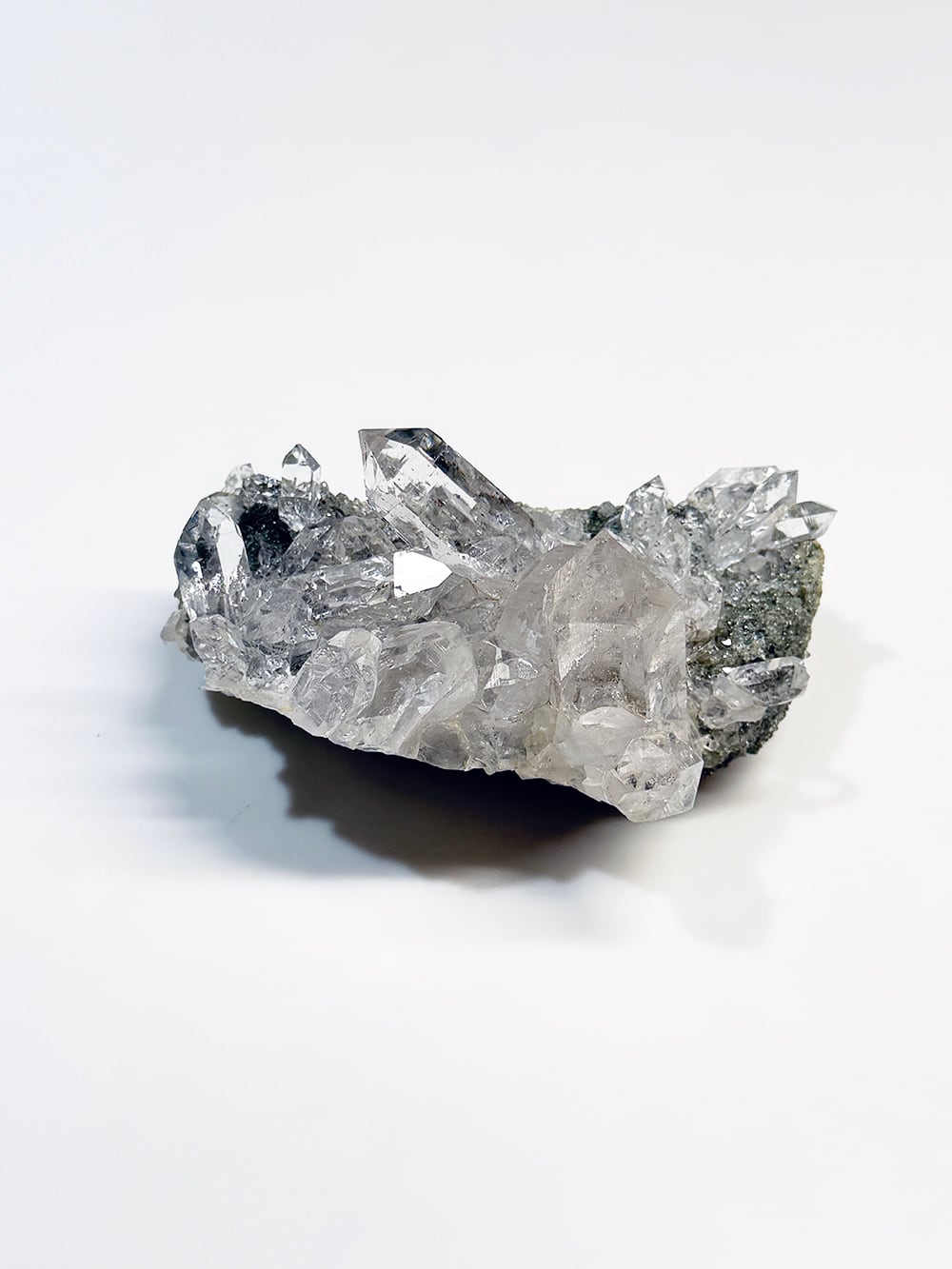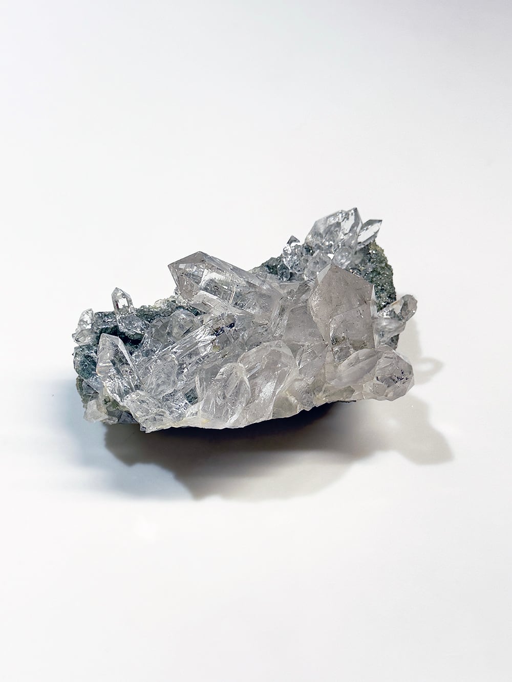 素晴らしい透明感と照りを持ったクォーツクラスター。クローライトのグリーンもとても美しく、マニハールらしい輝きが溢れる一点。置いたときの座りも素晴らしく、とても鑑賞価値の高い一点。程よいボリューム感もあります。