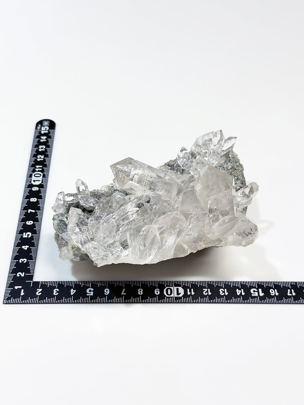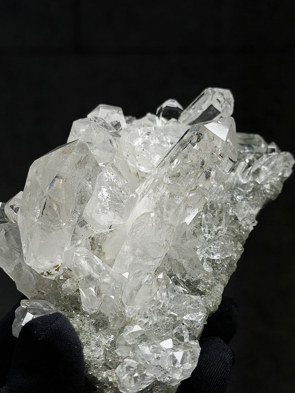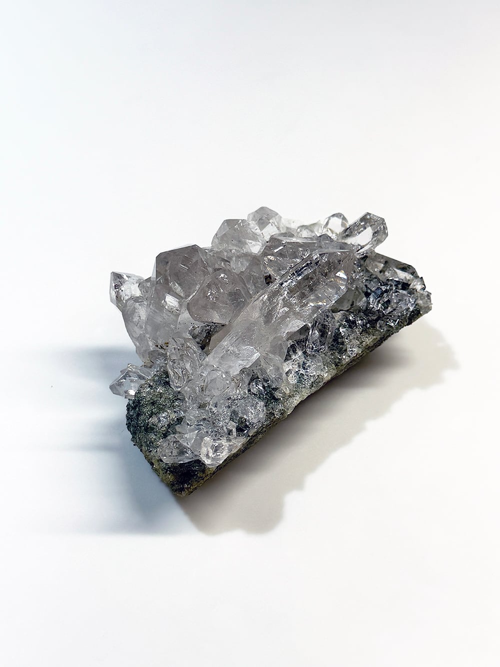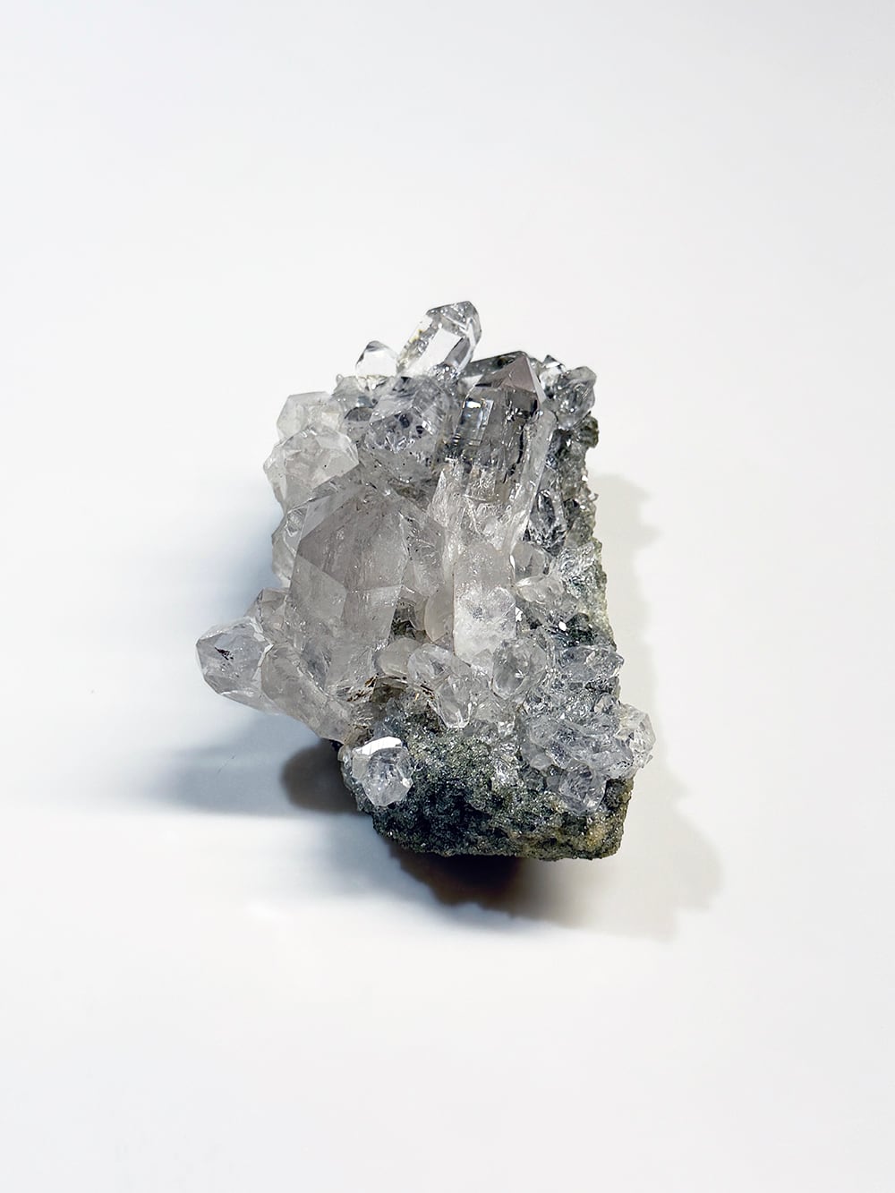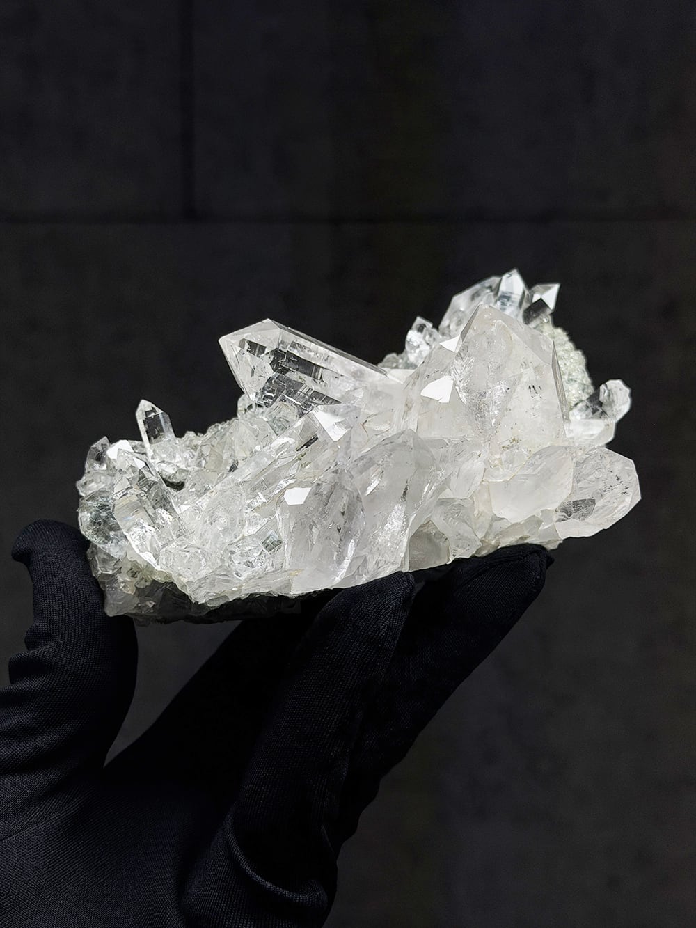 素晴らしい透明感と照りを持ったクォーツクラスター。クローライトのグリーンもとても美しく、マニハールらしい輝きが溢れる一点。置いたときの座りも素晴らしく、とても鑑賞価値の高い一点。程よいボリューム感もあります。