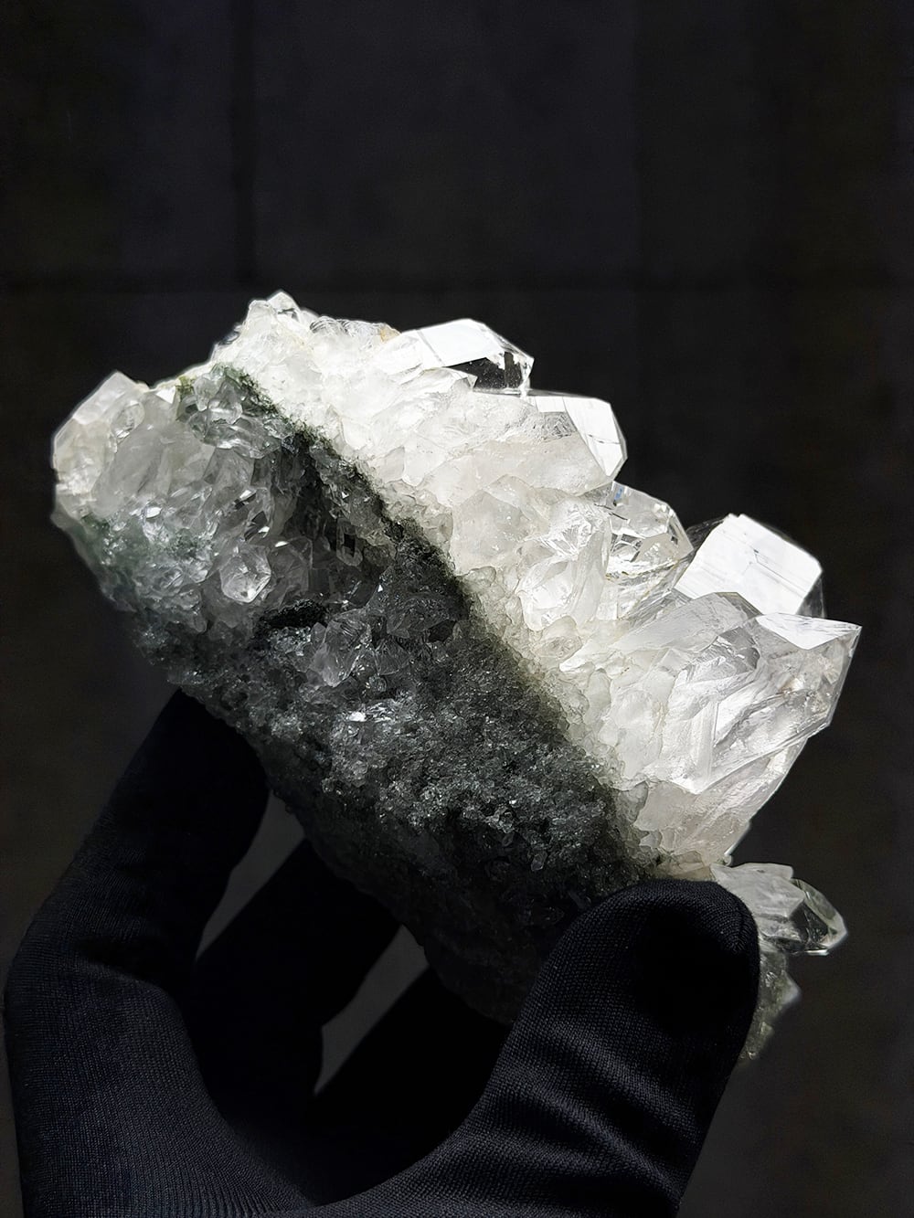 インドのガルサ渓谷、標高5400mのクル地方の奥にあるマニハール。産出されるヒマラヤ水晶は、水晶の中でもトップクラスの品質とされており、透明度と光沢が特に美しいことでも知られます。特徴として共生しているクローライト(緑泥石)は、このマニハールではモスグリーンの色をしており、透明度と相まってより美しさを増しています。2022年頃にマニハールでの採掘が政府の厳しい監視下に置かれるようになり、流通量が激減しているそうです。価格の高騰も続いており、採掘が再開されるかも不明で、今後は入手困難になる可能性も高くなっております。