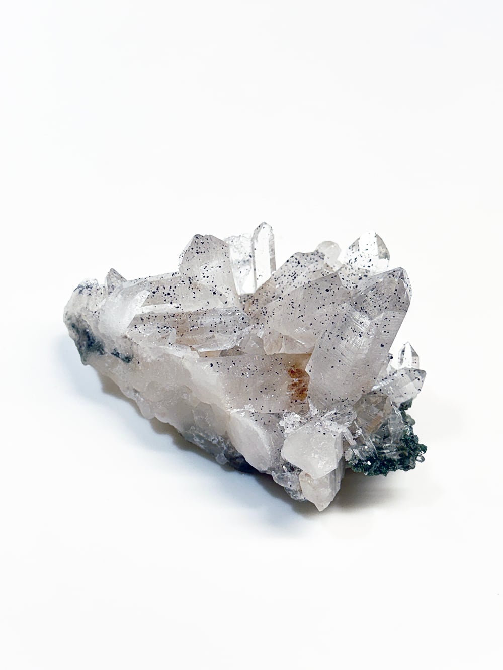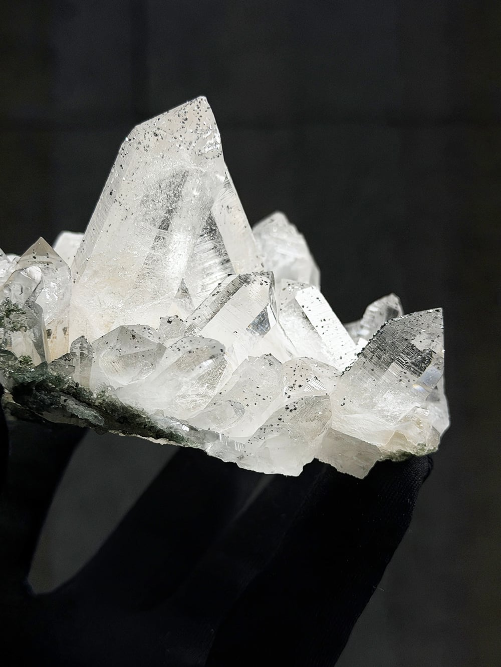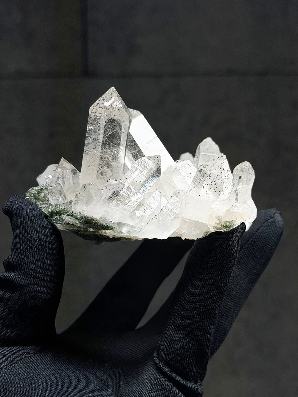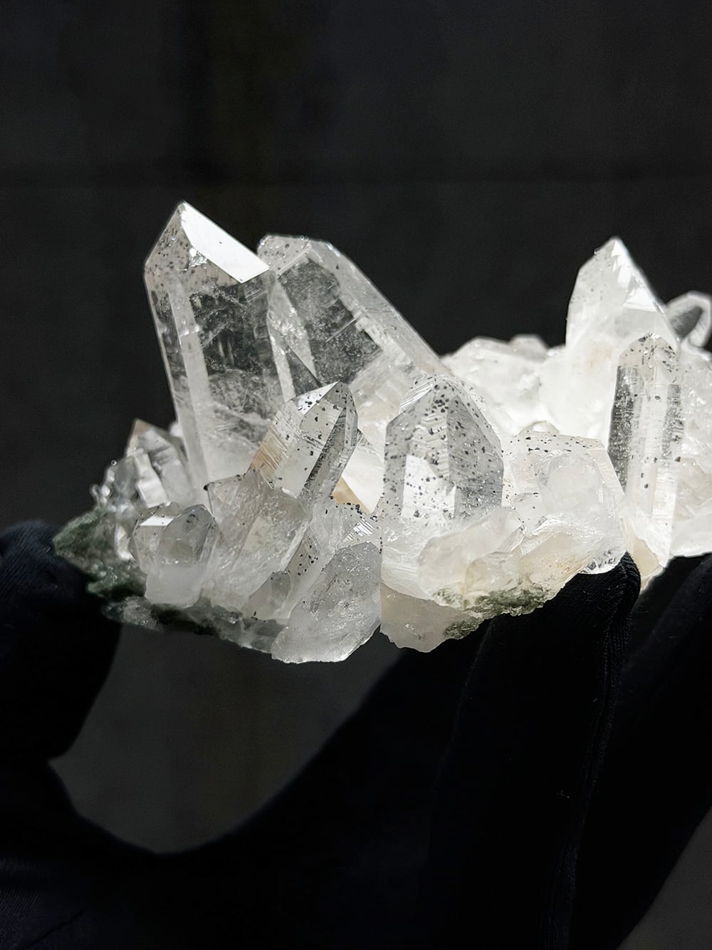 手のひらサイズのとても美しいクラスター。クォーツとクローライトの美しさもあるのですが、全体にアナテースが煌めきをプラスしており、とてもマニハールらしい景色を作り出しています。透明度と照りも良いのですが、全体にバーコード(クォーツの成長痕)が綺麗に見られるのも特徴の一点です。