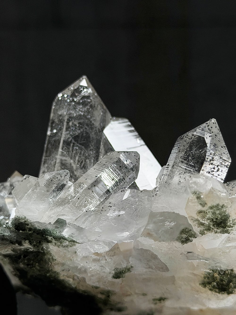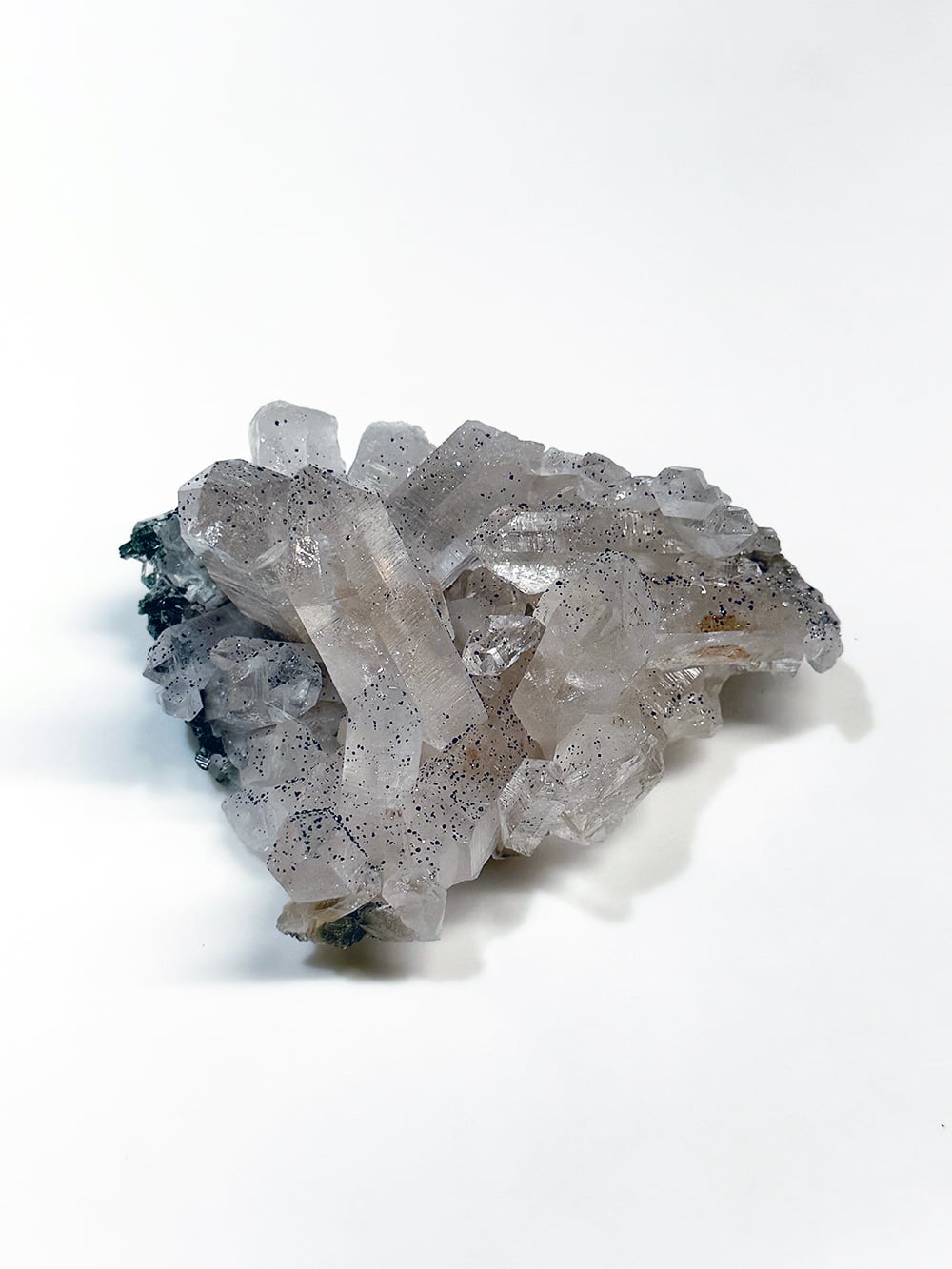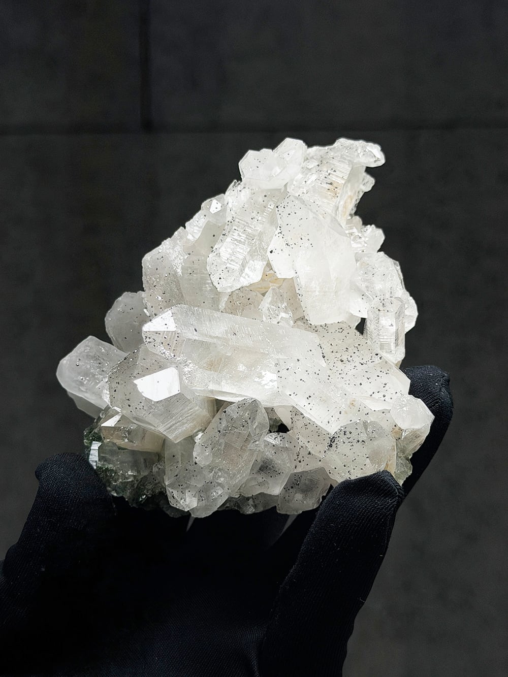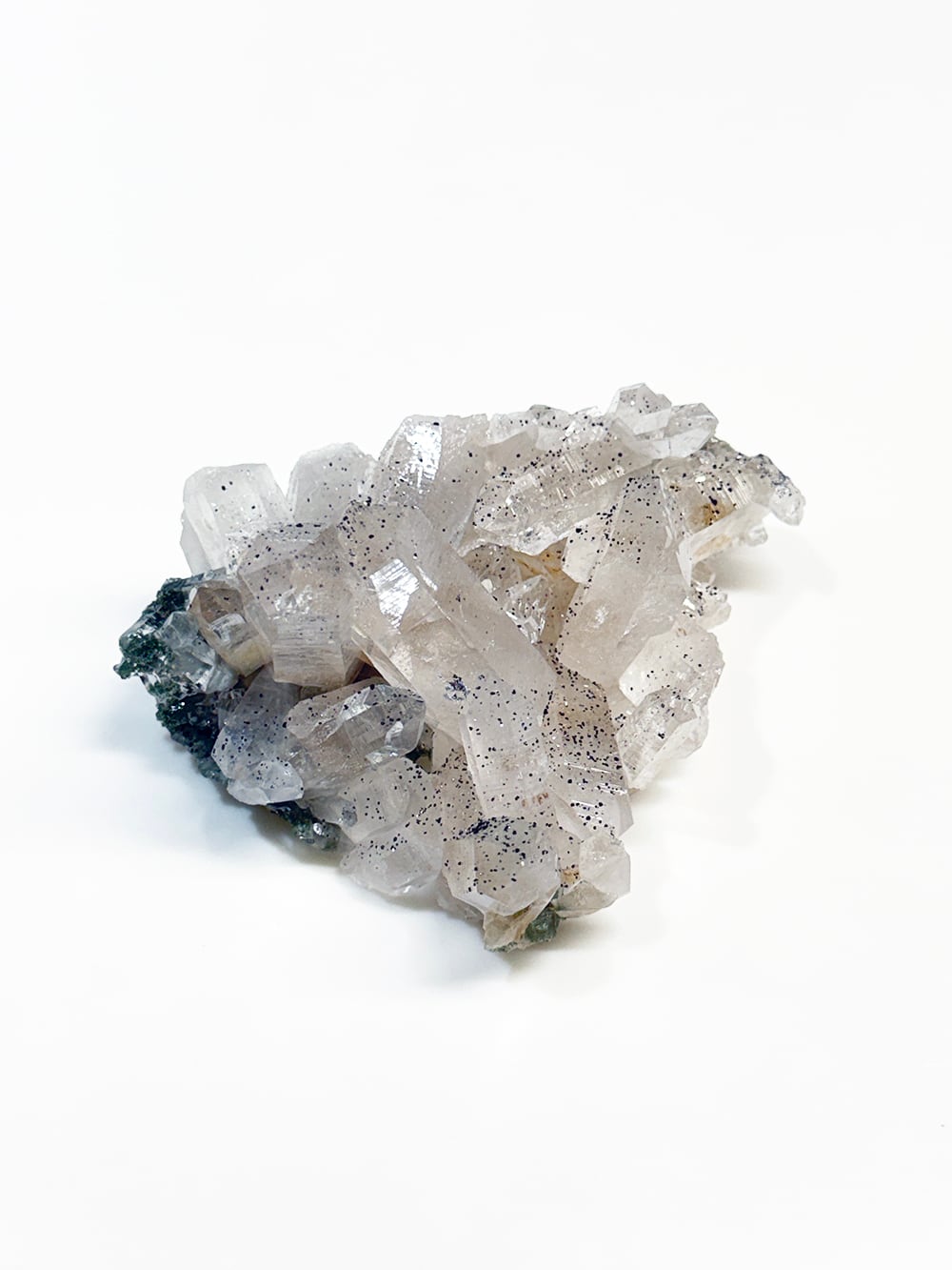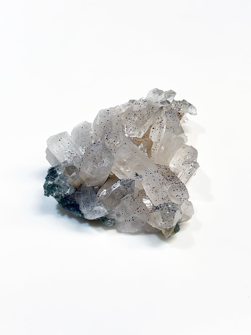 手のひらサイズのとても美しいクラスター。クォーツとクローライトの美しさもあるのですが、全体にアナテースが煌めきをプラスしており、とてもマニハールらしい景色を作り出しています。透明度と照りも良いのですが、全体にバーコード(クォーツの成長痕)が綺麗に見られるのも特徴の一点です。