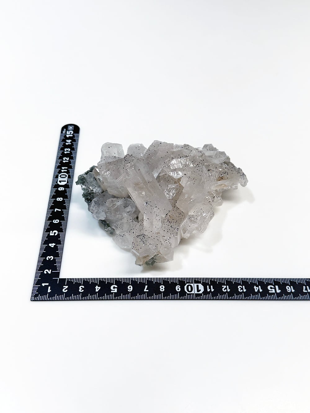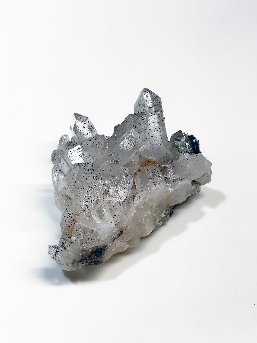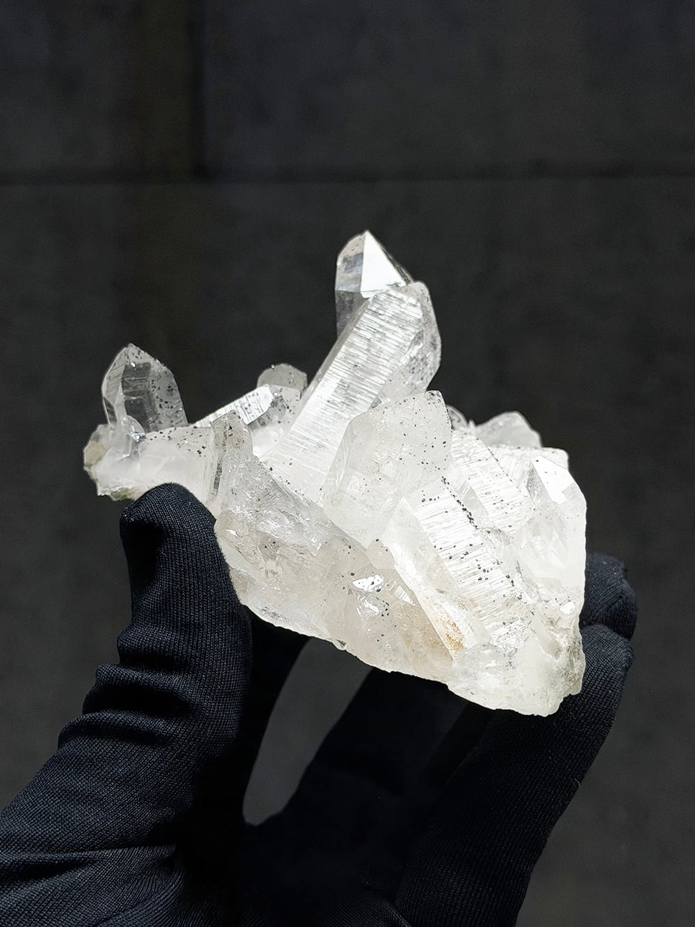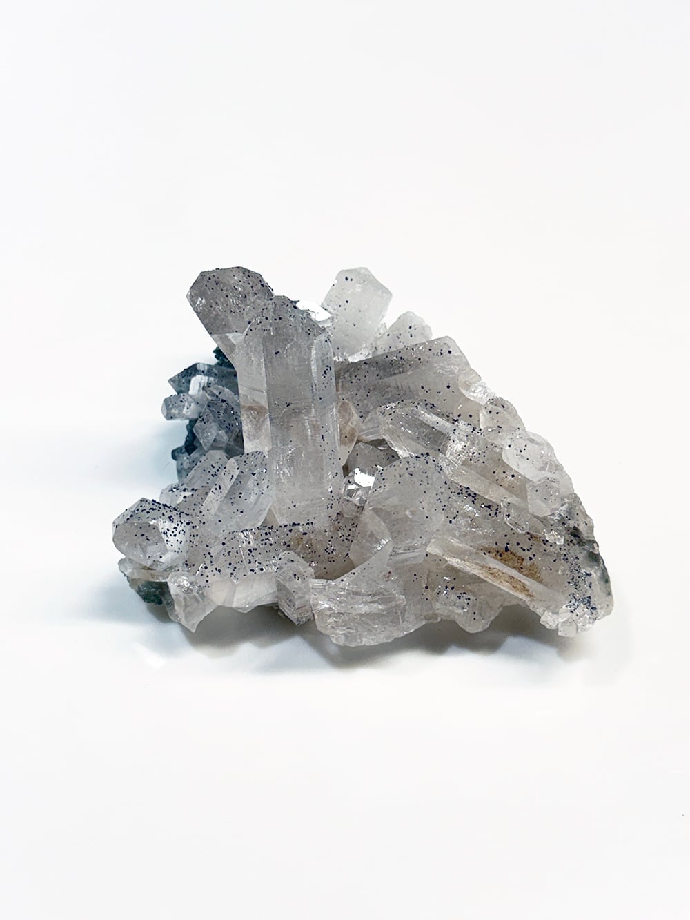 手のひらサイズのとても美しいクラスター。クォーツとクローライトの美しさもあるのですが、全体にアナテースが煌めきをプラスしており、とてもマニハールらしい景色を作り出しています。透明度と照りも良いのですが、全体にバーコード(クォーツの成長痕)が綺麗に見られるのも特徴の一点です。