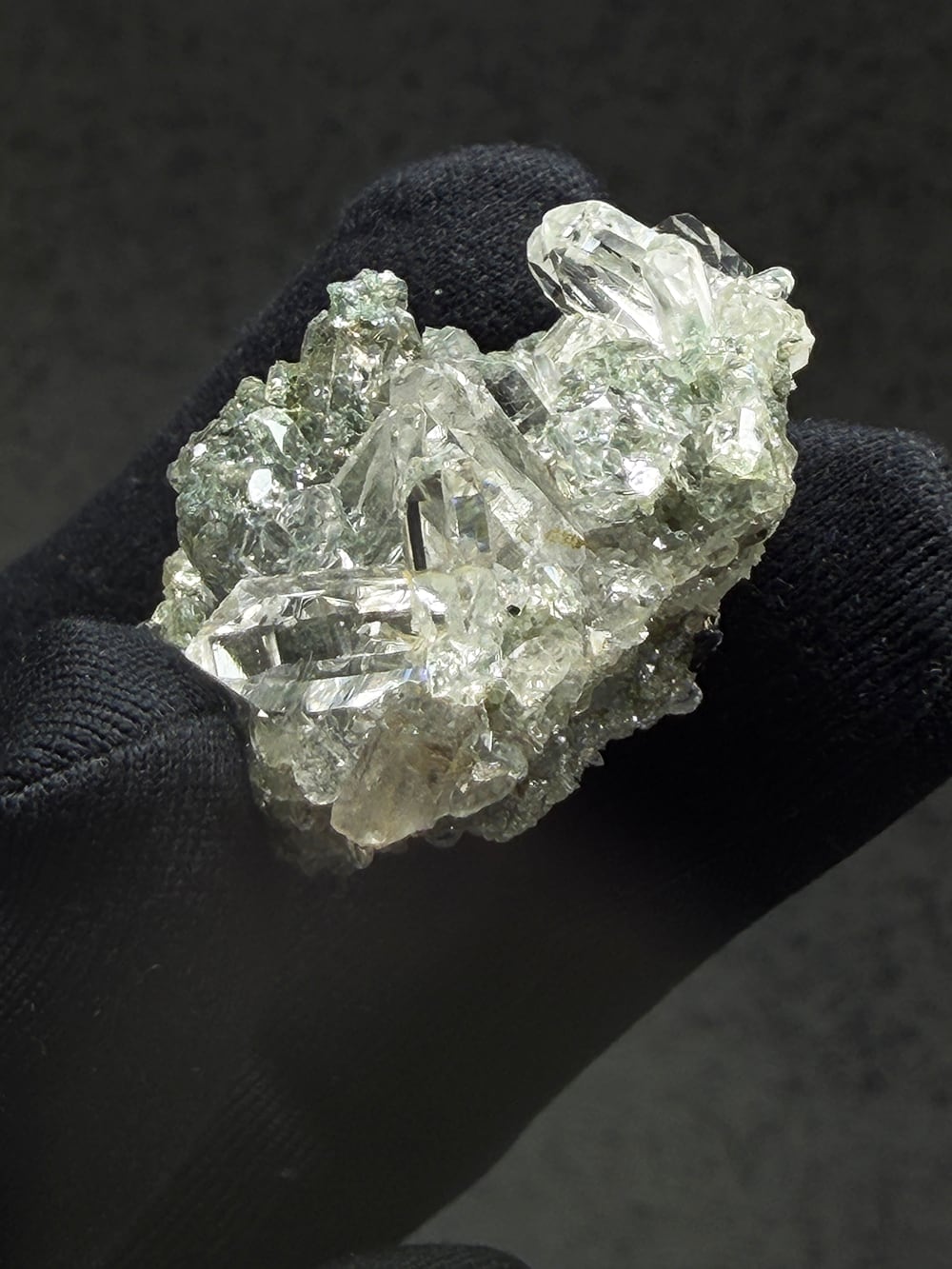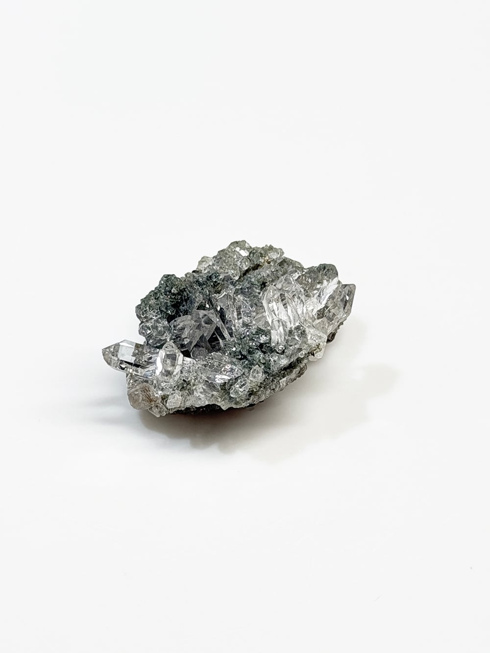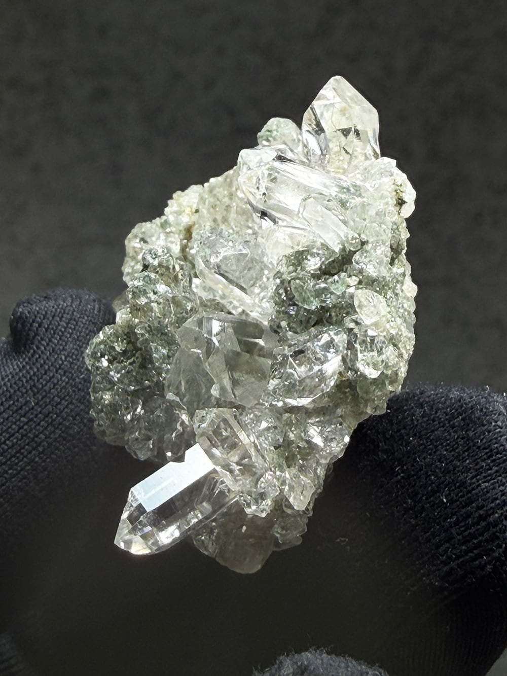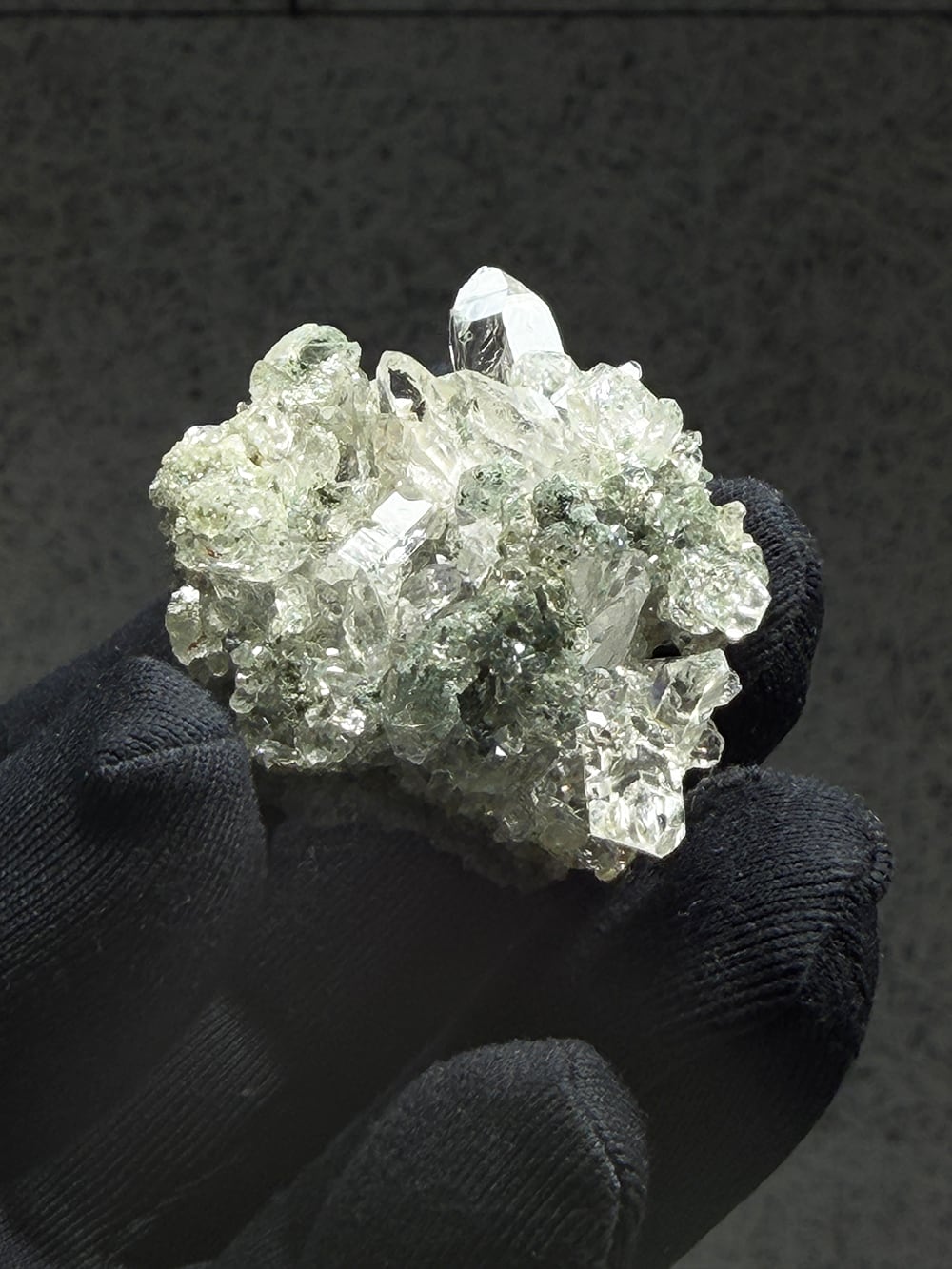 指先サイズのマニハールクォーツクラスター。素晴らしいクォーツの透明度と照り、クローライトの美しいグリーン、そして小さくても虹はしっかりと見ることができます。マニハールクォーツの世界観をギュッと凝縮したようなとても美しいクラスターです。
