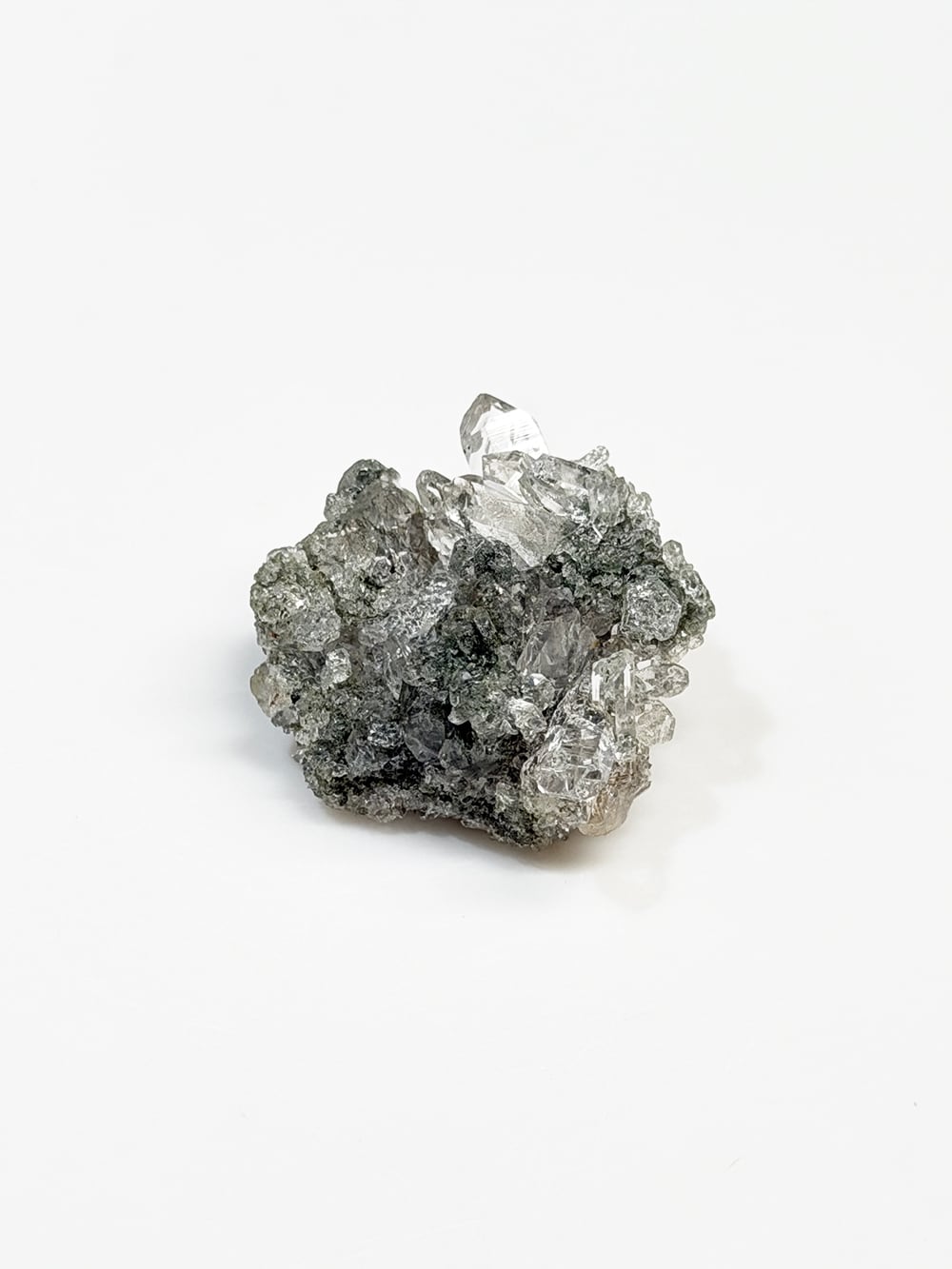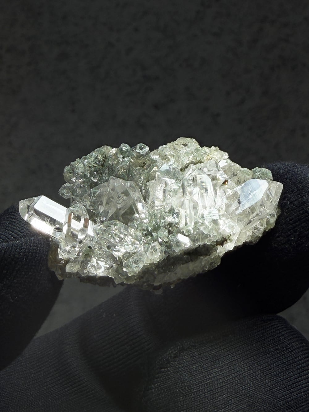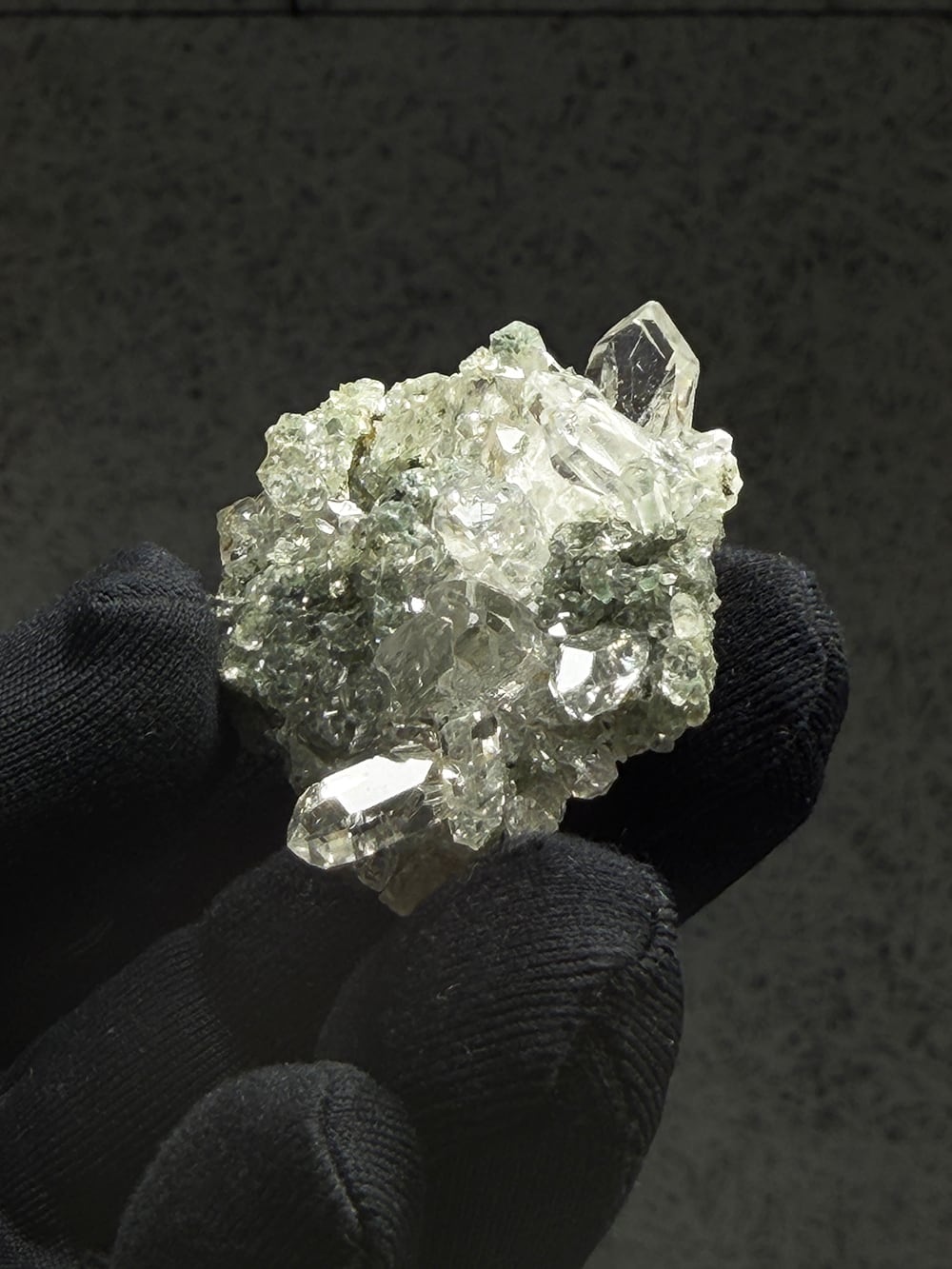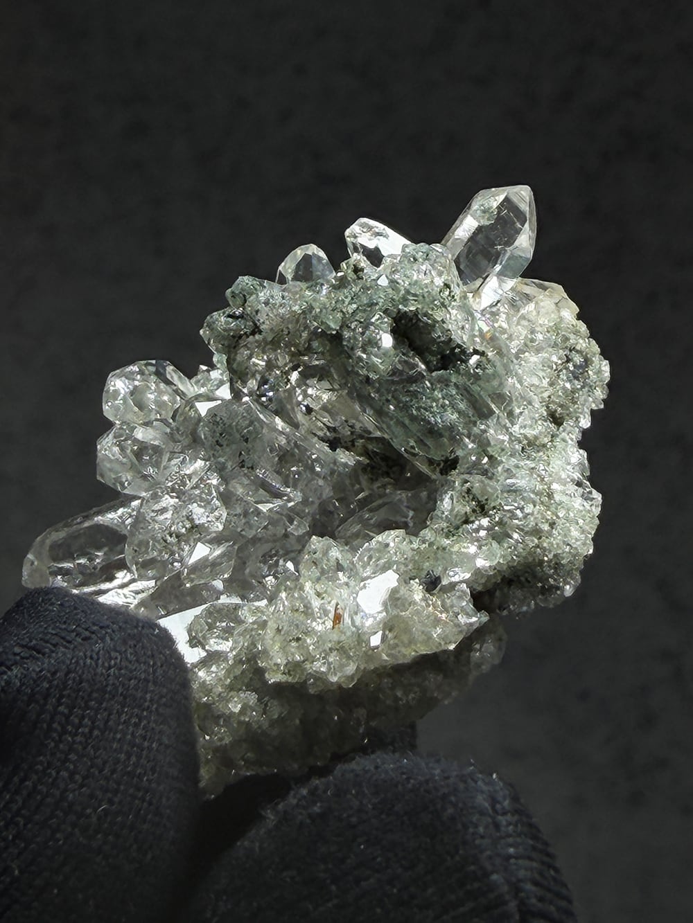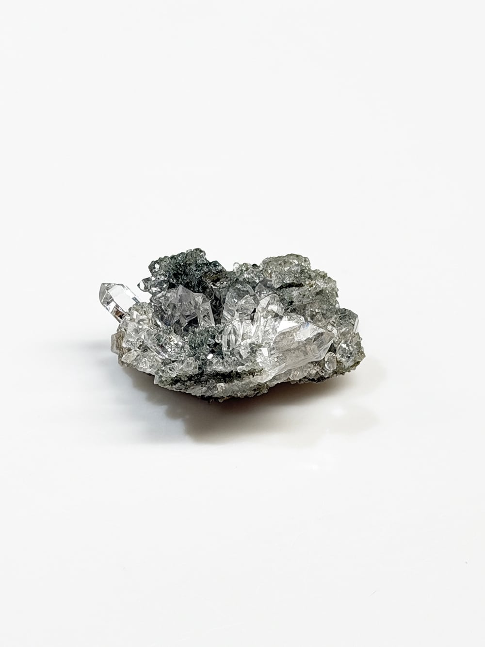 指先サイズのマニハールクォーツクラスター。素晴らしいクォーツの透明度と照り、クローライトの美しいグリーン、そして小さくても虹はしっかりと見ることができます。マニハールクォーツの世界観をギュッと凝縮したようなとても美しいクラスターです。