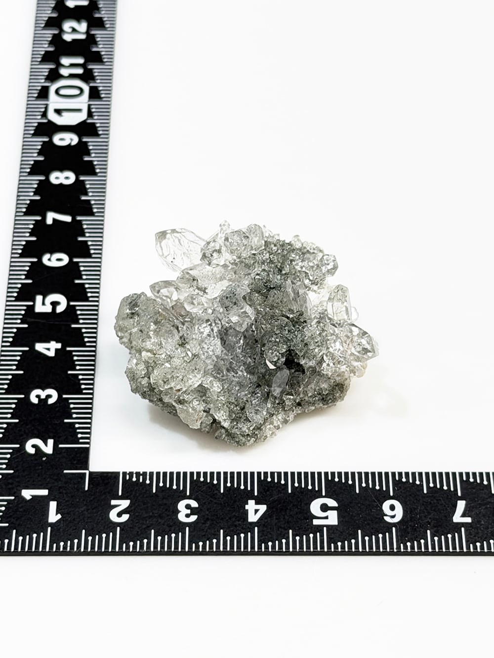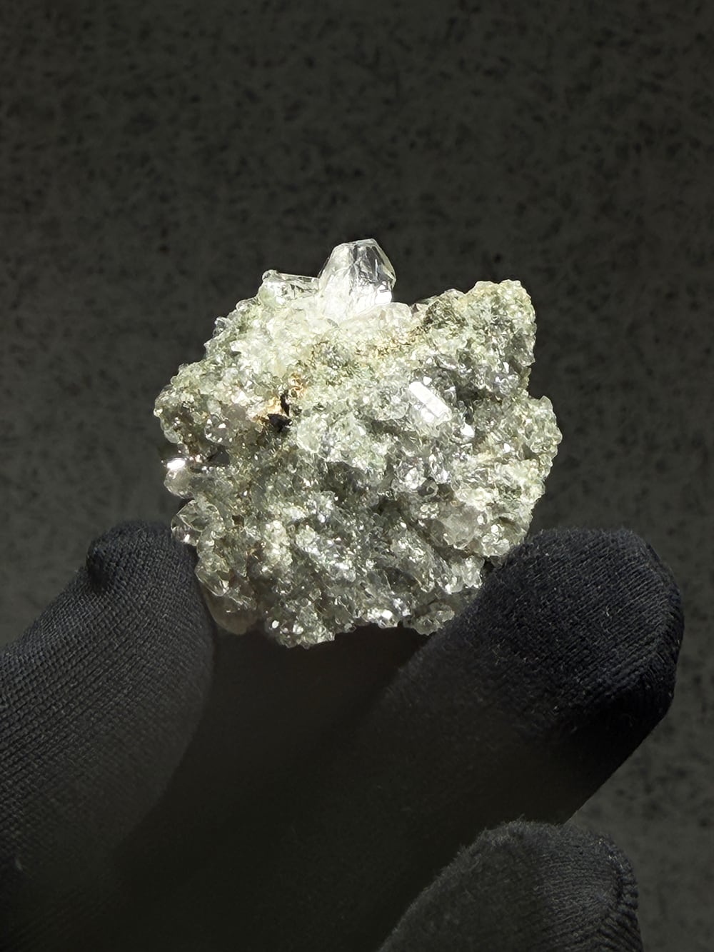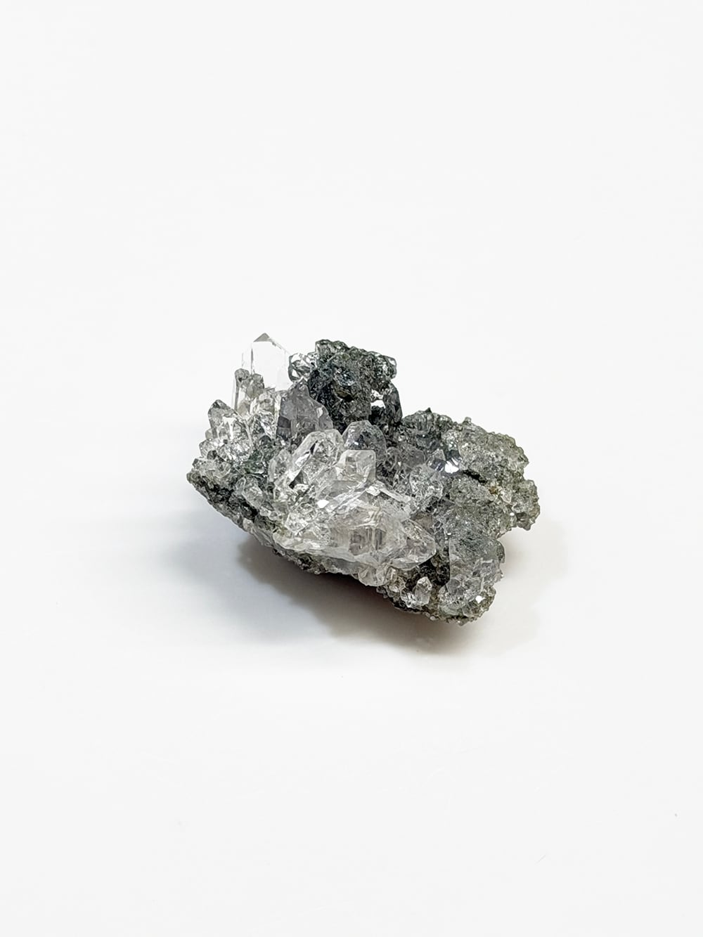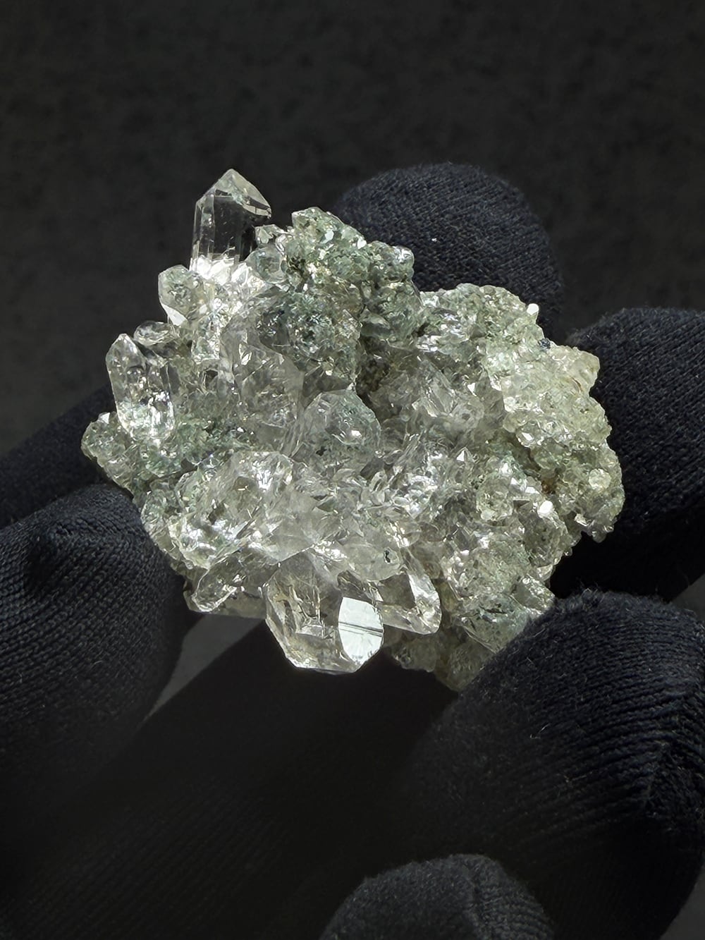 指先サイズのマニハールクォーツクラスター。素晴らしいクォーツの透明度と照り、クローライトの美しいグリーン、そして小さくても虹はしっかりと見ることができます。マニハールクォーツの世界観をギュッと凝縮したようなとても美しいクラスターです。