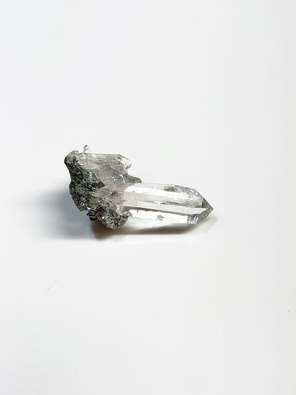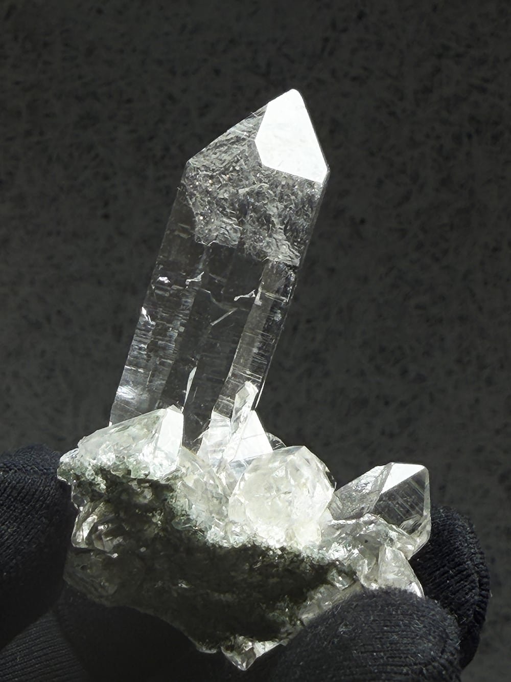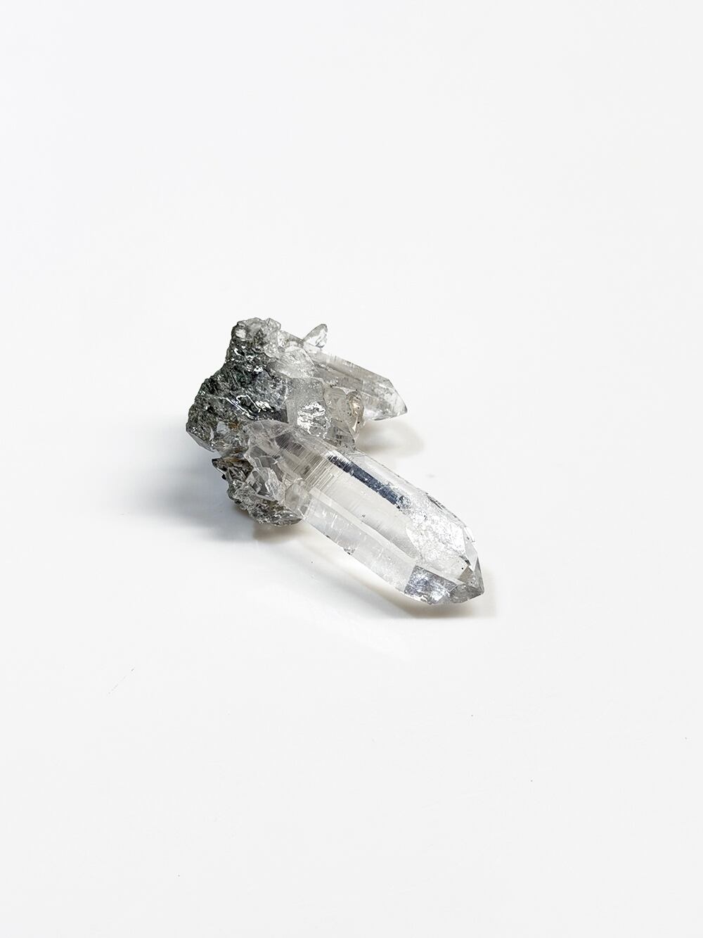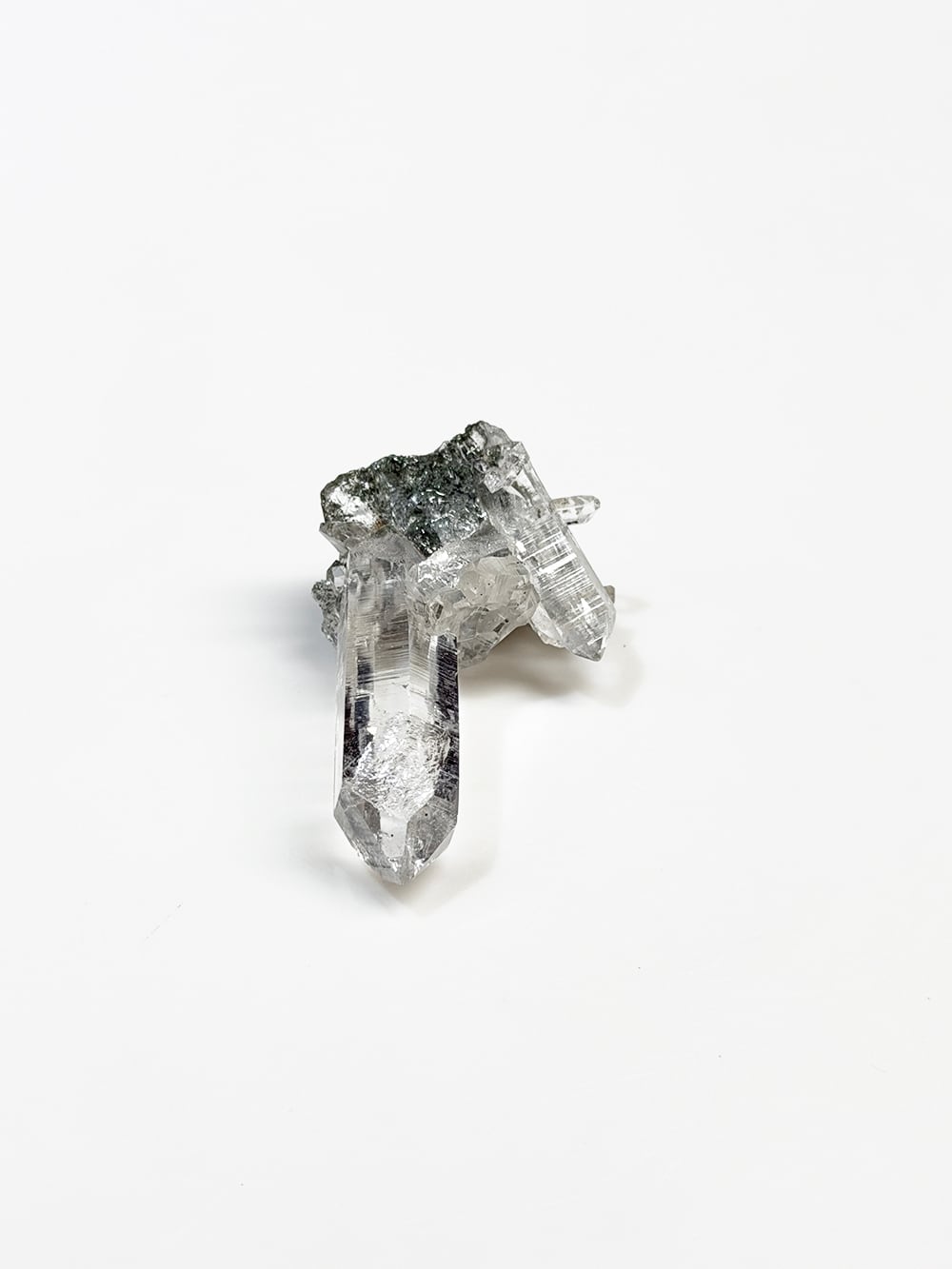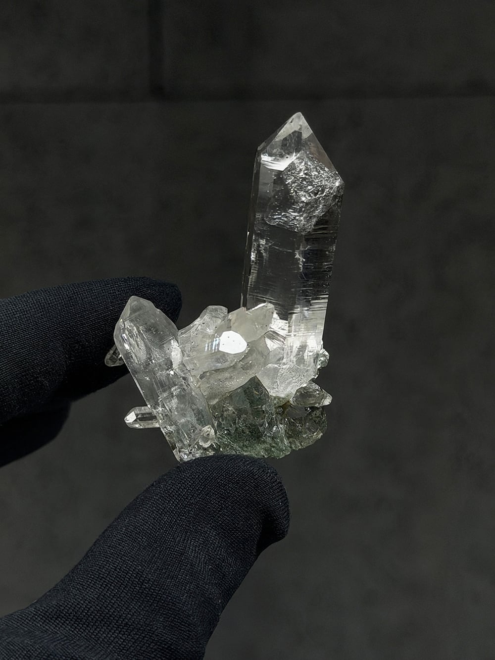 ため息が出るほどに美しいクォーツクラスター。その透明度と照り、クローライトの美しさはマニハールの特徴そのものです。指先に持って眺めるのにちょうど良い大きさと、どの面を見ても輝くクォーツ。とても素晴らしい一点です。