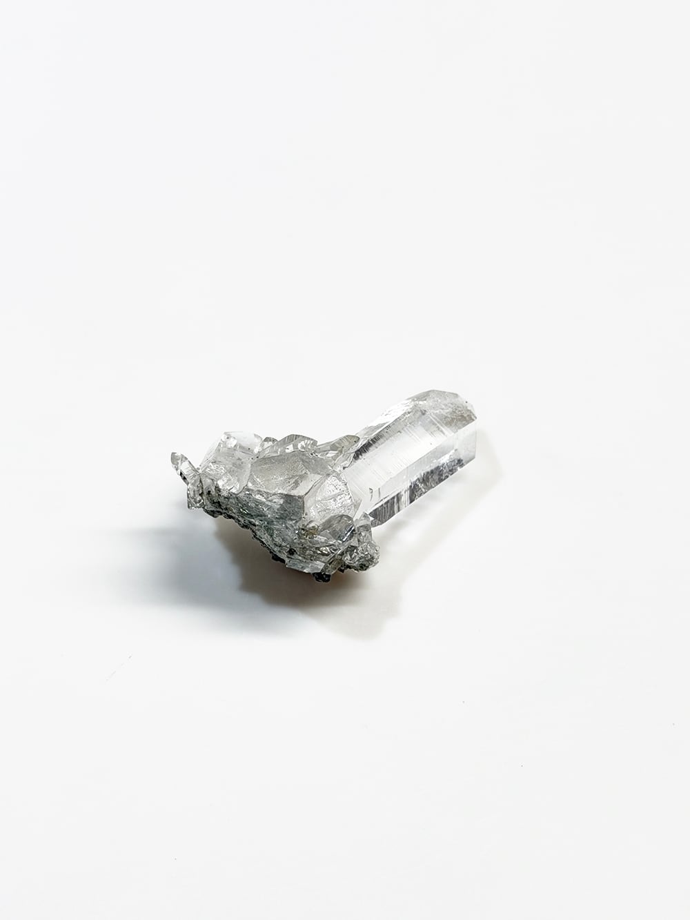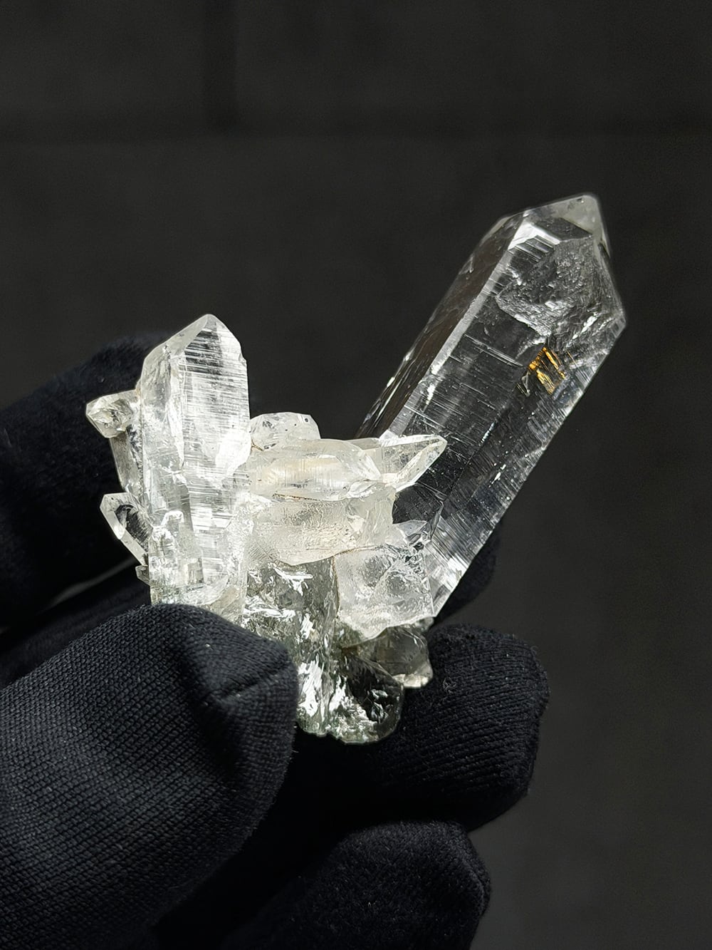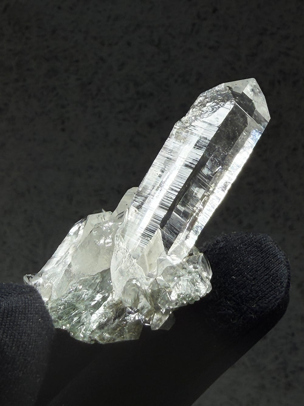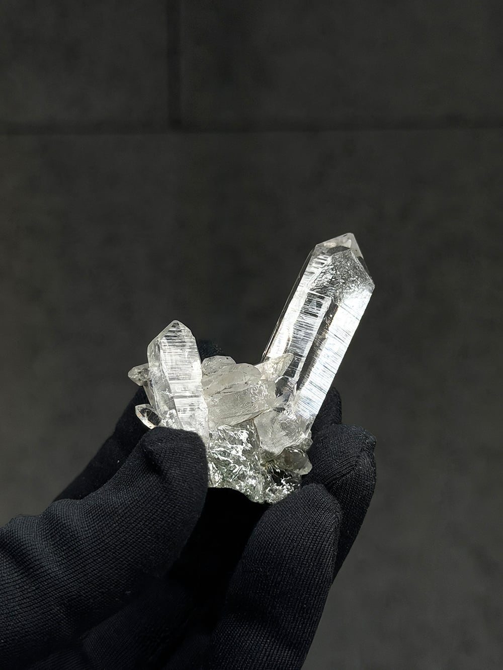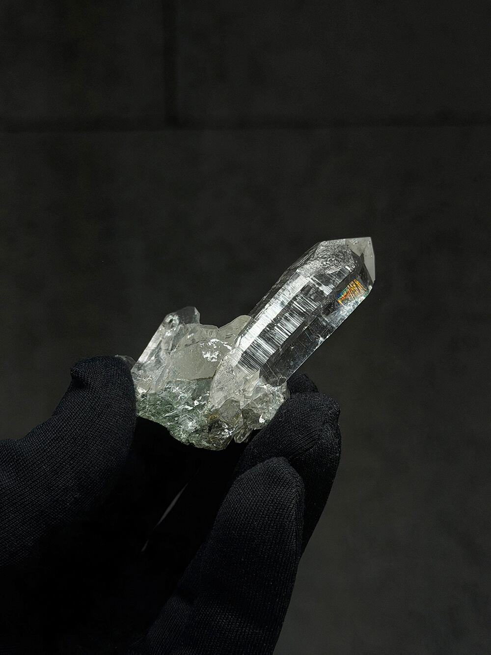 ため息が出るほどに美しいクォーツクラスター。その透明度と照り、クローライトの美しさはマニハールの特徴そのものです。指先に持って眺めるのにちょうど良い大きさと、どの面を見ても輝くクォーツ。とても素晴らしい一点です。