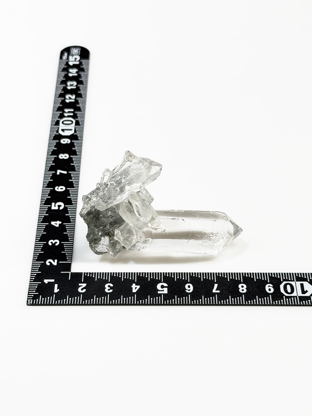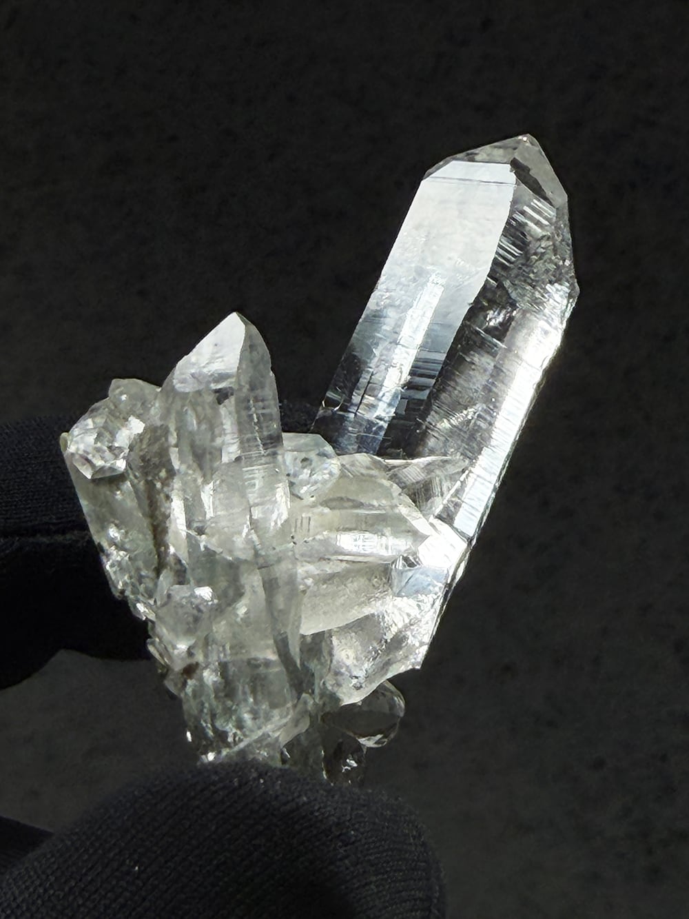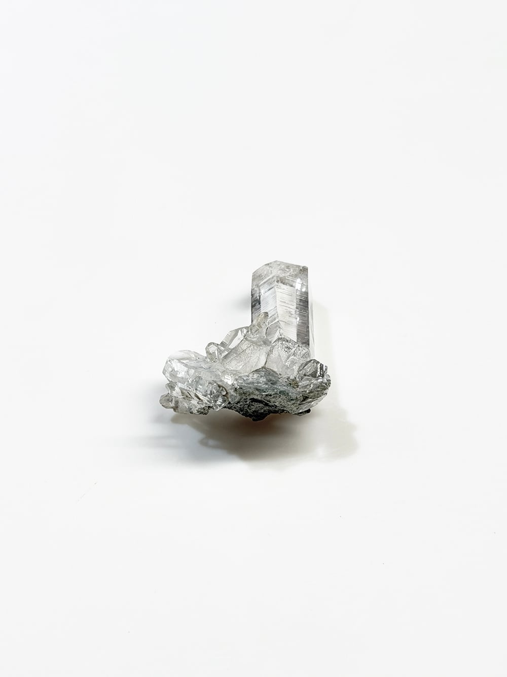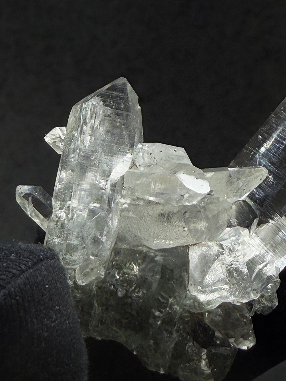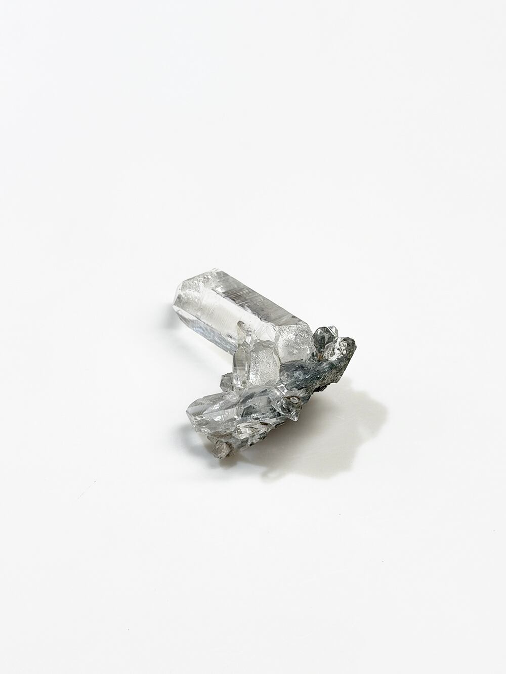 ため息が出るほどに美しいクォーツクラスター。その透明度と照り、クローライトの美しさはマニハールの特徴そのものです。指先に持って眺めるのにちょうど良い大きさと、どの面を見ても輝くクォーツ。とても素晴らしい一点です。