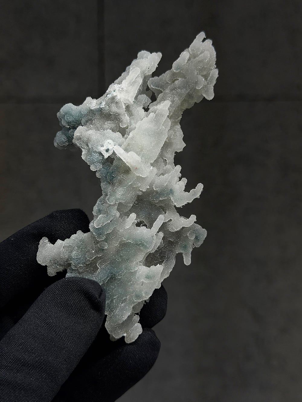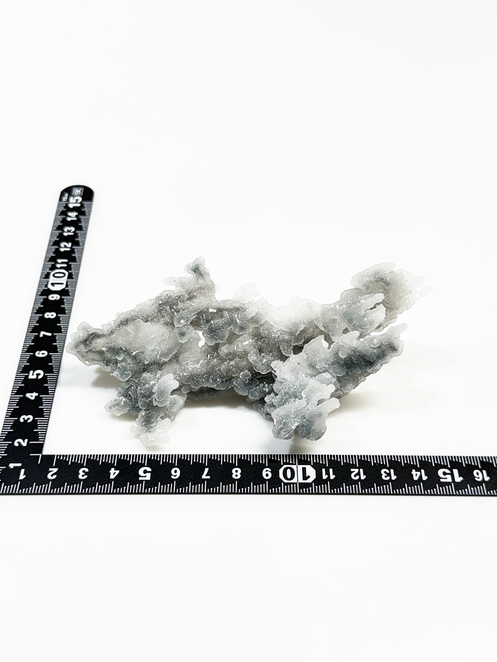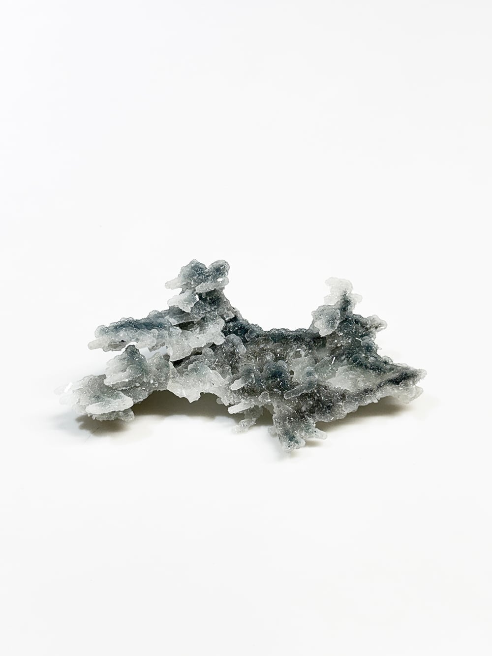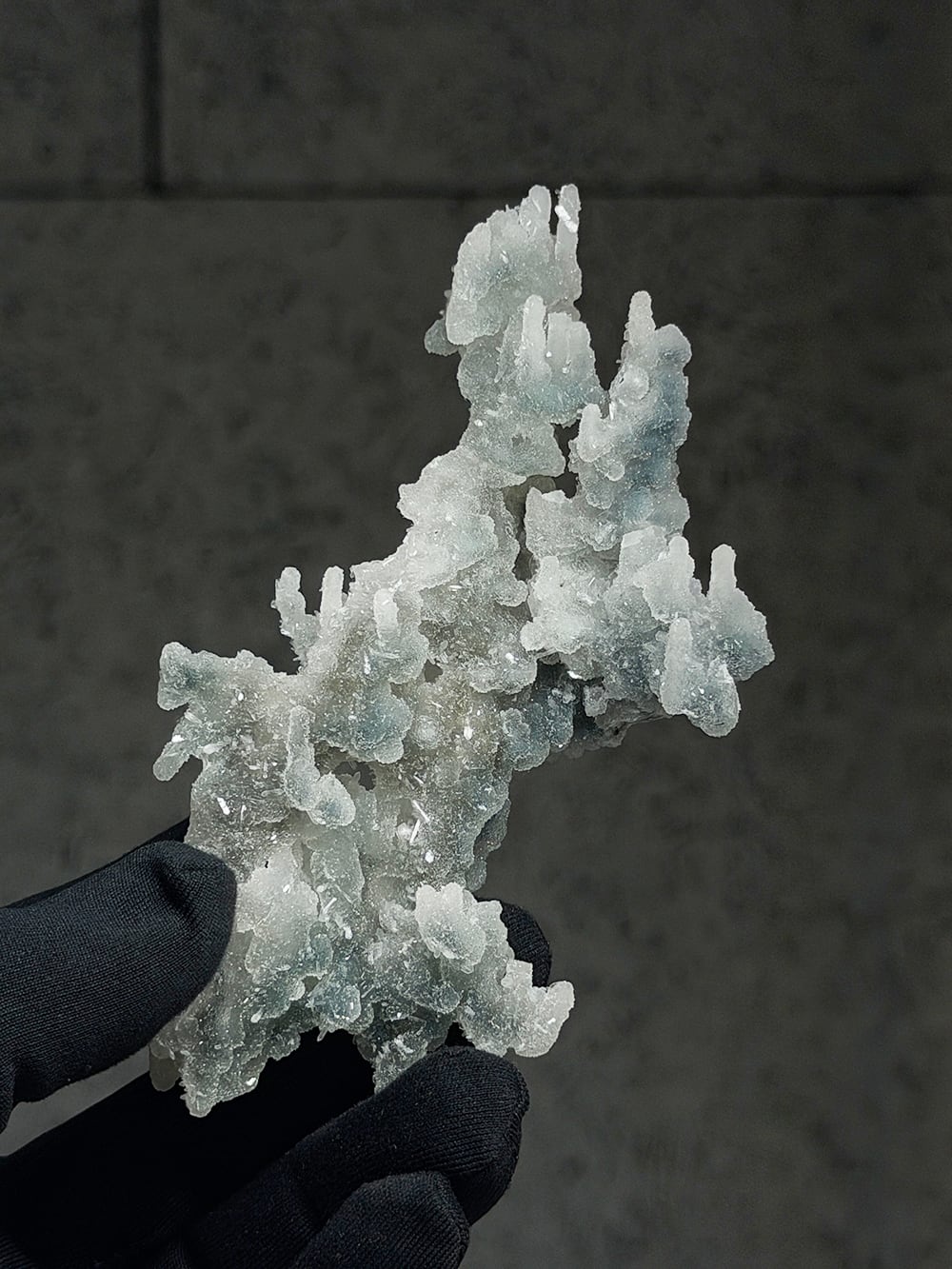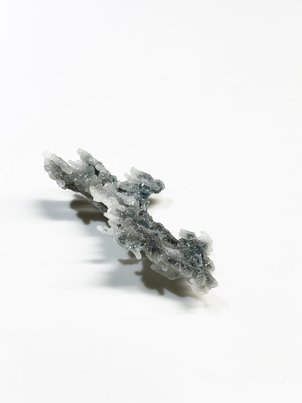 珊瑚状に成長したブルーカルセドニー。微細な石英の集合による立体構造と、淡く透ける色調が特徴的な個体です。自然が生み出した有機的な形状を楽しめます。カルセドニー コーラルは、微細な石英(カルセドニー)が集合し、珊瑚(コーラル)のような有機的な形状を形成した鉱物です。人工的な造形では再現できない、自然由来の有機的フォルムと静かな存在感。鉱物標本としてはもちろん、オブジェとして空間に置いても成立する個体です。
