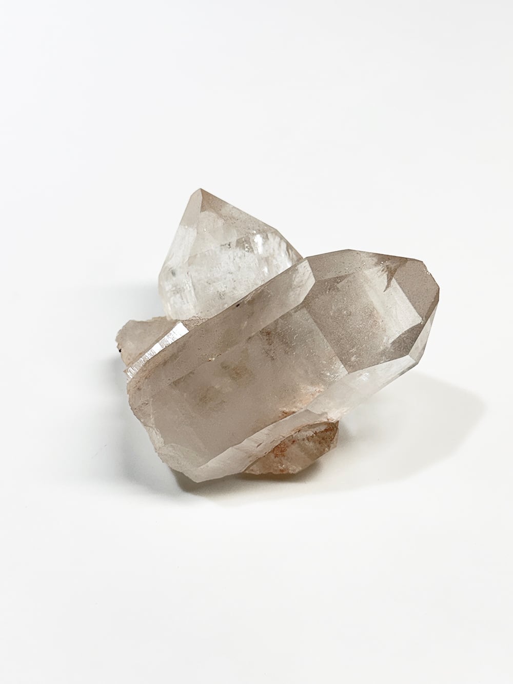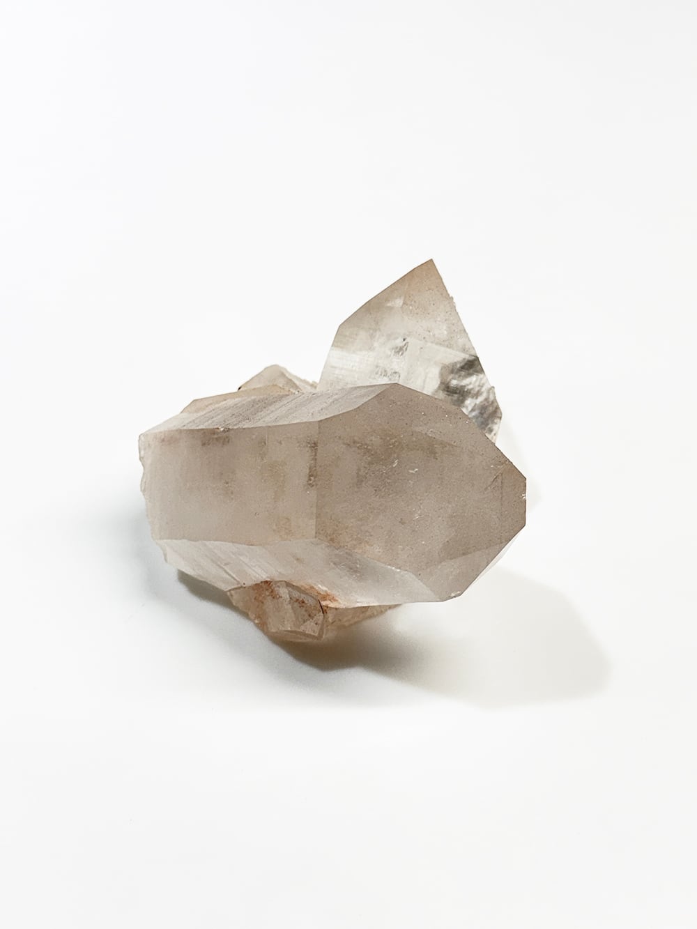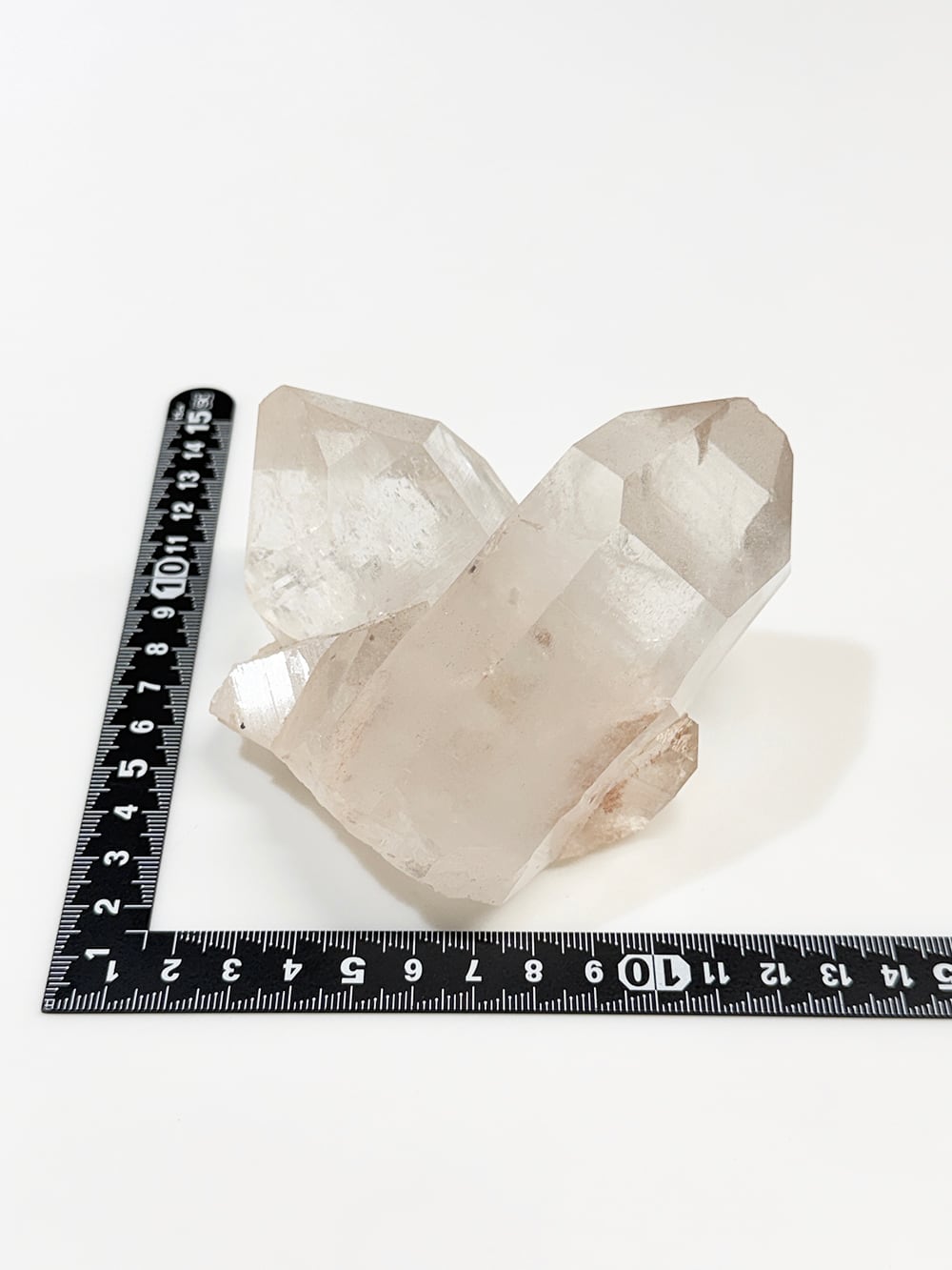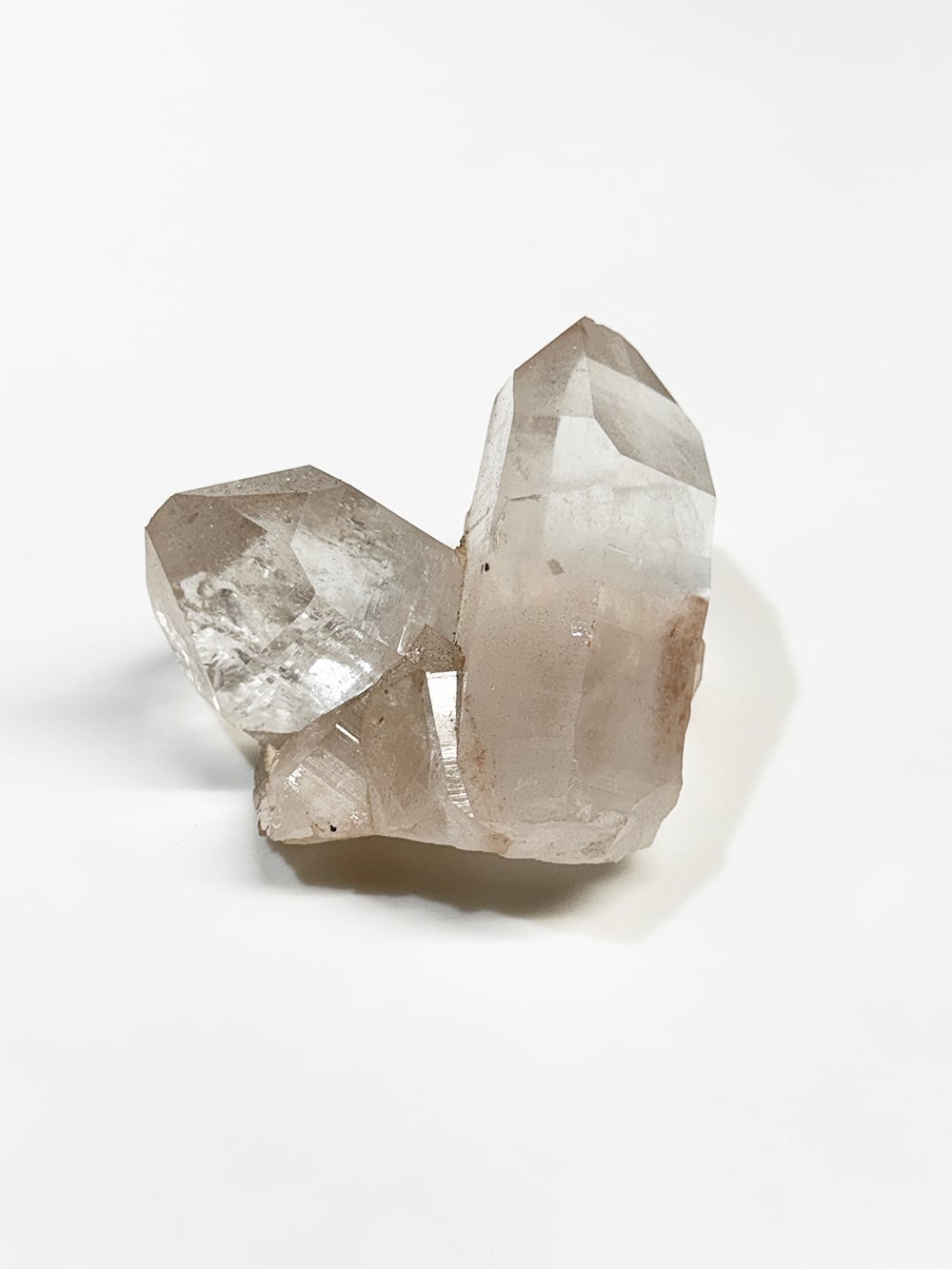 見る角度によってハート型に見えるマニカランのクォーツクラスター。マニカランの特徴である淡いピンクカラーが美しく、照りの良い面とマットな面とのコントラストも良い表情を作っています。それなりのボリューム感がありますが、安定して置くことができるのでインテリアとしても飾りやすい一点。