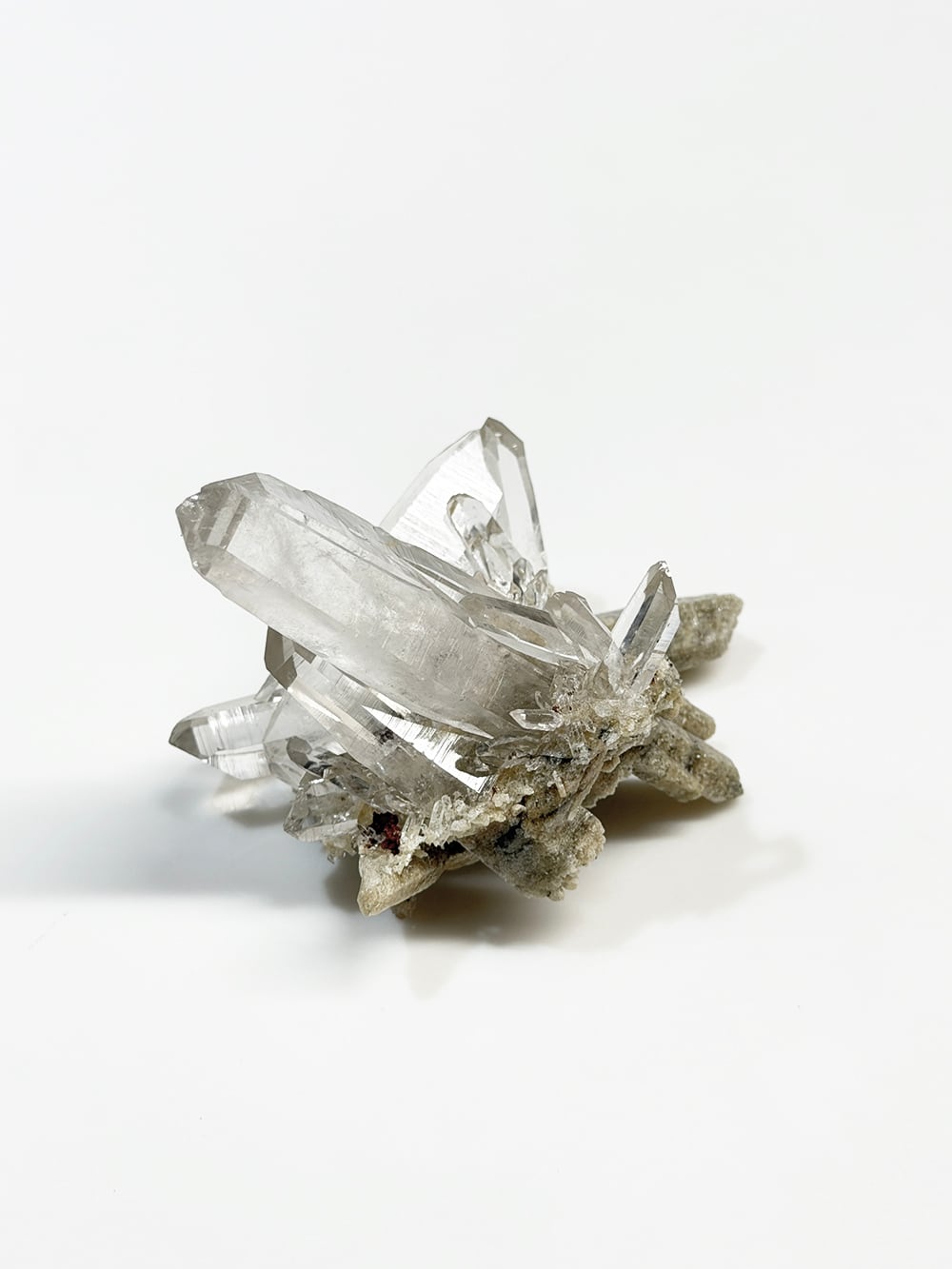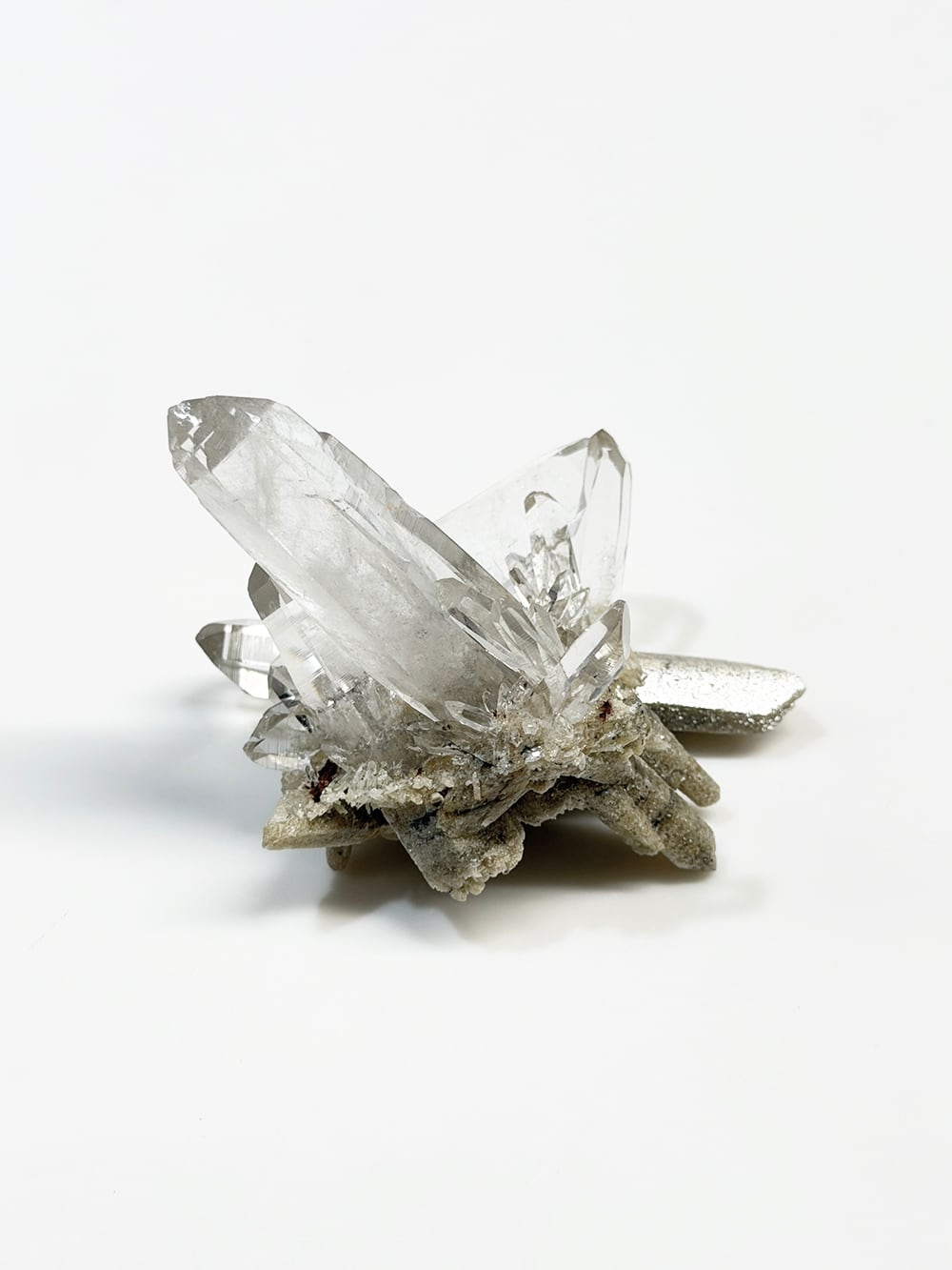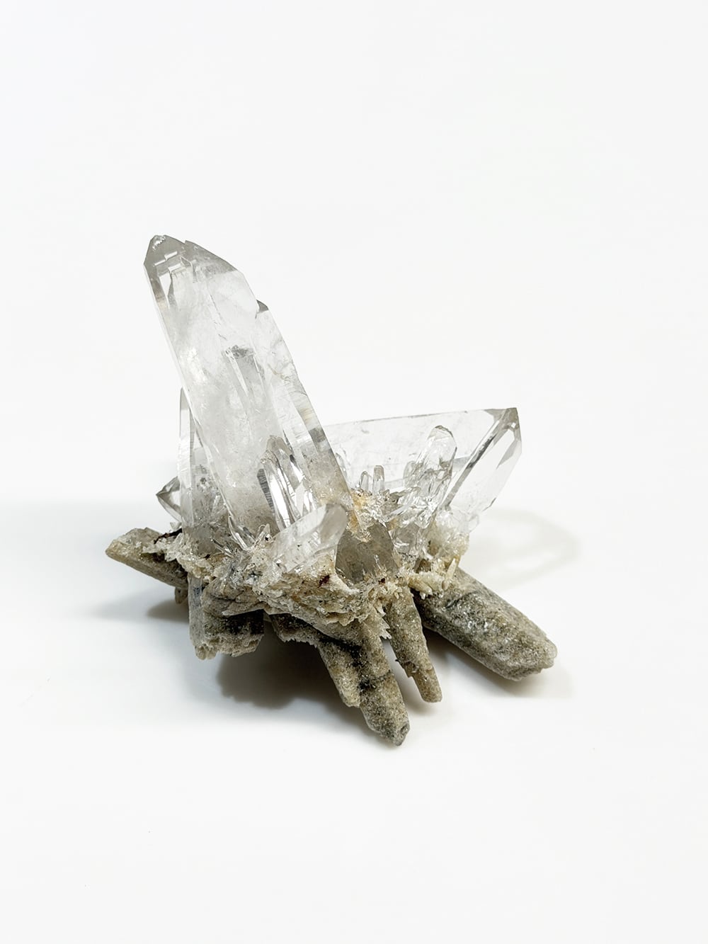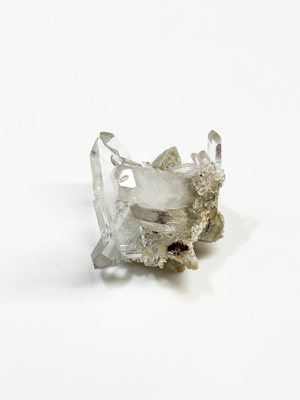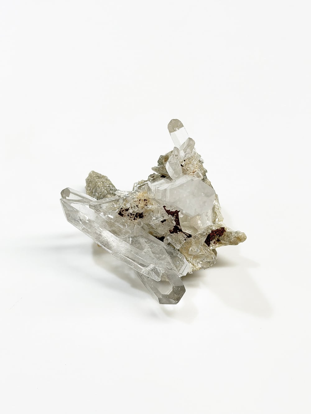 とても特徴的なシェイプのクラスター。両剣水晶になっているのですが、あるラインを境にベージュのクローライトを内包して生成されており、まるで引き抜かれたかのような表情をしています。水晶の透明度や照りも良く、鑑賞価値の高いユニークな一点。インドはPeda daarという土地から産出されたそうですが、地図には記載されていない土地のようで、まだインドにはそのような村や地名が多く存在しています。