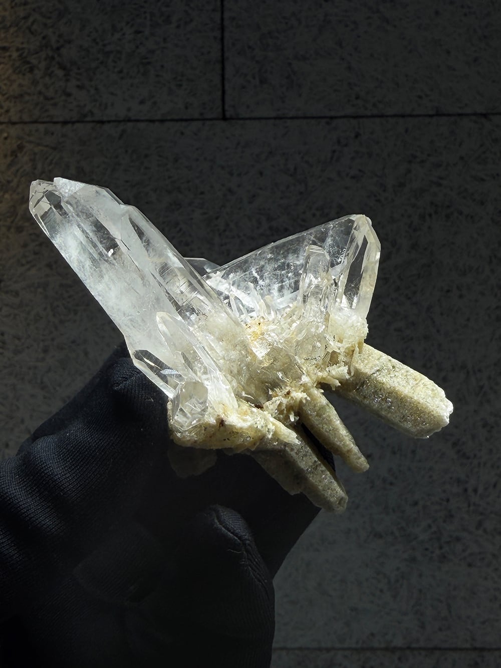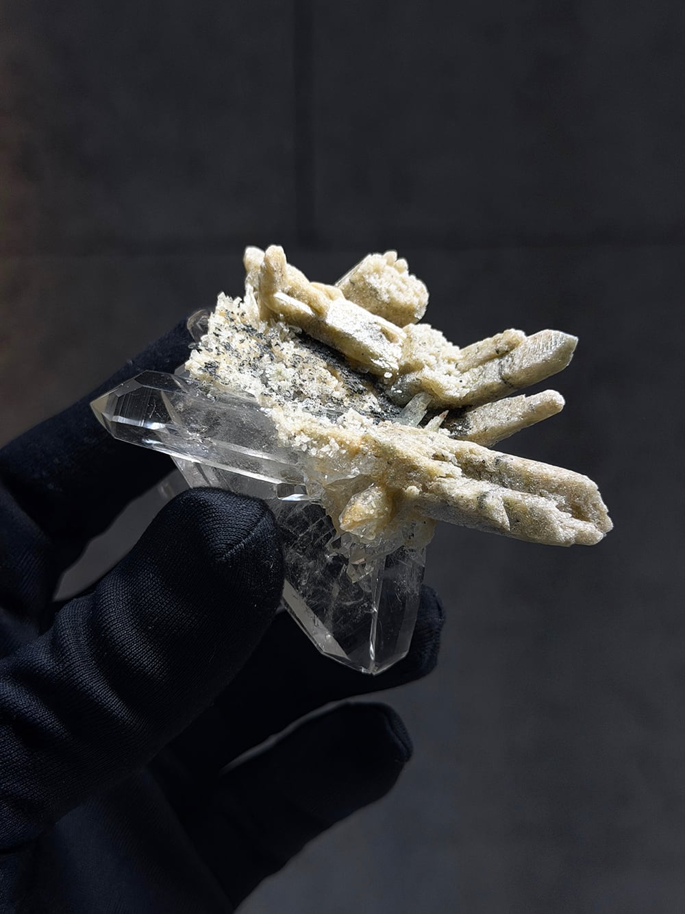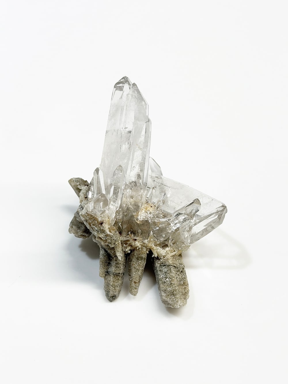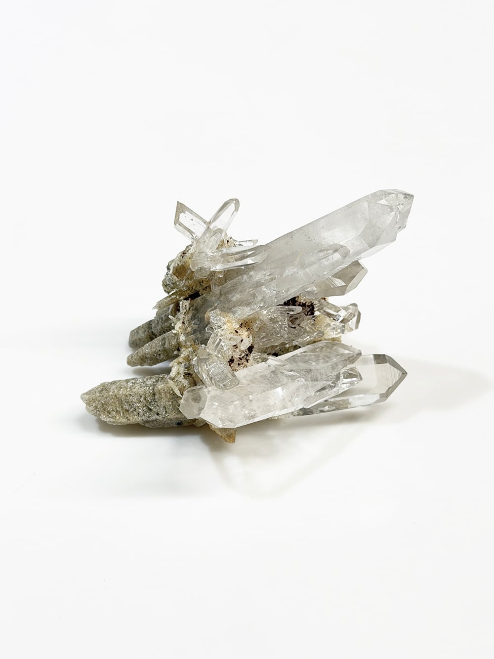 とても特徴的なシェイプのクラスター。両剣水晶になっているのですが、あるラインを境にベージュのクローライトを内包して生成されており、まるで引き抜かれたかのような表情をしています。水晶の透明度や照りも良く、鑑賞価値の高いユニークな一点。インドはPeda daarという土地から産出されたそうですが、地図には記載されていない土地のようで、まだインドにはそのような村や地名が多く存在しています。