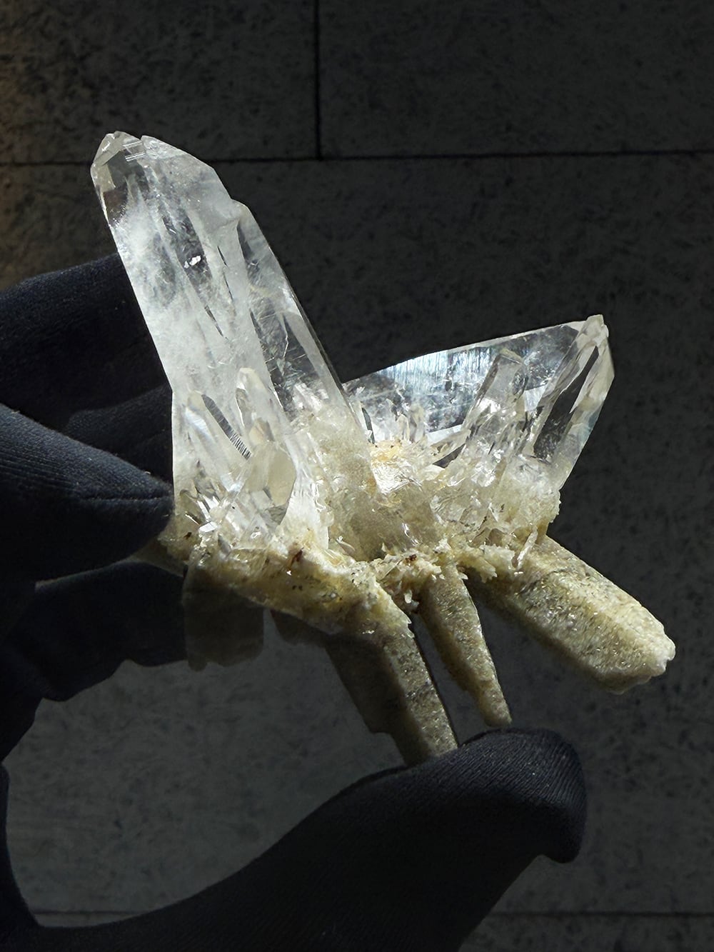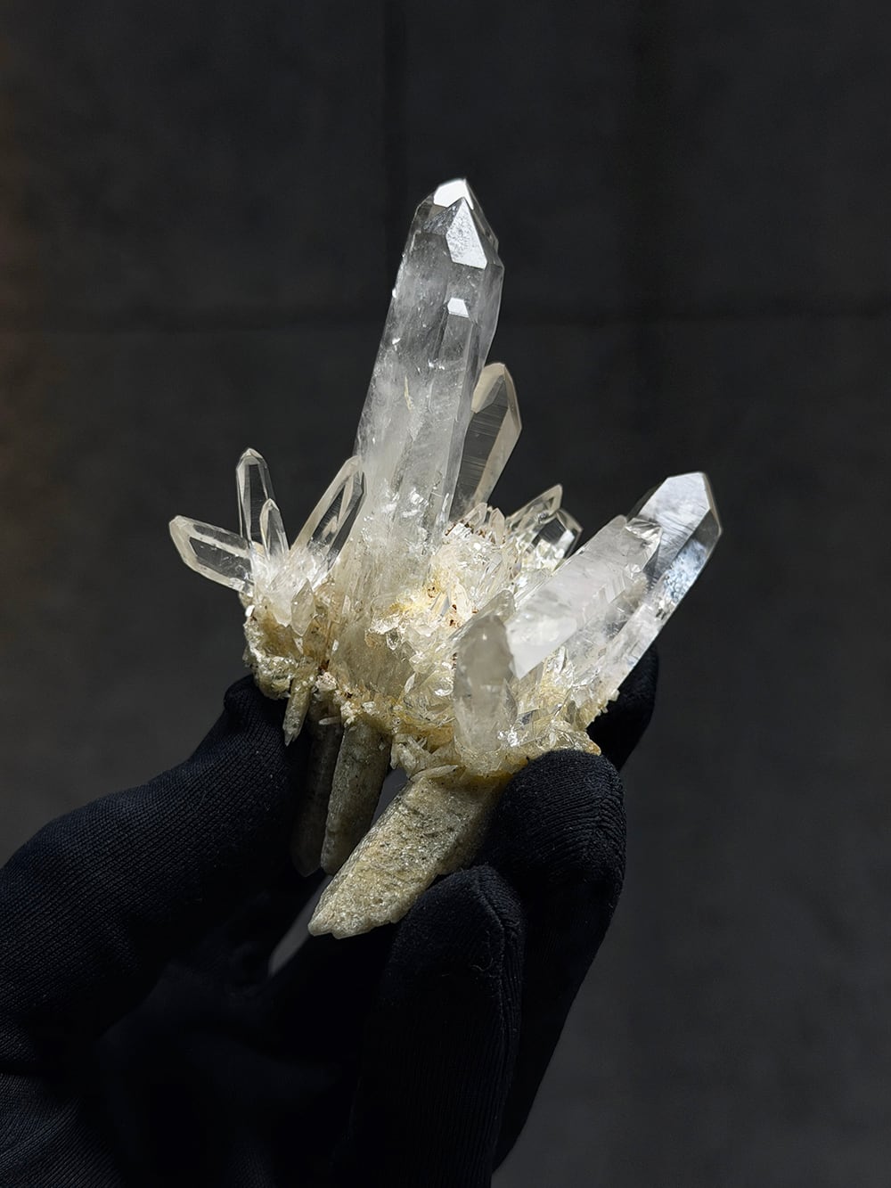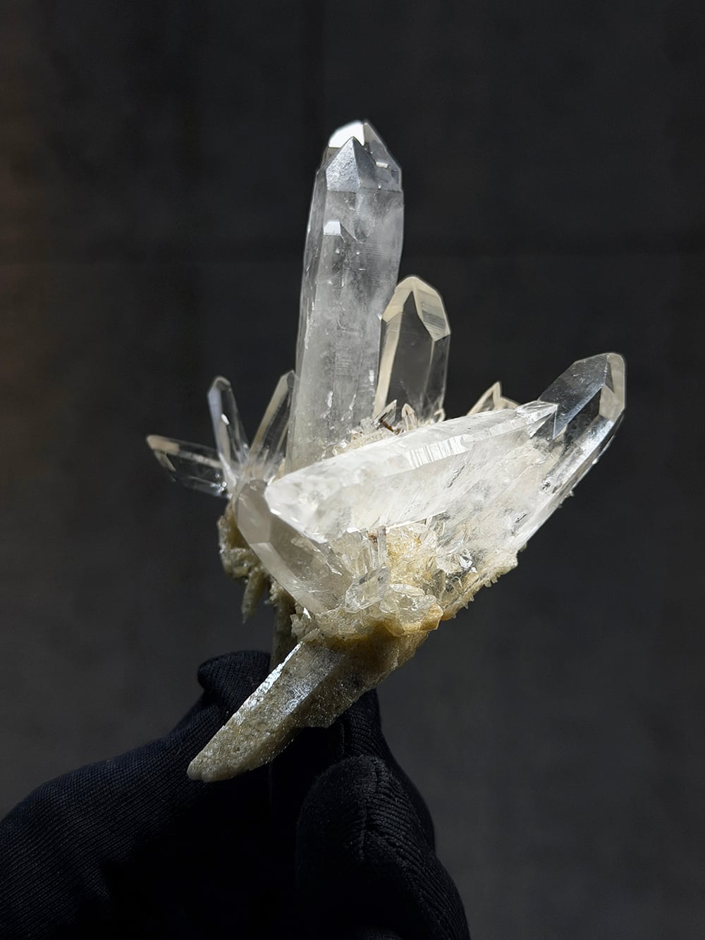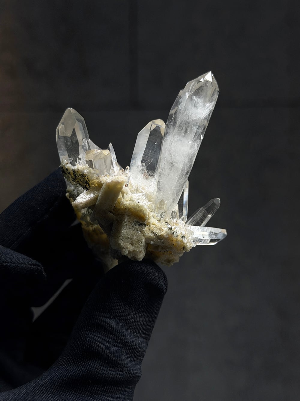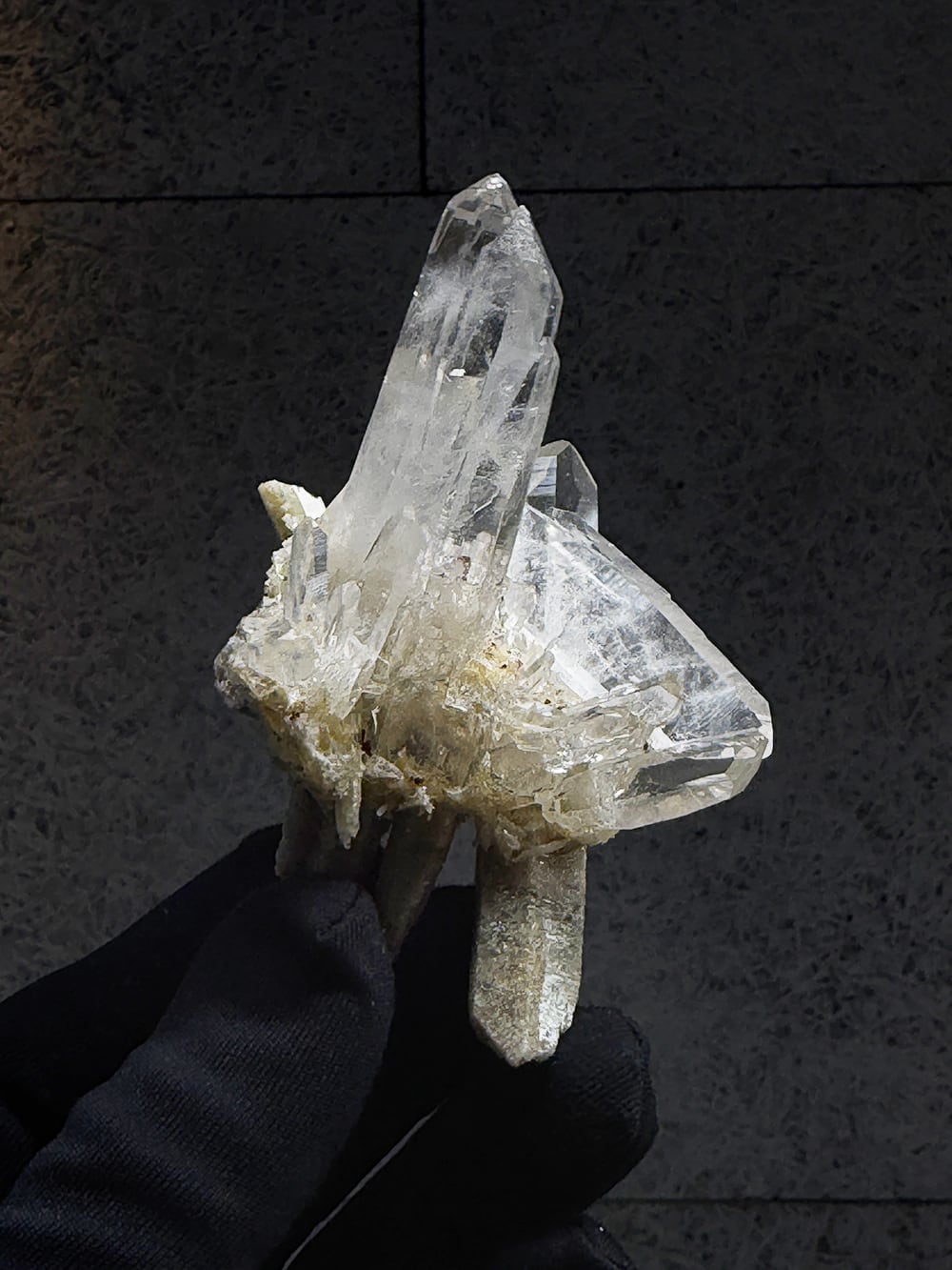 とても特徴的なシェイプのクラスター。両剣水晶になっているのですが、あるラインを境にベージュのクローライトを内包して生成されており、まるで引き抜かれたかのような表情をしています。水晶の透明度や照りも良く、鑑賞価値の高いユニークな一点。インドはPeda daarという土地から産出されたそうですが、地図には記載されていない土地のようで、まだインドにはそのような村や地名が多く存在しています。