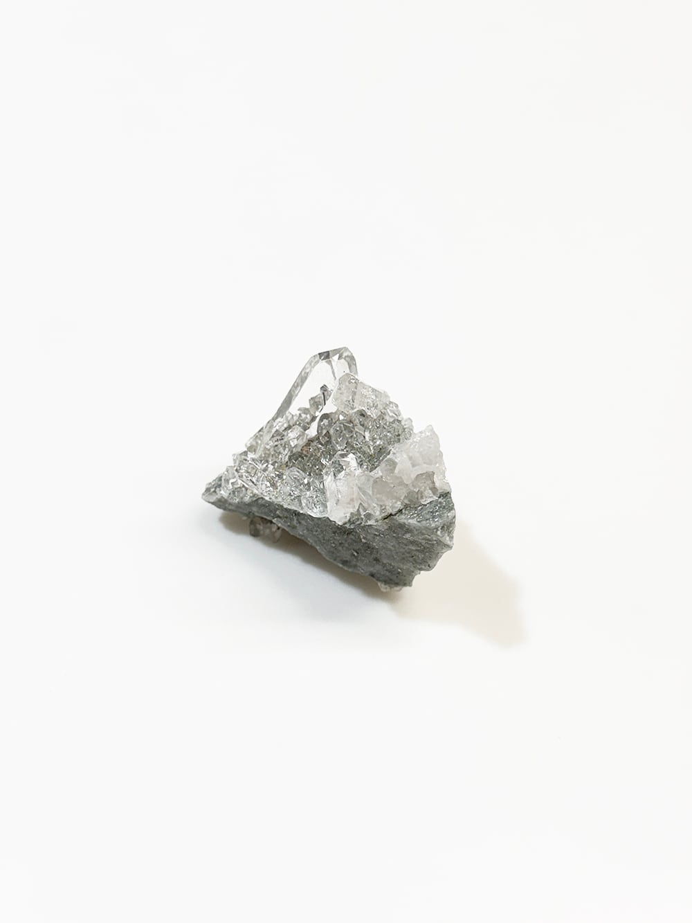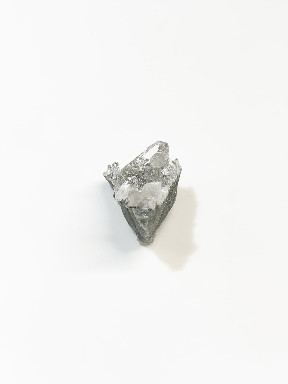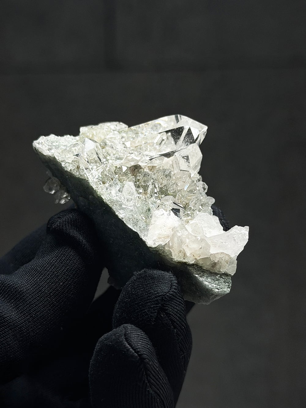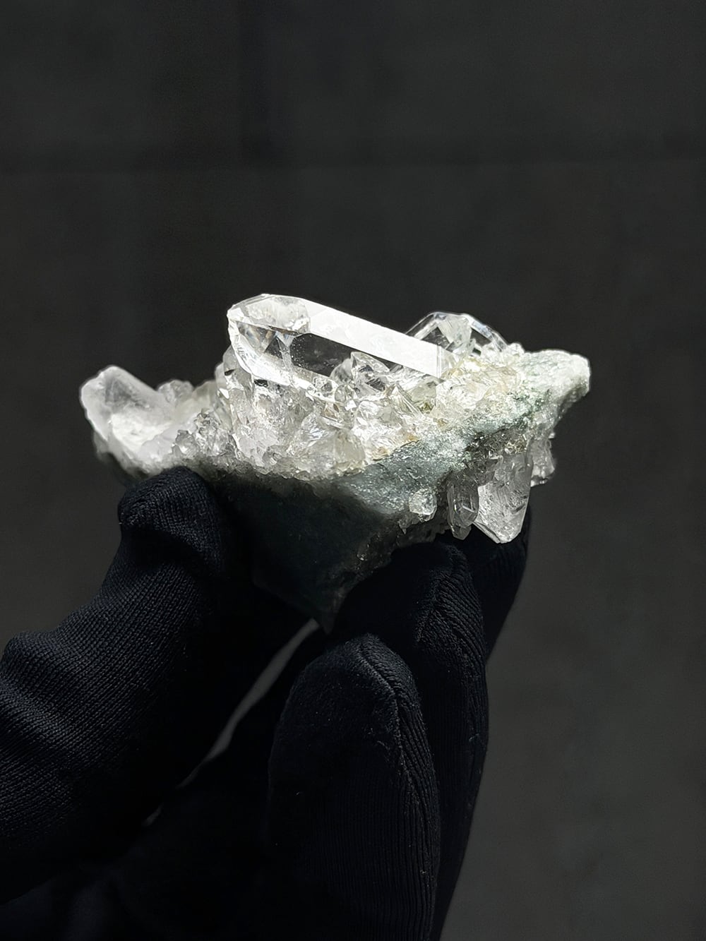 指先サイズのマニハールクォーツクラスター。素晴らしいクォーツの透明度と照り、クローライトの美しいグリーン、そして小さくても虹はしっかりと見ることができます。色々な角度で眺めても美しく、安定も良く飾りやすい一点です。