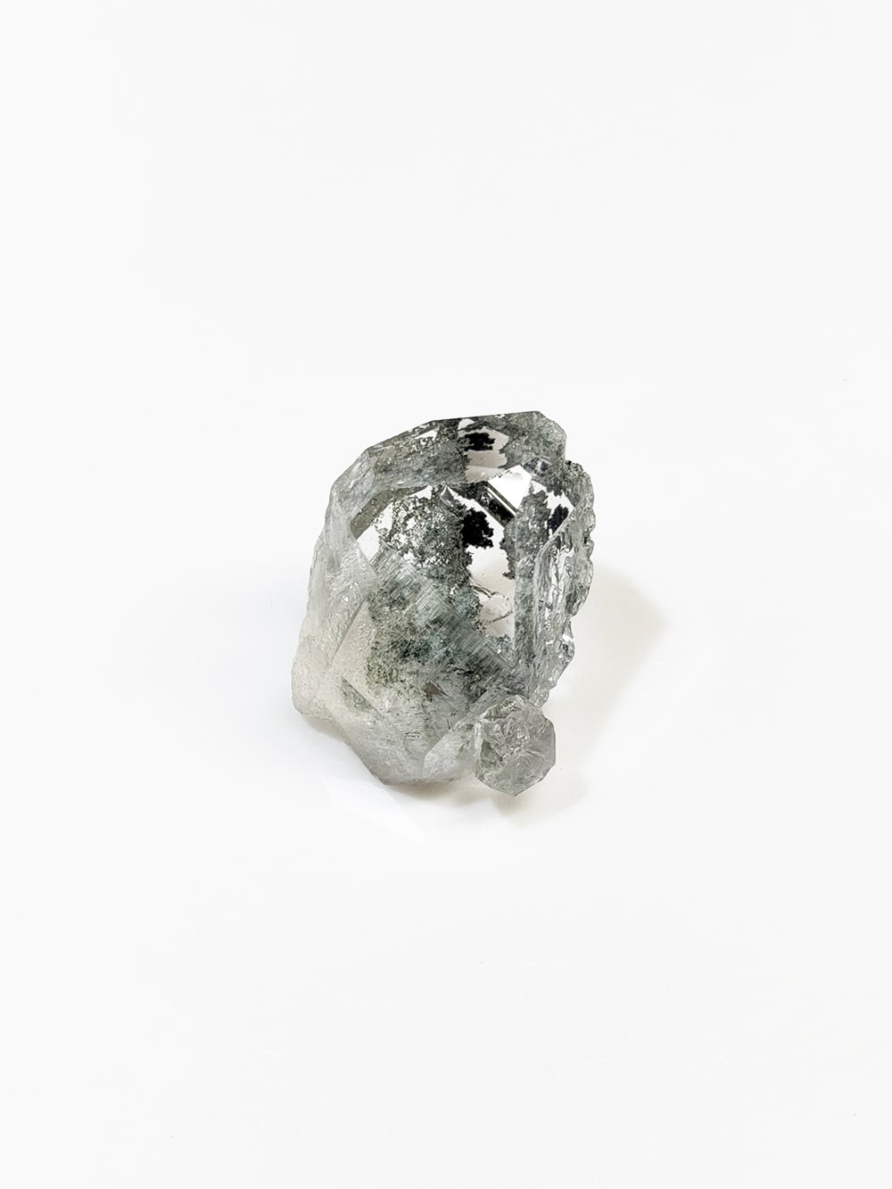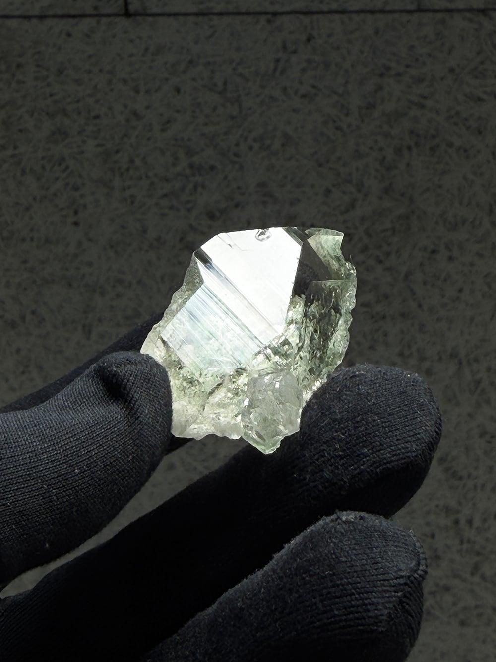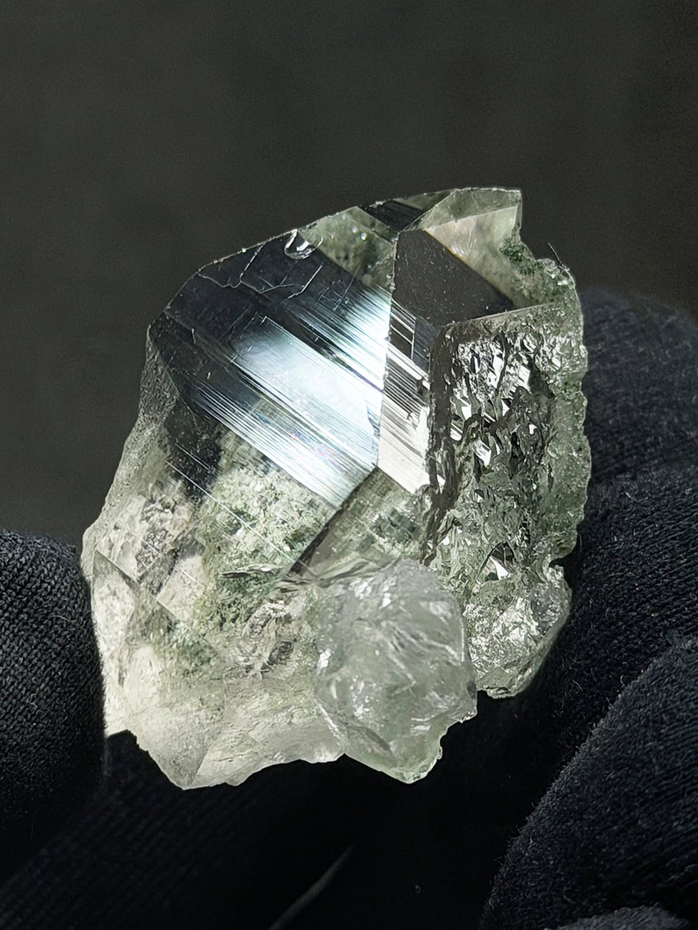 指先サイズの小さなマニハールクォーツ。素晴らしいクォーツの透明度と照り、その透明度の高いクォーツの先に見えるクローライトの美しいグリーンが、素晴らしい景色を見せてくれている一点です。