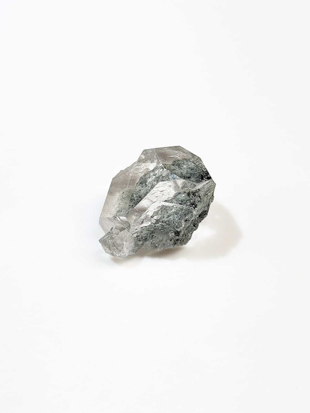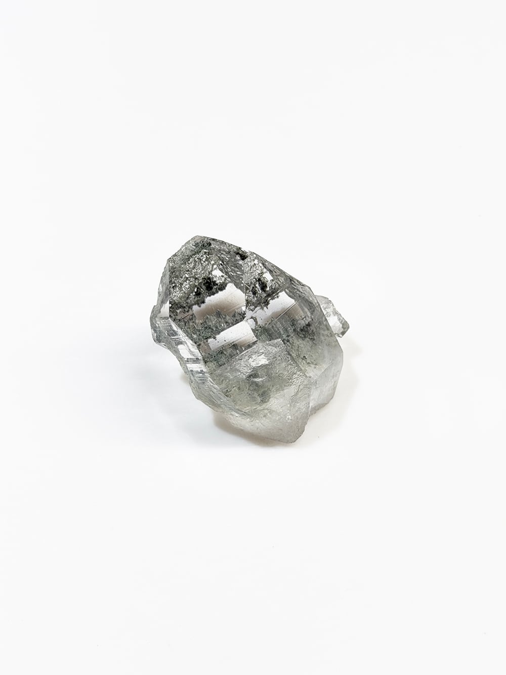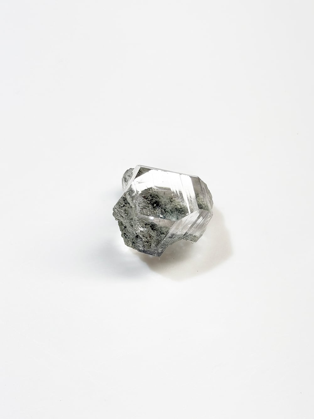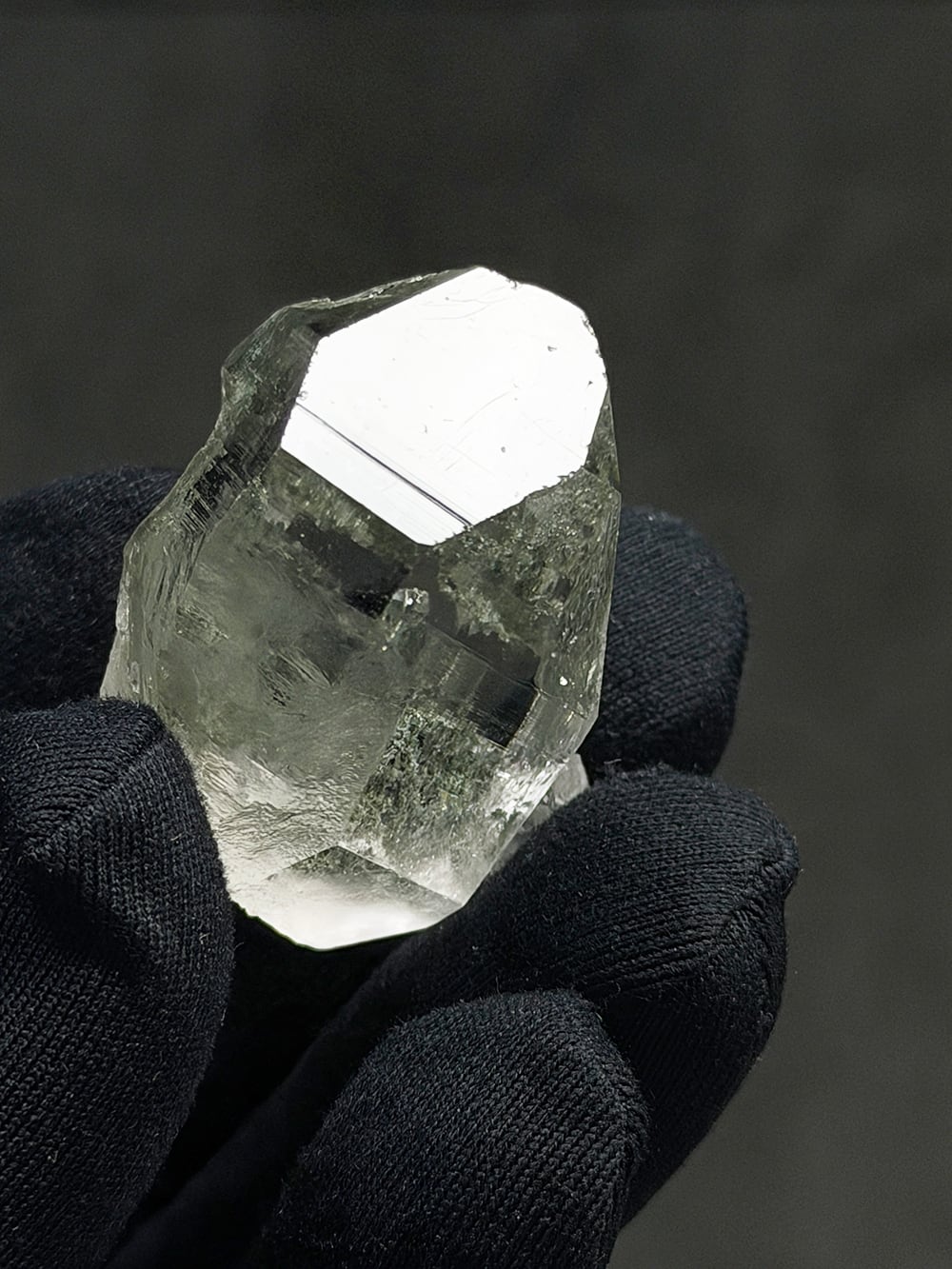 指先サイズの小さなマニハールクォーツ。素晴らしいクォーツの透明度と照り、その透明度の高いクォーツの先に見えるクローライトの美しいグリーンが、素晴らしい景色を見せてくれている一点です。