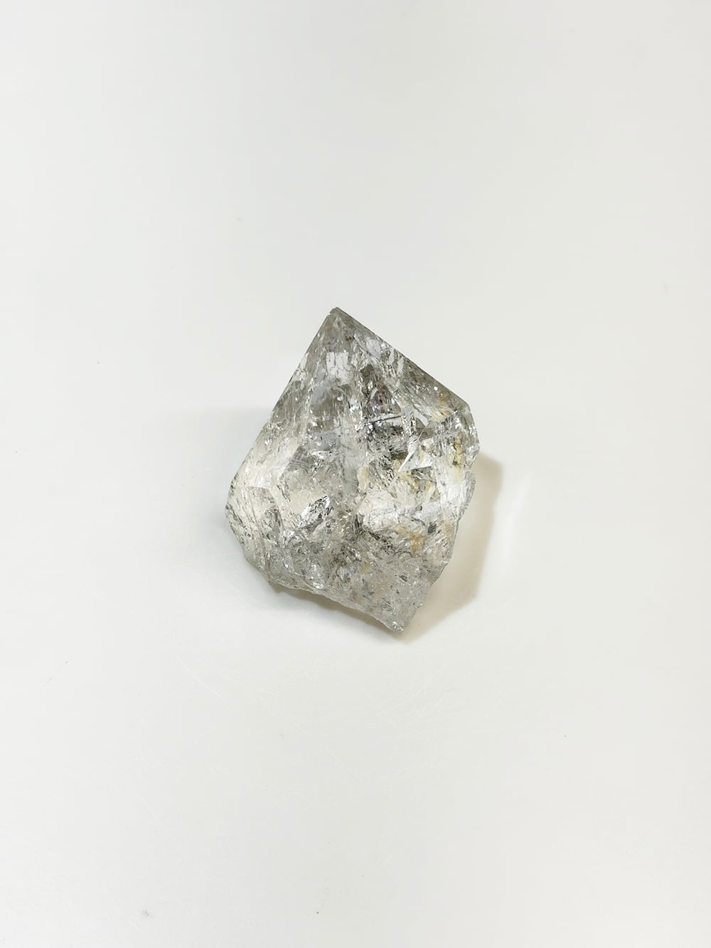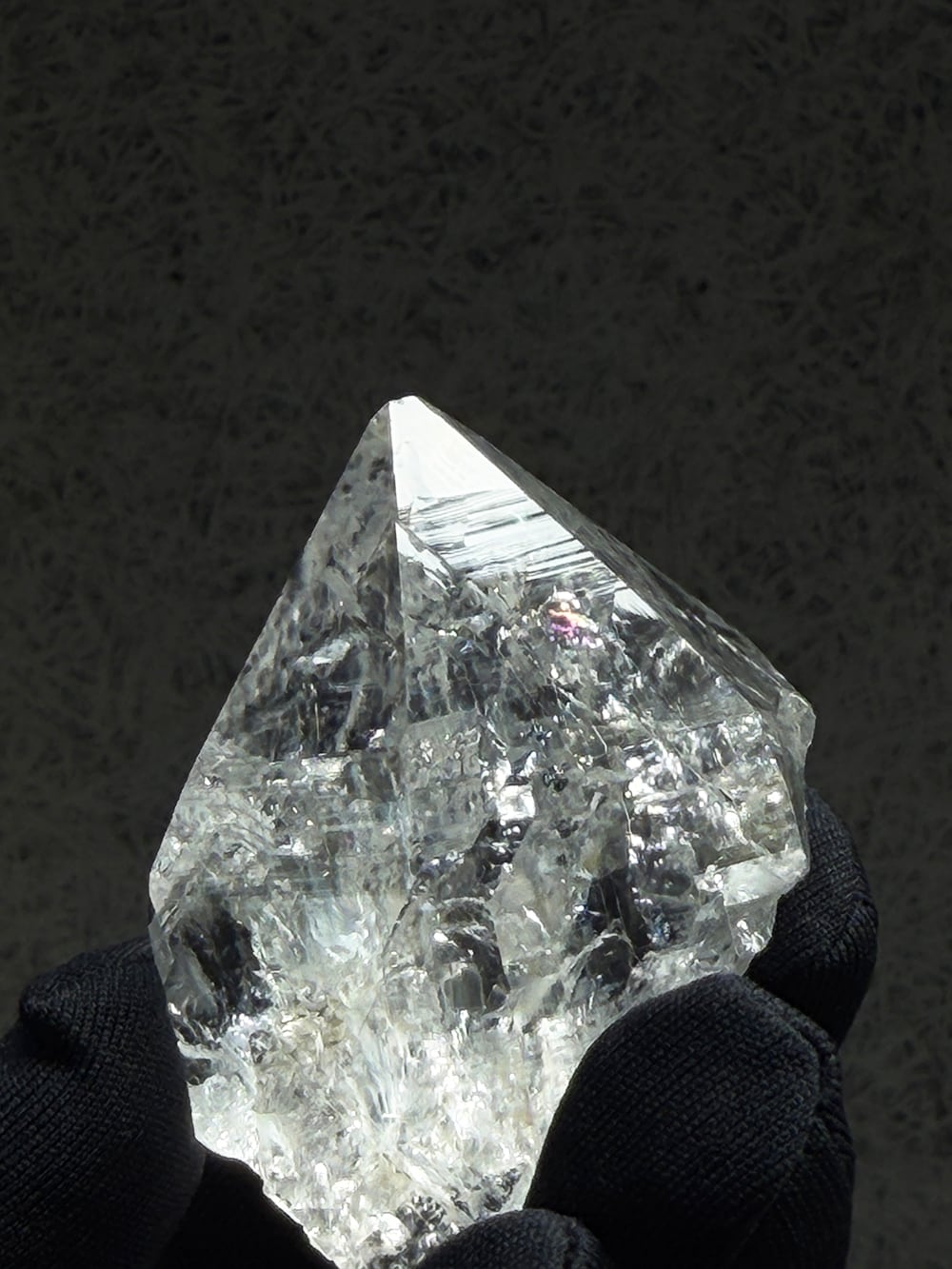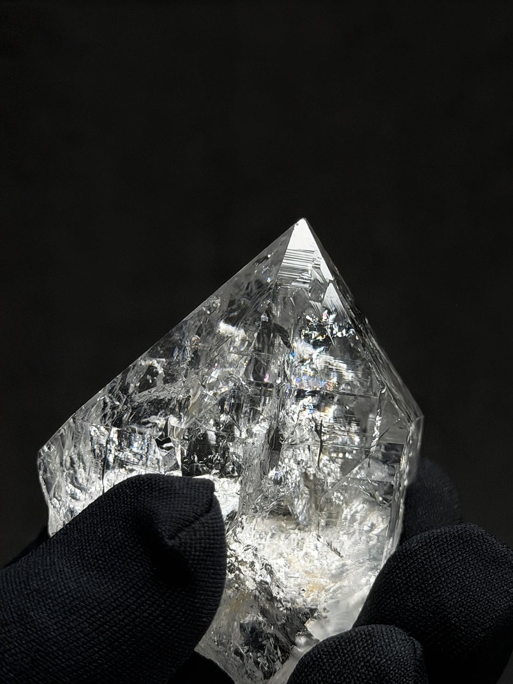 見惚れてしまうほど美しいポイントクォーツ。その透明度と照りに目を奪われます。画像でもハッキリとわかるほど虹が見えますが、肉眼で見るとさらに多くの美しい虹を眺めることができます。置いて飾っても、持って眺めても、その輝きを感じられるクォーツです。