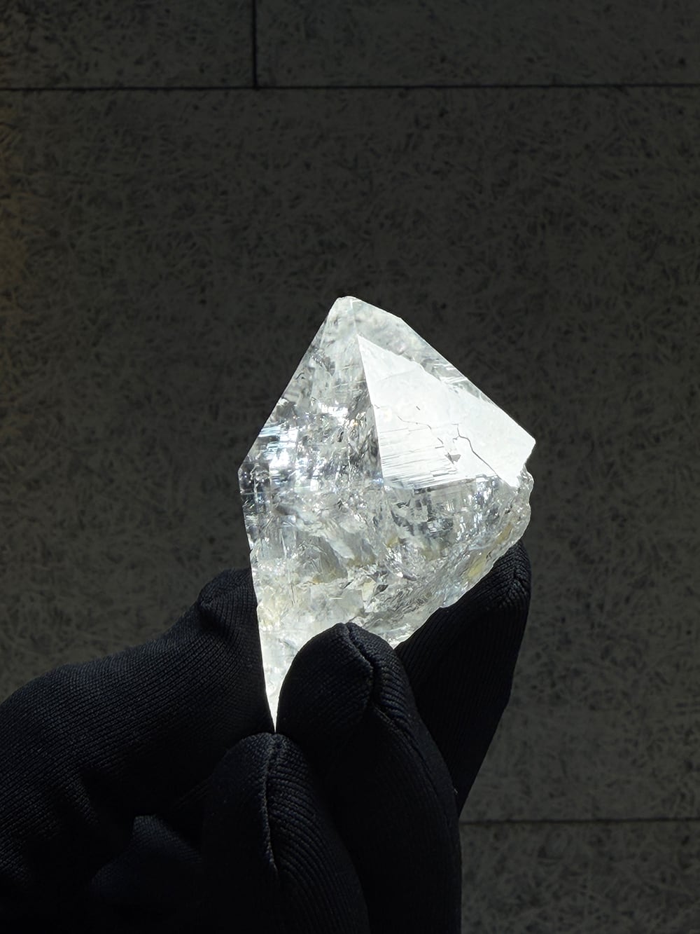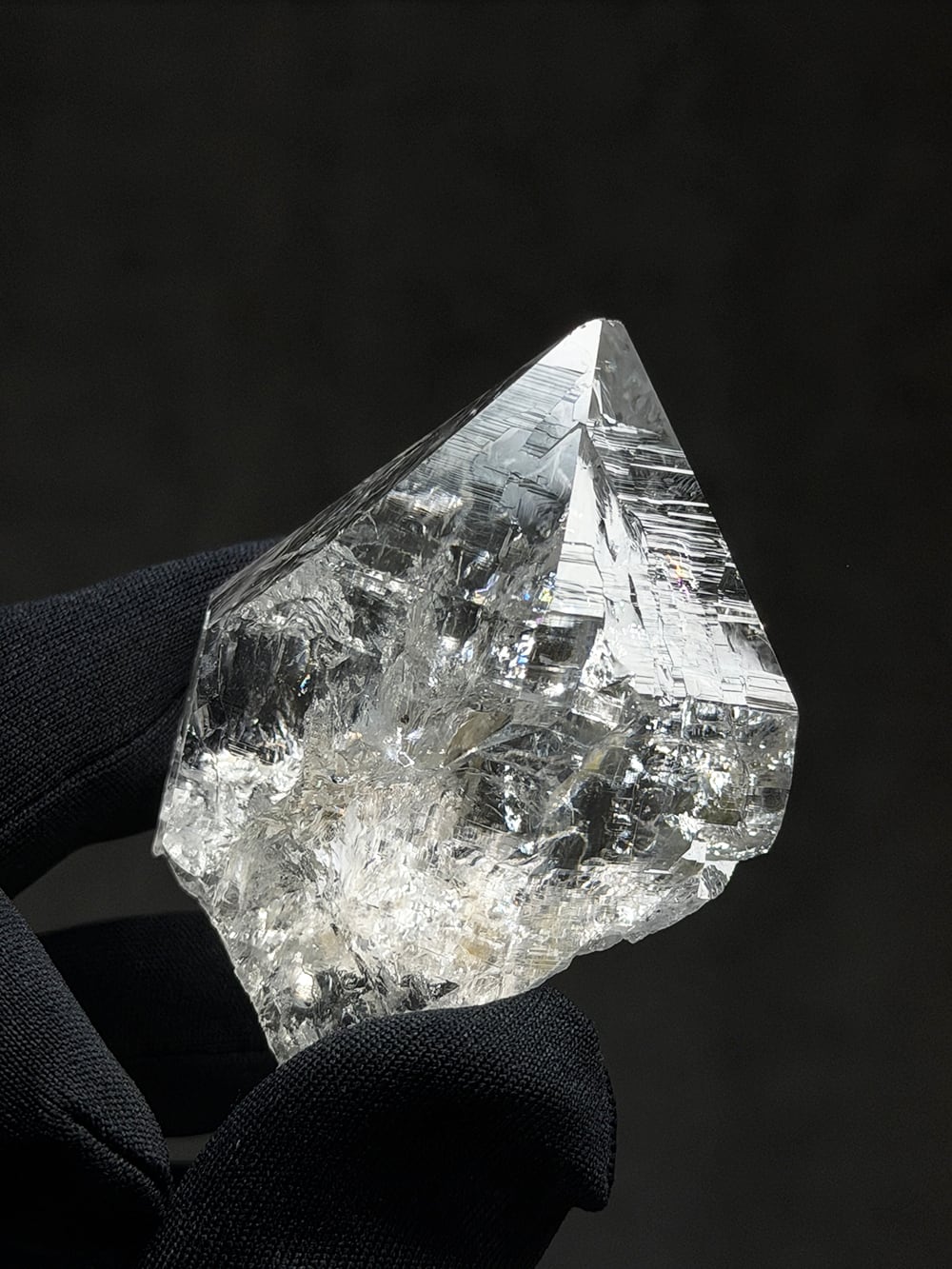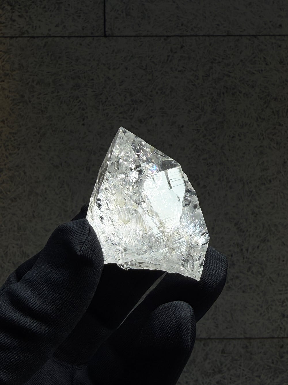 見惚れてしまうほど美しいポイントクォーツ。その透明度と照りに目を奪われます。画像でもハッキリとわかるほど虹が見えますが、肉眼で見るとさらに多くの美しい虹を眺めることができます。置いて飾っても、持って眺めても、その輝きを感じられるクォーツです。