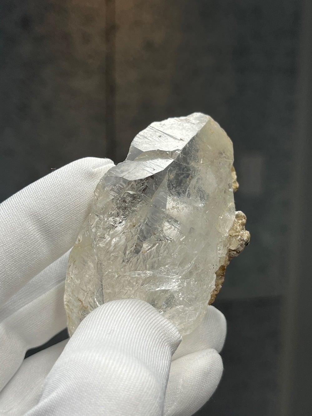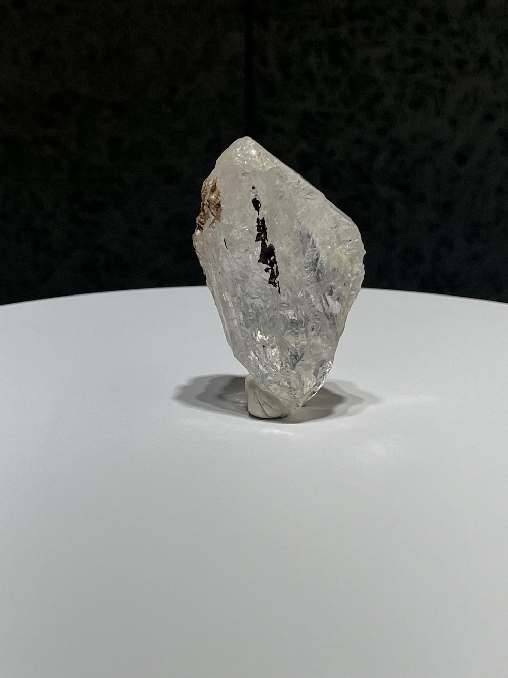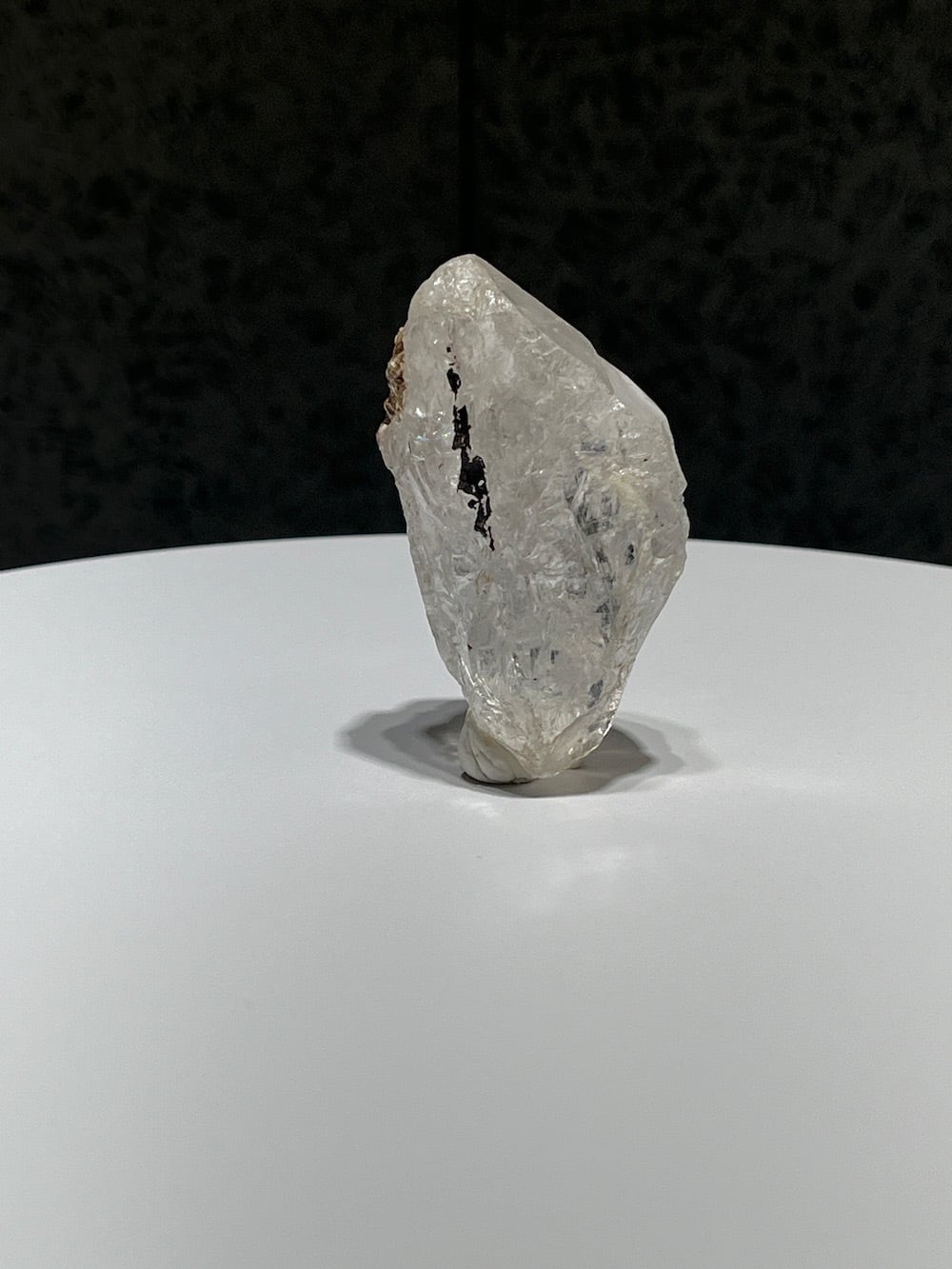 ヒマラヤの北部地域、パキスタン産のヒマラヤクォーツの原石。全面に虹を映すような光沢を持った、とても美しいクォーツです。水に溶け始めた氷山のような表面は、セルフヒールドと呼ばれている現象で、自然界で何かの衝撃で欠け落ちた水晶面から再結晶化するために、もう一度成長し始めた部分です。パキッとした面の光沢も良いのですが、とても柔らかい感触で光沢と虹、そして握りしめてもとても優しい感触のクォーツです。一部残っているモスコバイトの輝きも見逃せません。