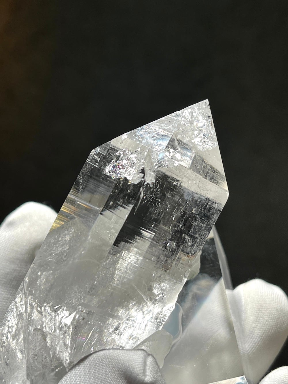 インドのガルサ渓谷、標高5400mのクル地方の奥にあるマニハール産のクォーツ。マニハールで産出されるヒマラヤ水晶は、水晶の中でもトップクラスの品質とされており、密度が高く、透明度と光沢が特に美しいことでも知られます。特徴として共生しているクローライト(緑泥石)は、このマニハールではモスグリーンの濃い色をしており、透明度と相まってより美しさを増しています。全体的にエッジも綺麗に残っており、ポイントの先に内包したクラックには細かく美しい虹をたくさん映しています。他に類を見ない光沢と透明感、その素晴らしさを感じられるマニハール産のヒマラヤクォーツです。