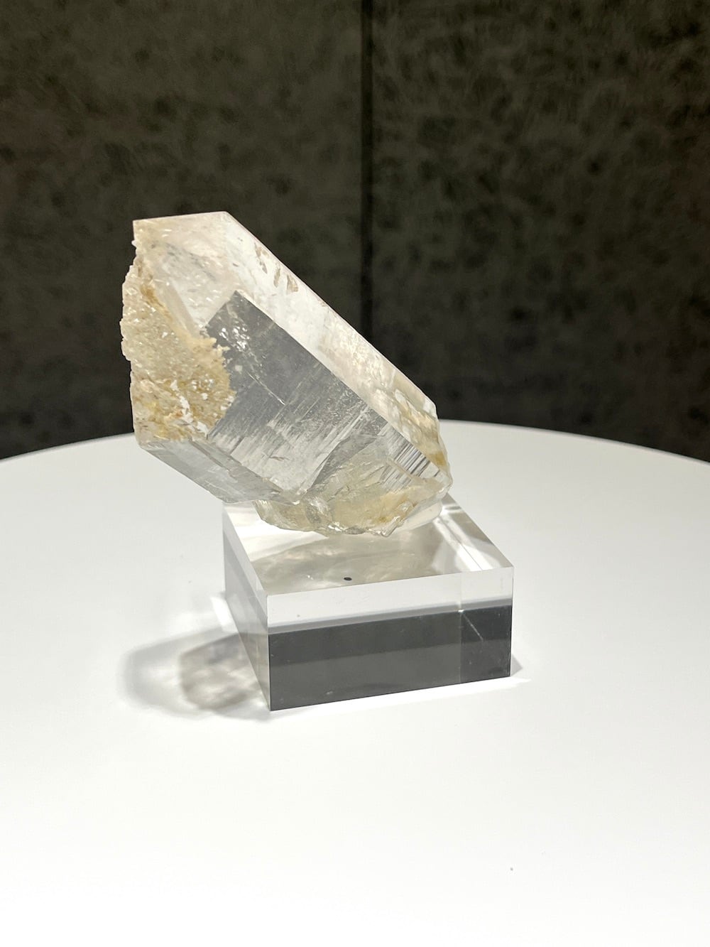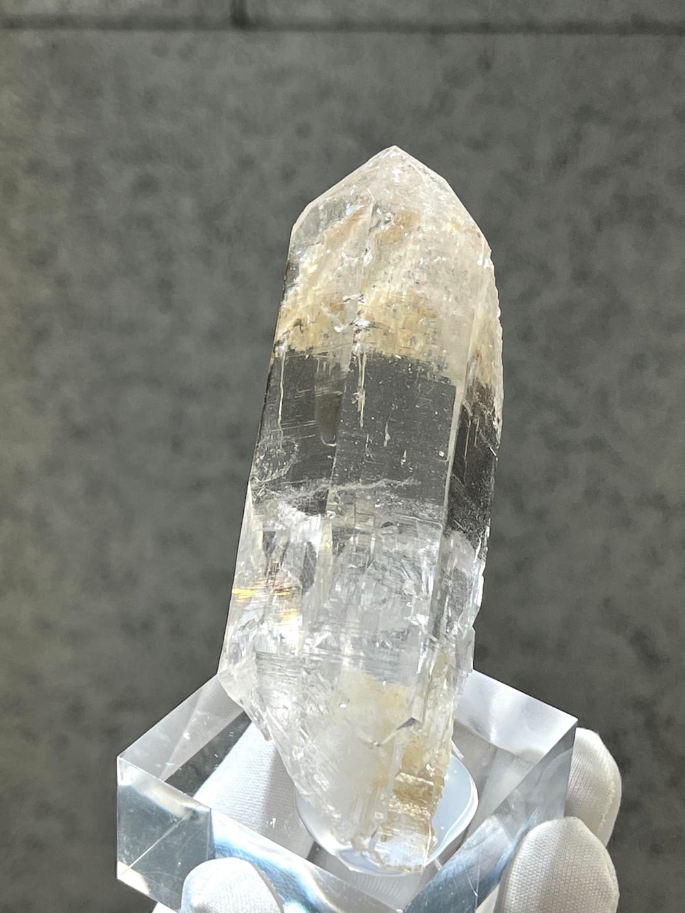 インド産のヒマラヤクォーツの原石。この単結晶はシャープなシルエットを持ちながら、上の部分を他の鉱石(シルバーマイカ)に侵食された跡があり、そのシルバーマイカがクォーツの上で輝いています。エッジも綺麗に残っており、とてもヒマラヤ産らしさのある美しい単結晶です。